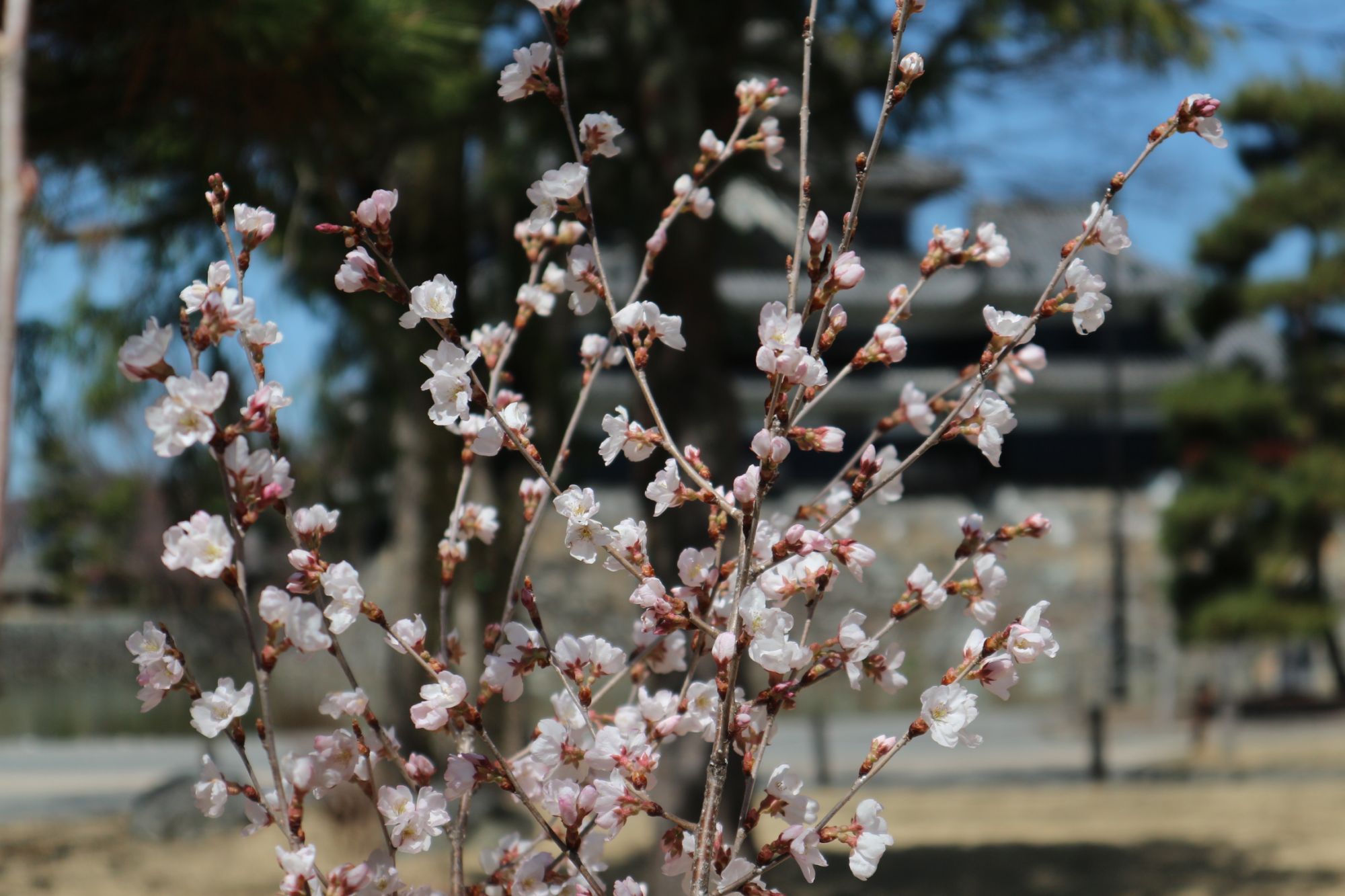 外堀から本丸庭園内を眺めるとコヒガンザクラ、枝垂れ桜が咲いているのが見えます。