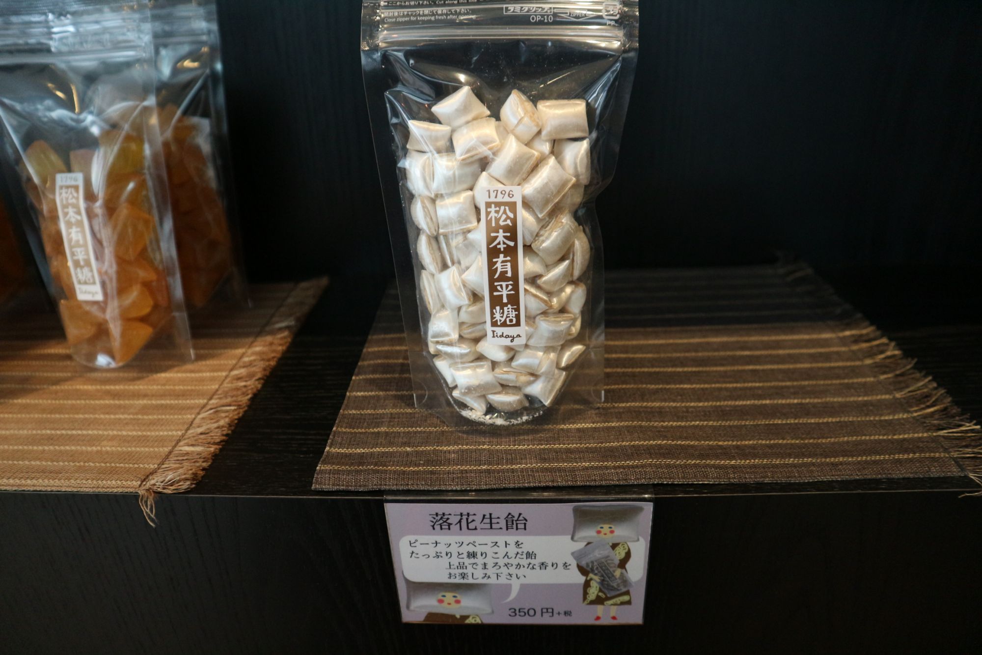 「松本の代表的な飴菓子です。信州安曇野産のもち米で造った米飴を煮詰めたものに厳選した千葉県産落花生をたっぷり練りこみ、のし棒でうすくのばしひとくちサイズに切った大変シンプルな飴です。パリッとした食感と米飴と落花生の香ばしいハーモニーをお楽しみ下さい。」