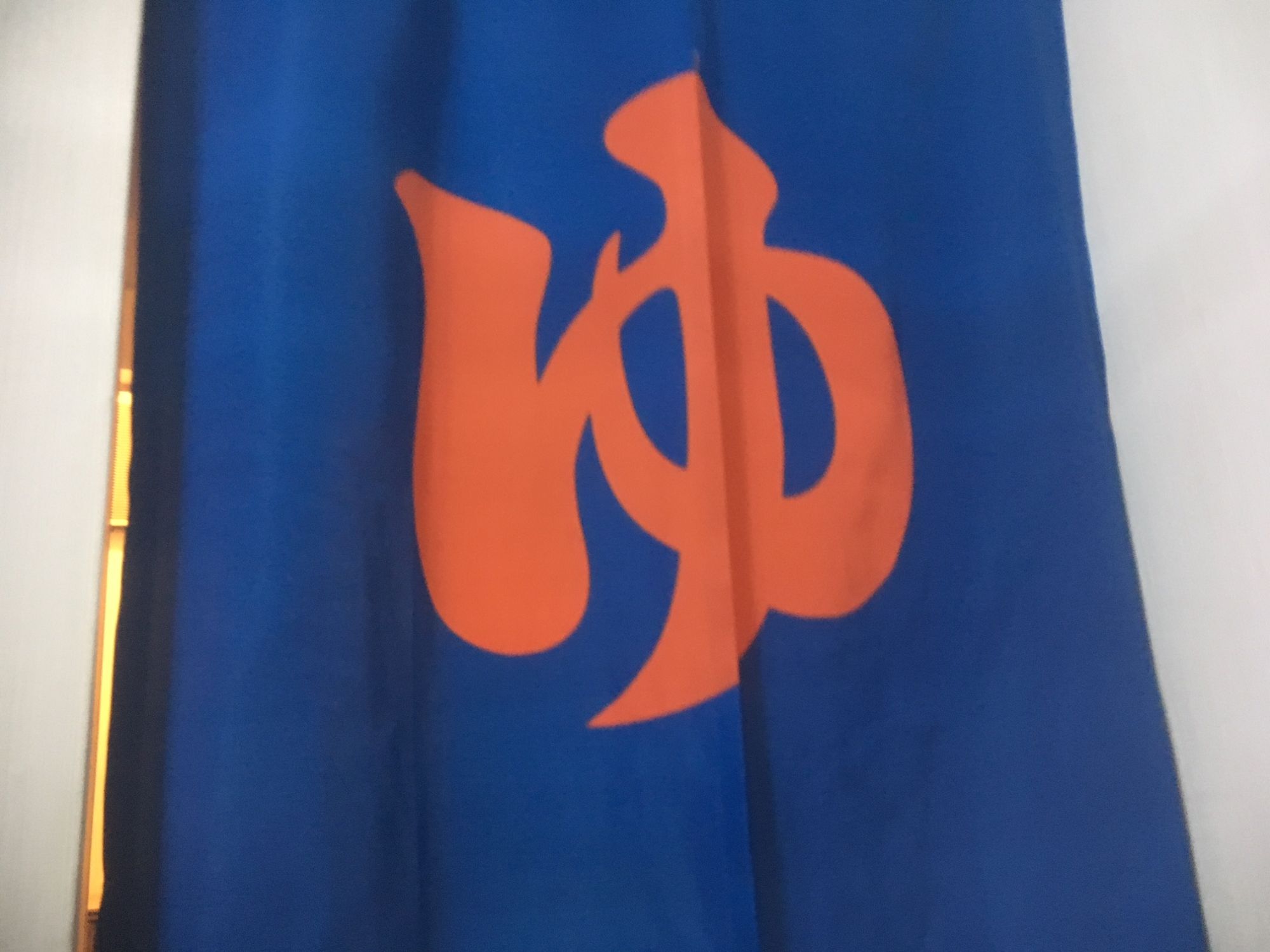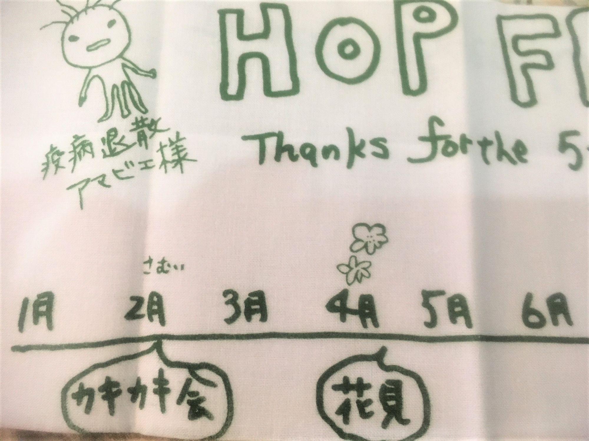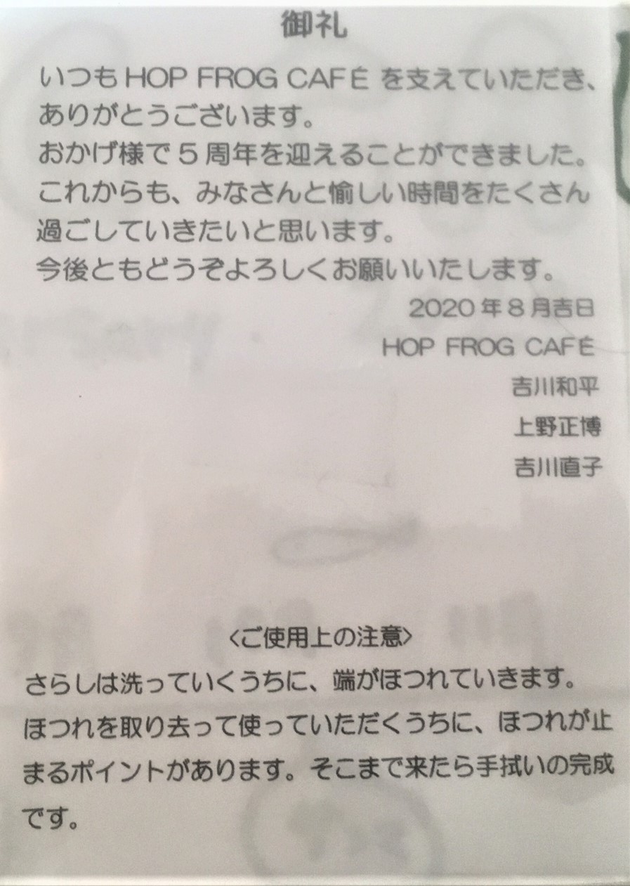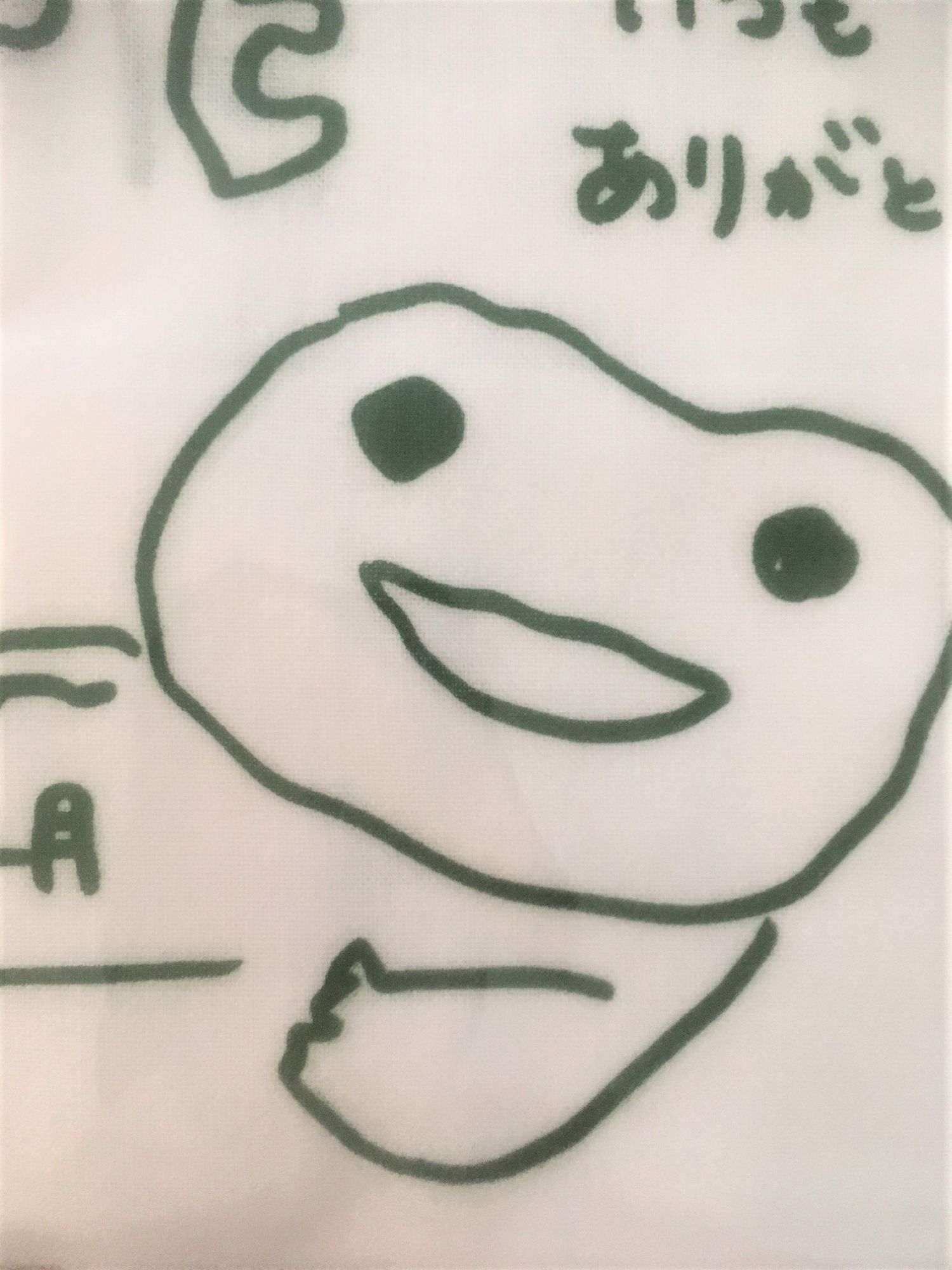 5周年記念の手ぬぐいを頂きました。手描きのイラストは、まさかカエルではないですよね?