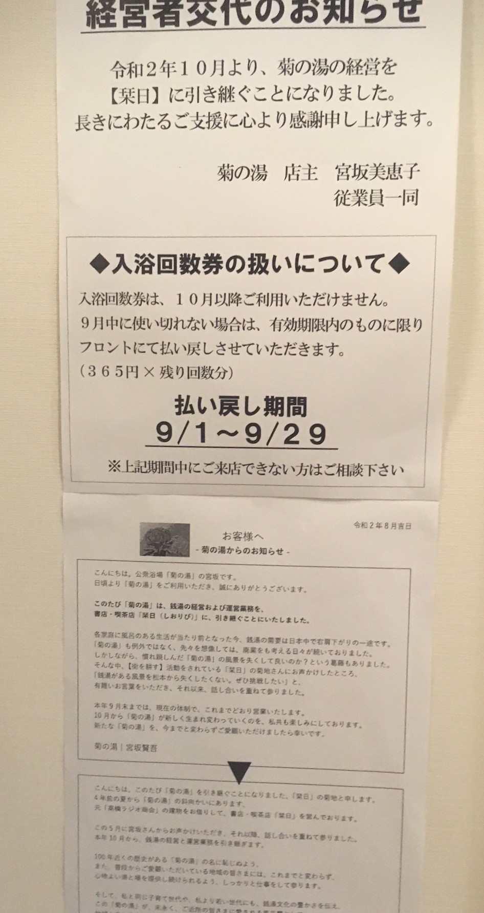 お知らせが貼ってました。10月から経営者が、道路向かいにあるブックカフェ「栞日」さんに代わるそうです。