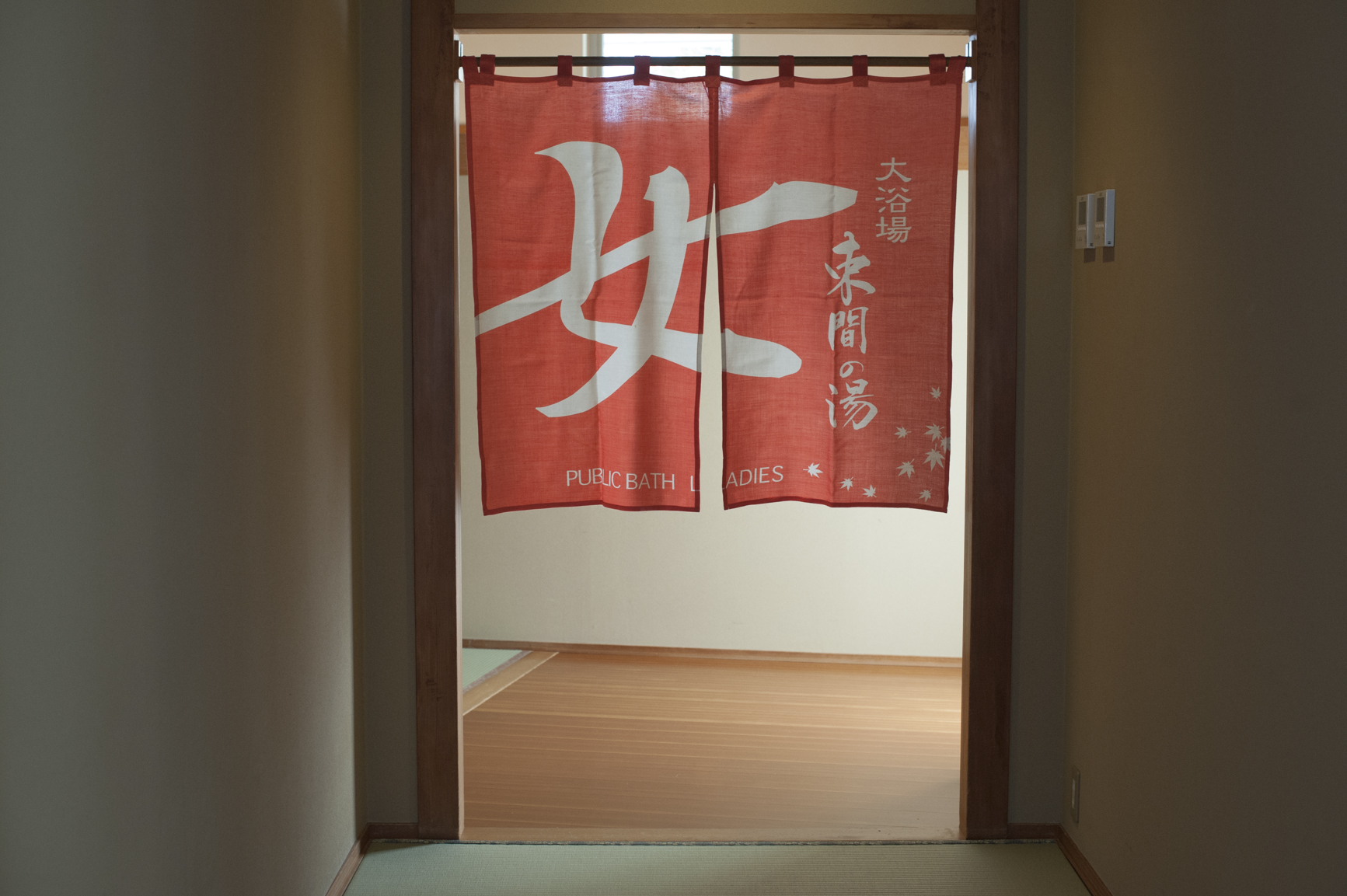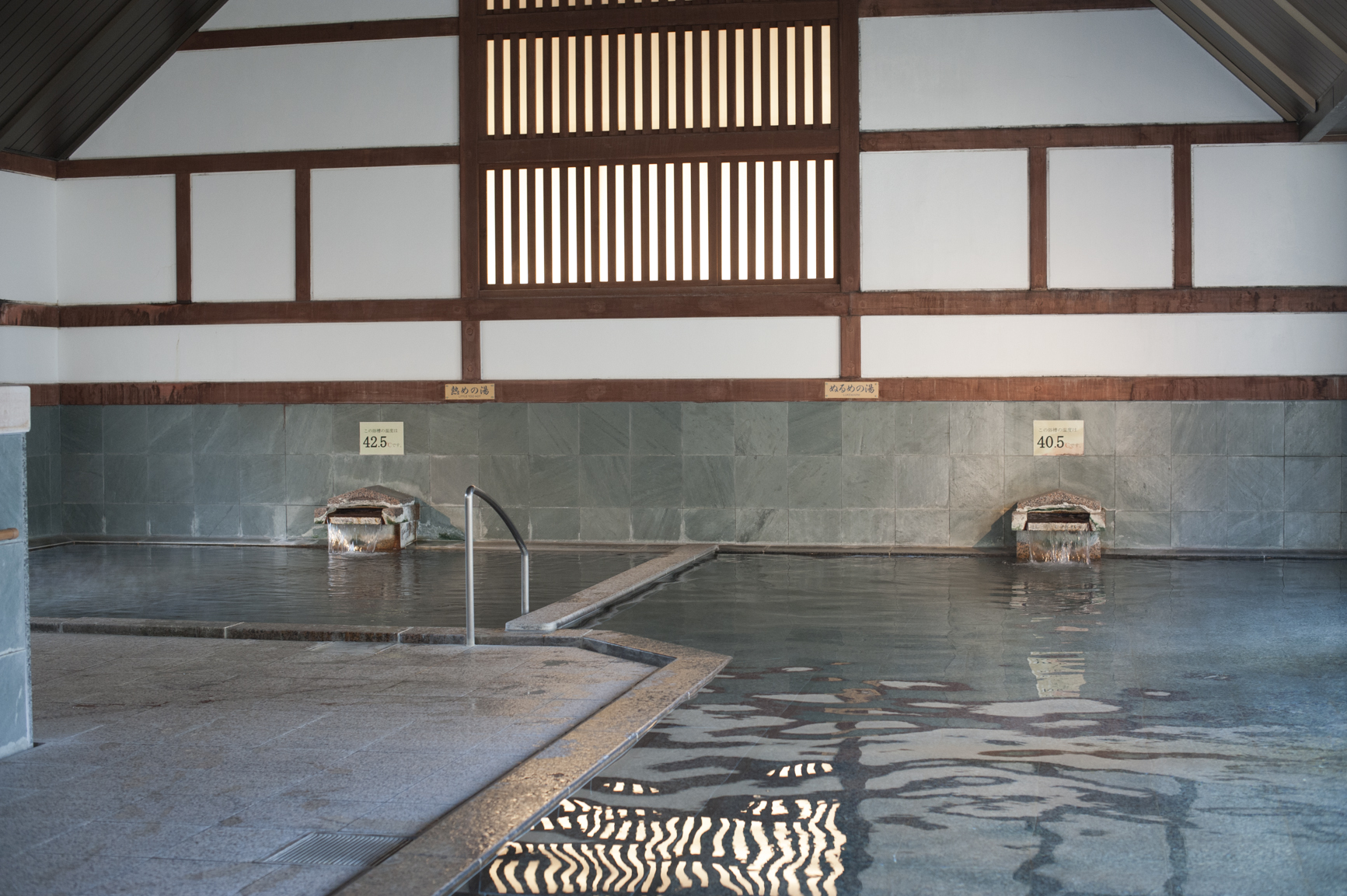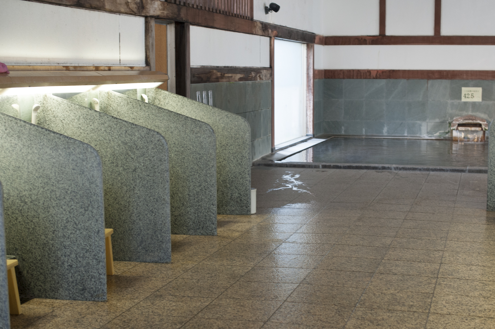 フロントで会計してバスタオルとタオルを受け取り、大浴場「束間の湯」へ。
