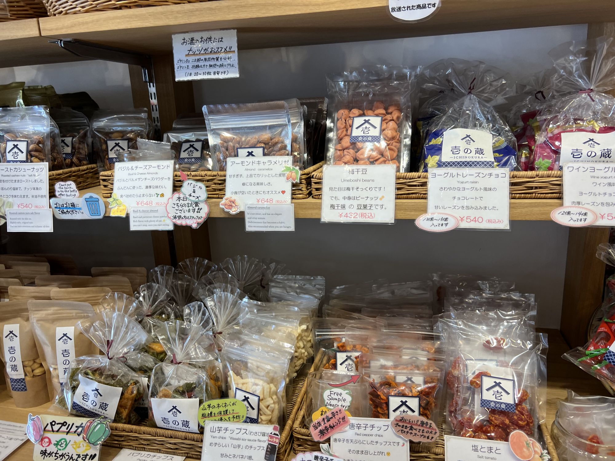 1階は、「壱の蔵」ドライフルーツ、甘納豆、野菜チップス、チョコレートなどを