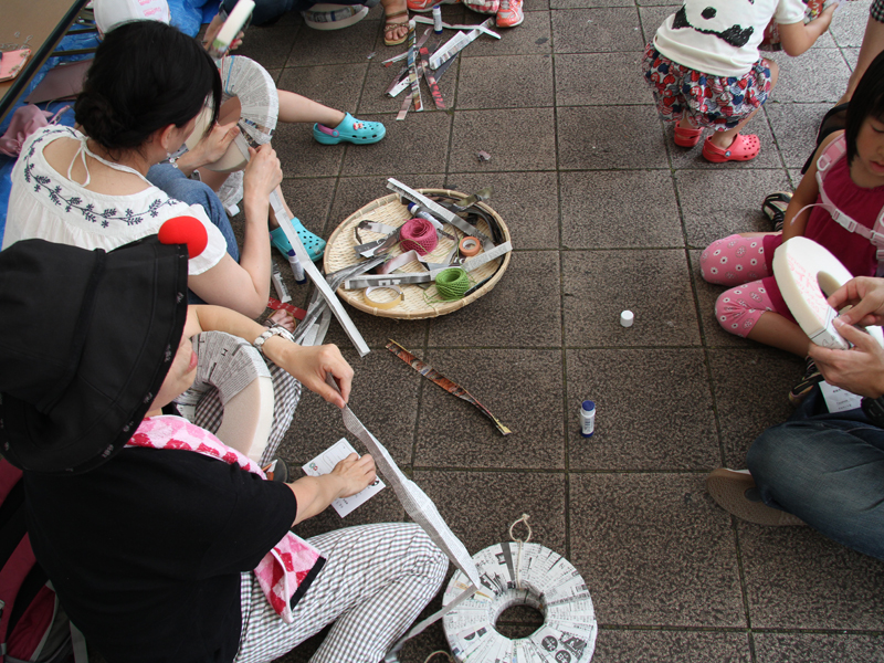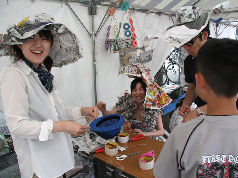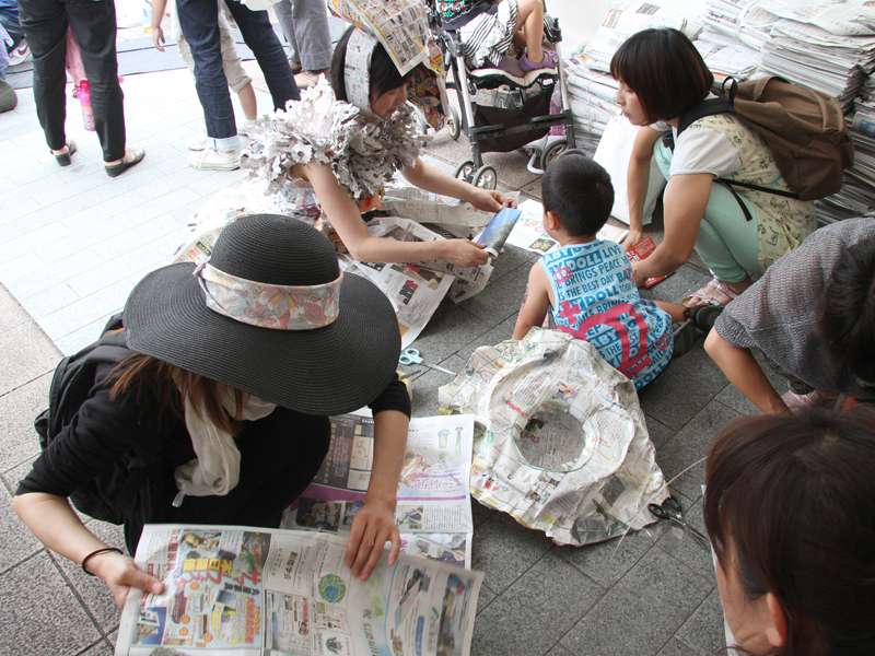 どんな帽子がつくれるかな?すっかりおなじみになった「新聞女」さんのワークショップです。