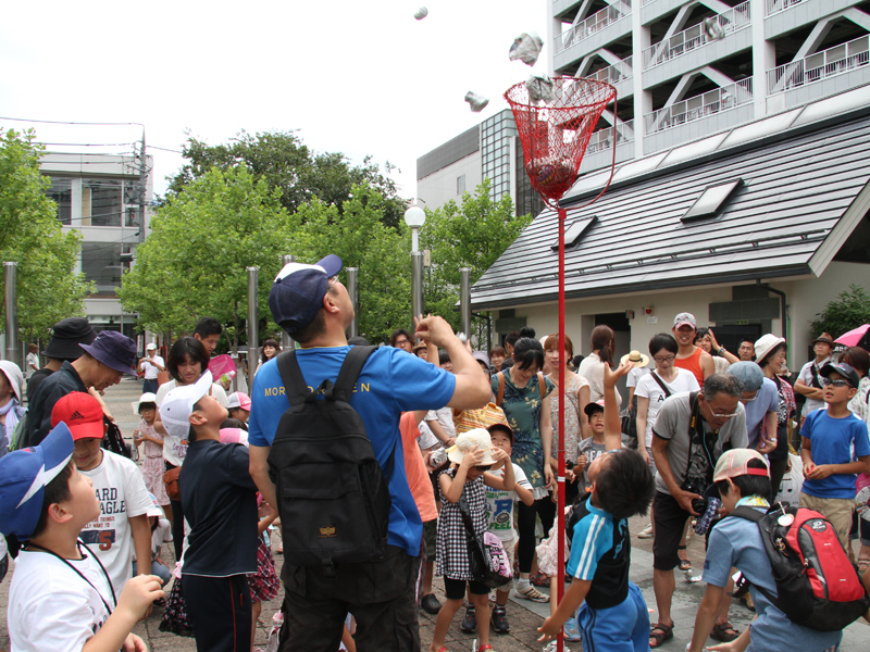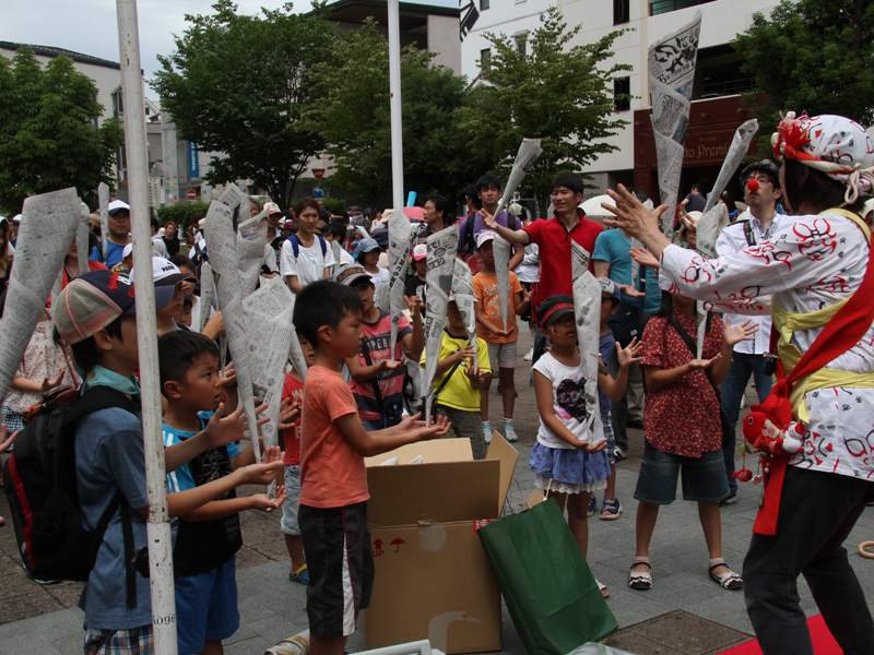 【マル秘ハプニング】として、鈴南玉恵さんのかけ声にあわせて、新聞紙のバランスゲーム。これまでに、いくつかのワークショップに参加して楽しんだ人も多いでしょうが、大道芸は、自分でもやって見なきゃ、ということで、棒状に丸めた新聞紙を手のひらの上で立ててみます。