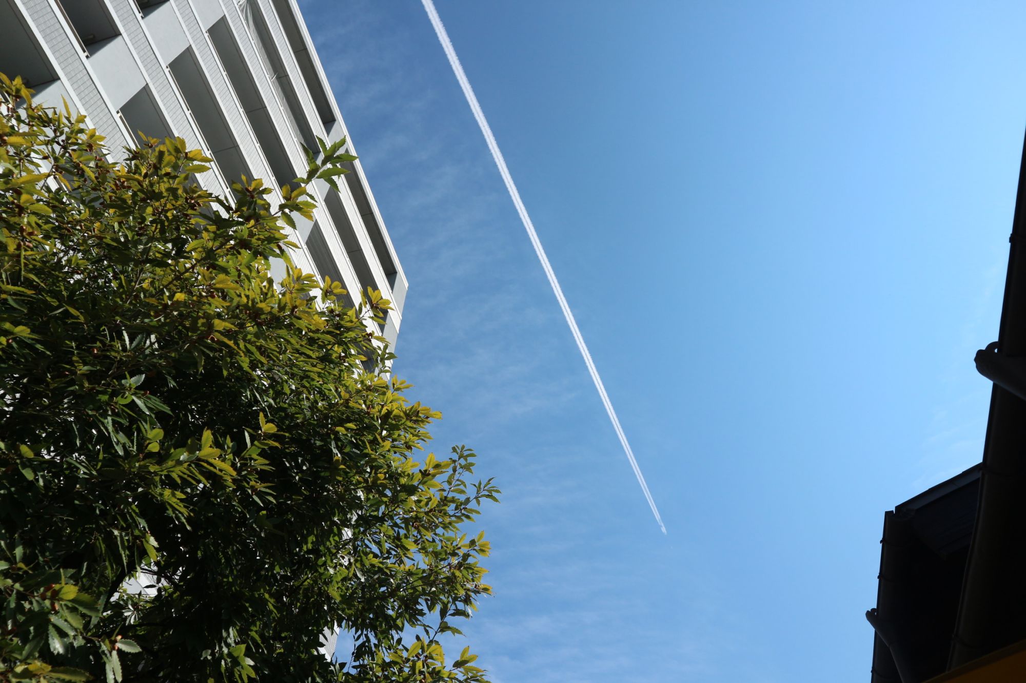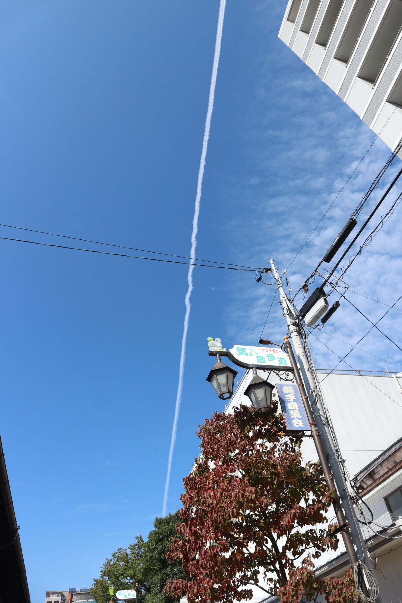 真っ青な秋の空 飛行機雲・神道祭りの幟