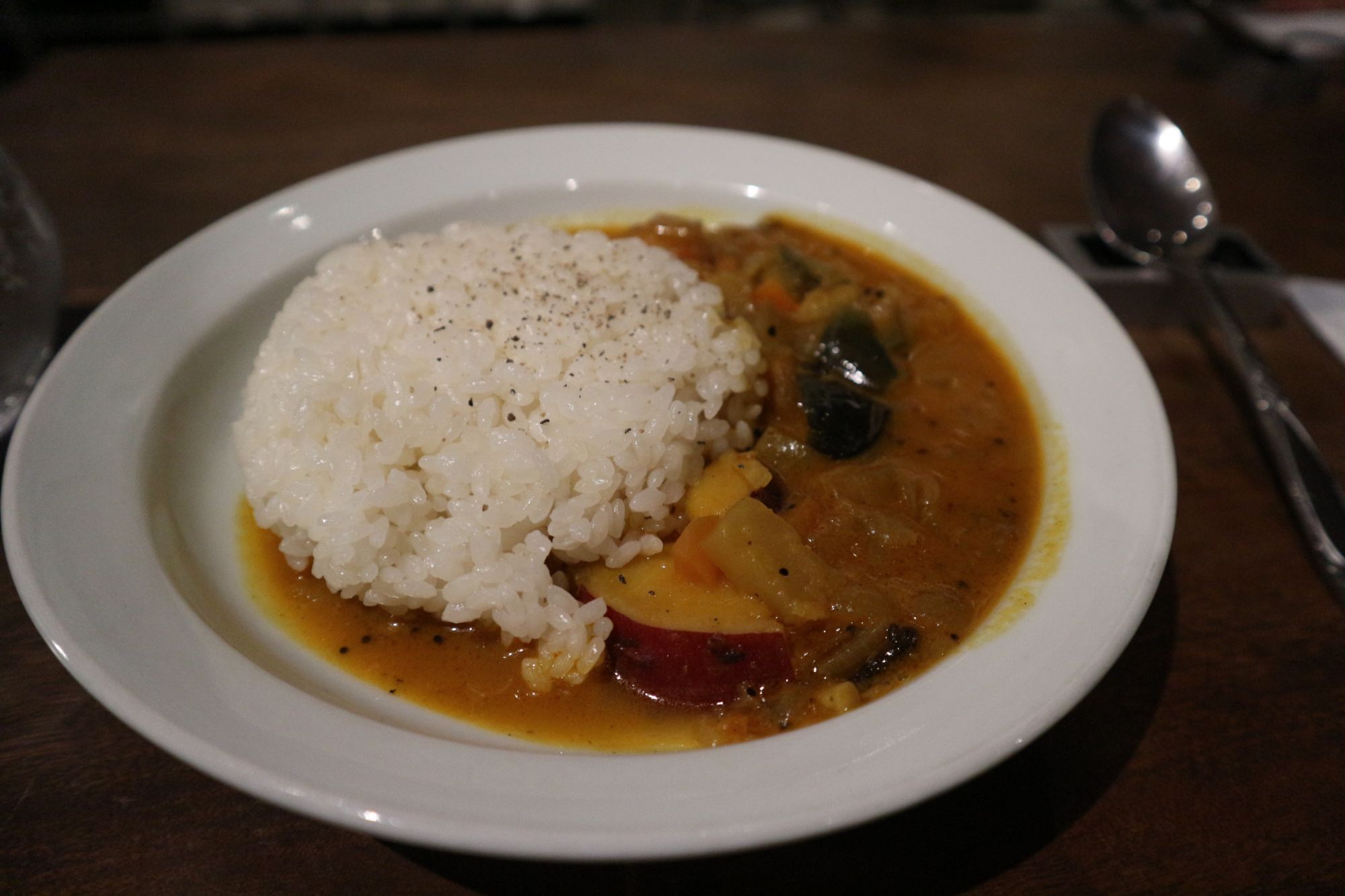 サツマイモが入ったカレーご飯固めで美味しかった。