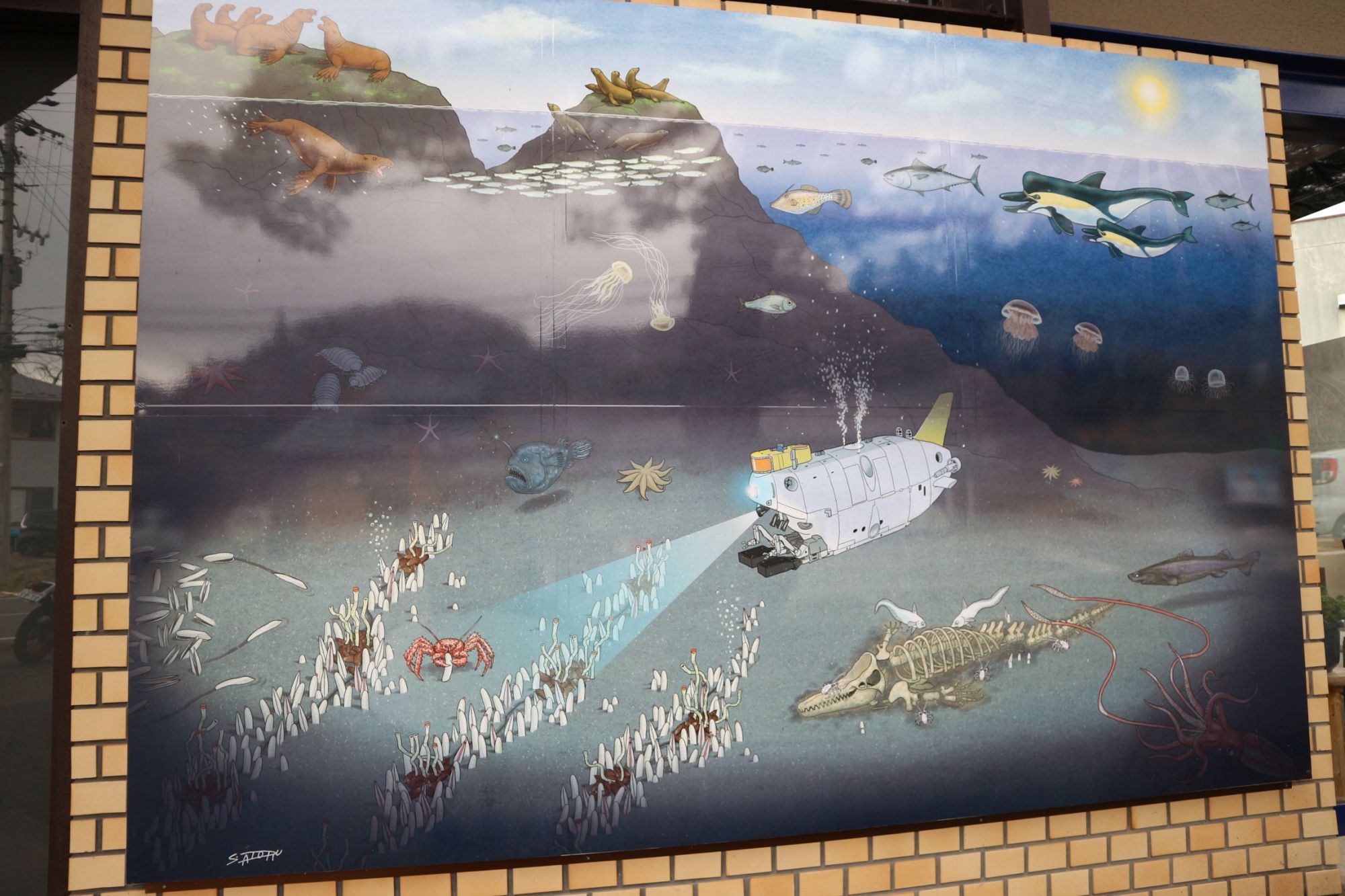 1年前に訪問したときには、なかった館の道路側の壁に化石館でおなじみの「イラストレータースズキサトルさん」の描いた化石と海中のイラストが飾られていました。