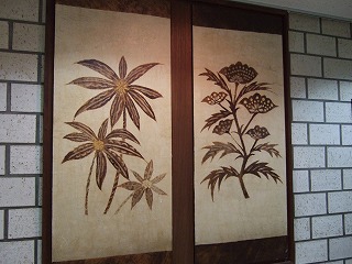 三代澤本寿(みよさわ・もとじゅ)さんの作品は松本の中にだけあるのではありません。銀座では服飾デザイナーの森英恵さんのモリハナエサロンで屏風が使われていました。松本市美術館の「型絵染・三代澤本寿生誕101年展」のために修復し展示されています。