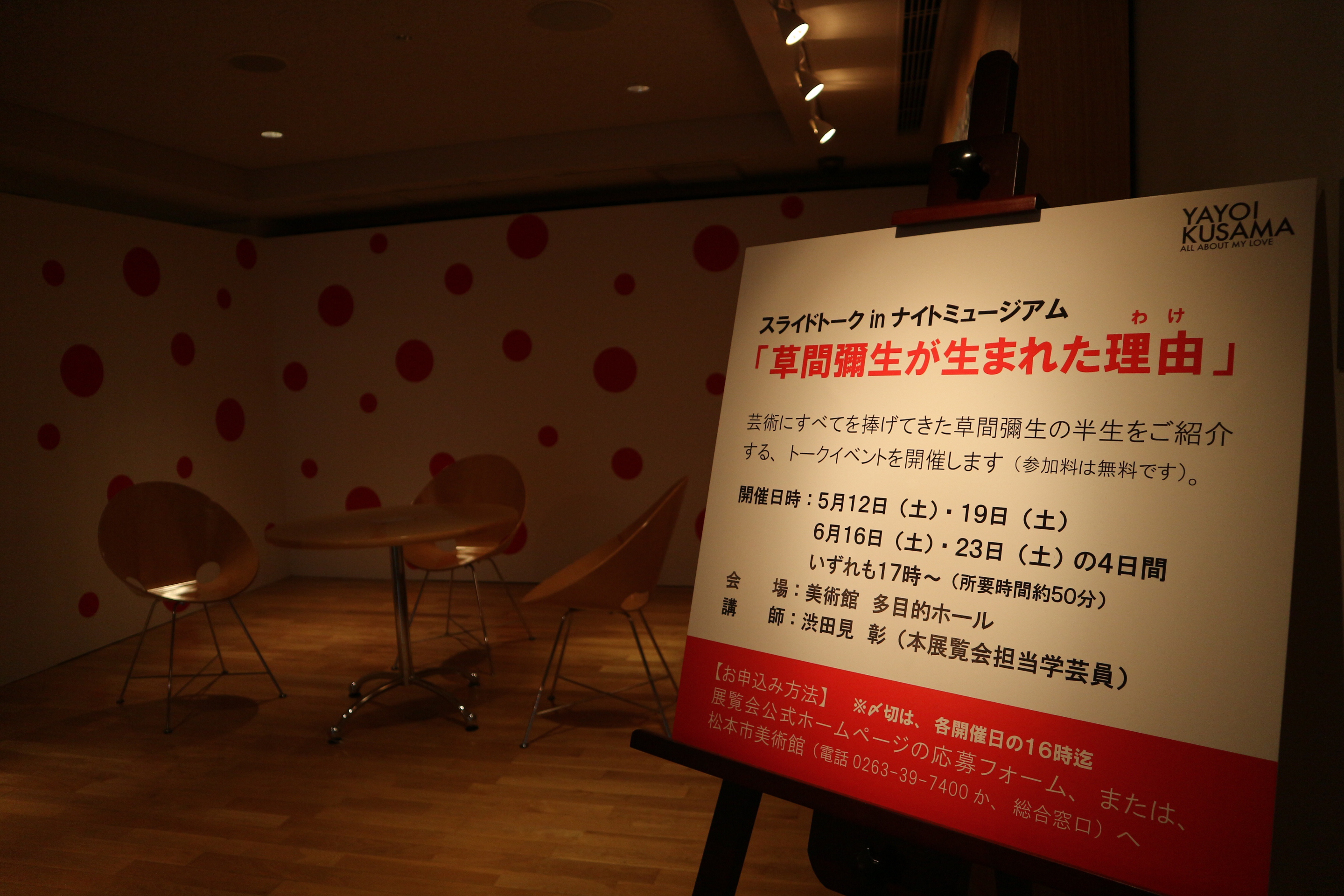 松本市美術館が開館した2002年から草間彌生を担当し、「草間彌生 魂のおきどころ」「草間彌生 永遠の永遠の永遠」「草間彌生 ALL ABOUT MY LOVE 私の愛のすべて」など多数の特別展を手掛ける。 - 応募方法ウェブまたは電話(0263-39-7400、松本市美術館)で受け付けます。