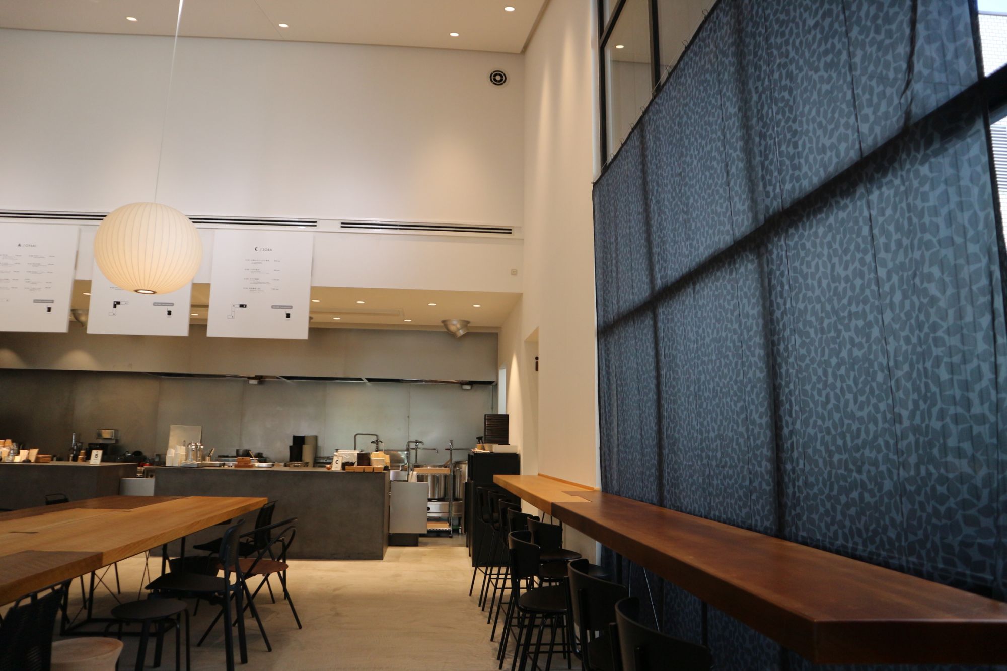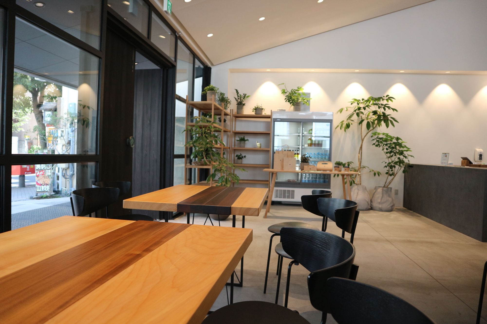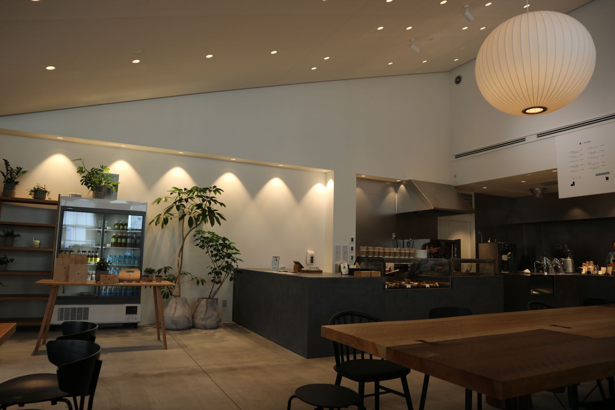 モダンな外観、中に入ると床は洗い出しのコンクリートに真鍮で店名がはめられ、広々とした店内は都会的な雰囲気が漂っています。