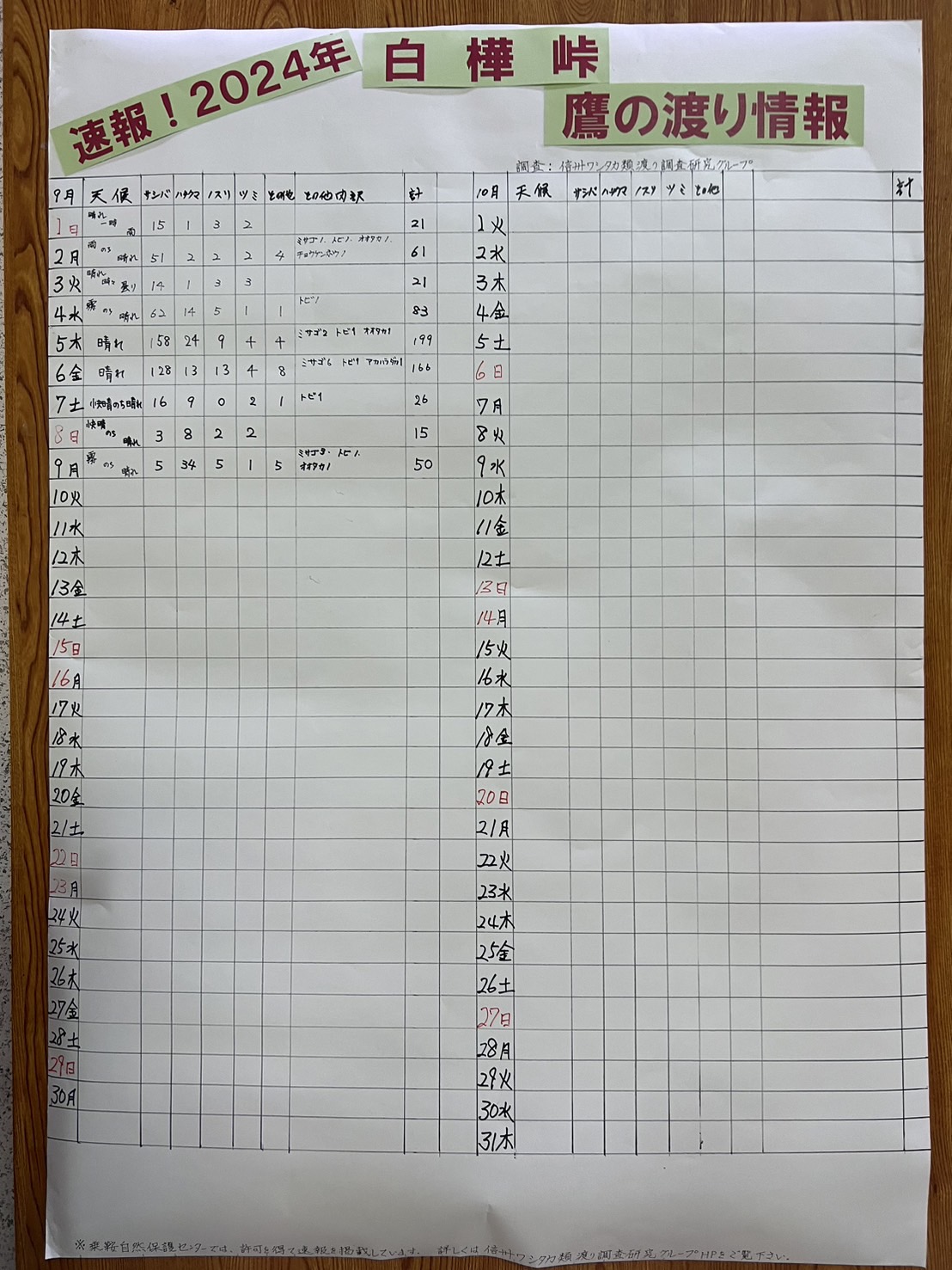 前日(9月11日)に行ったたかの見の広場の鷹に関する資料もあります。