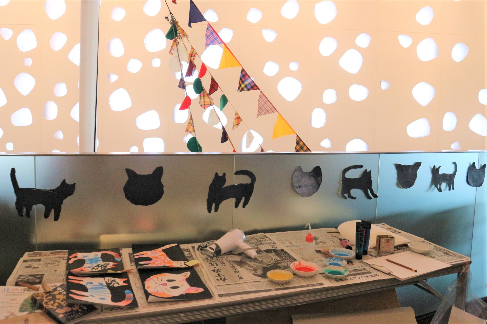 ねこのシルエットが印刷された紙に顔や模様を描きます。お絵かきなどをはさんで運べる「紙ばさみ」にしあげます。