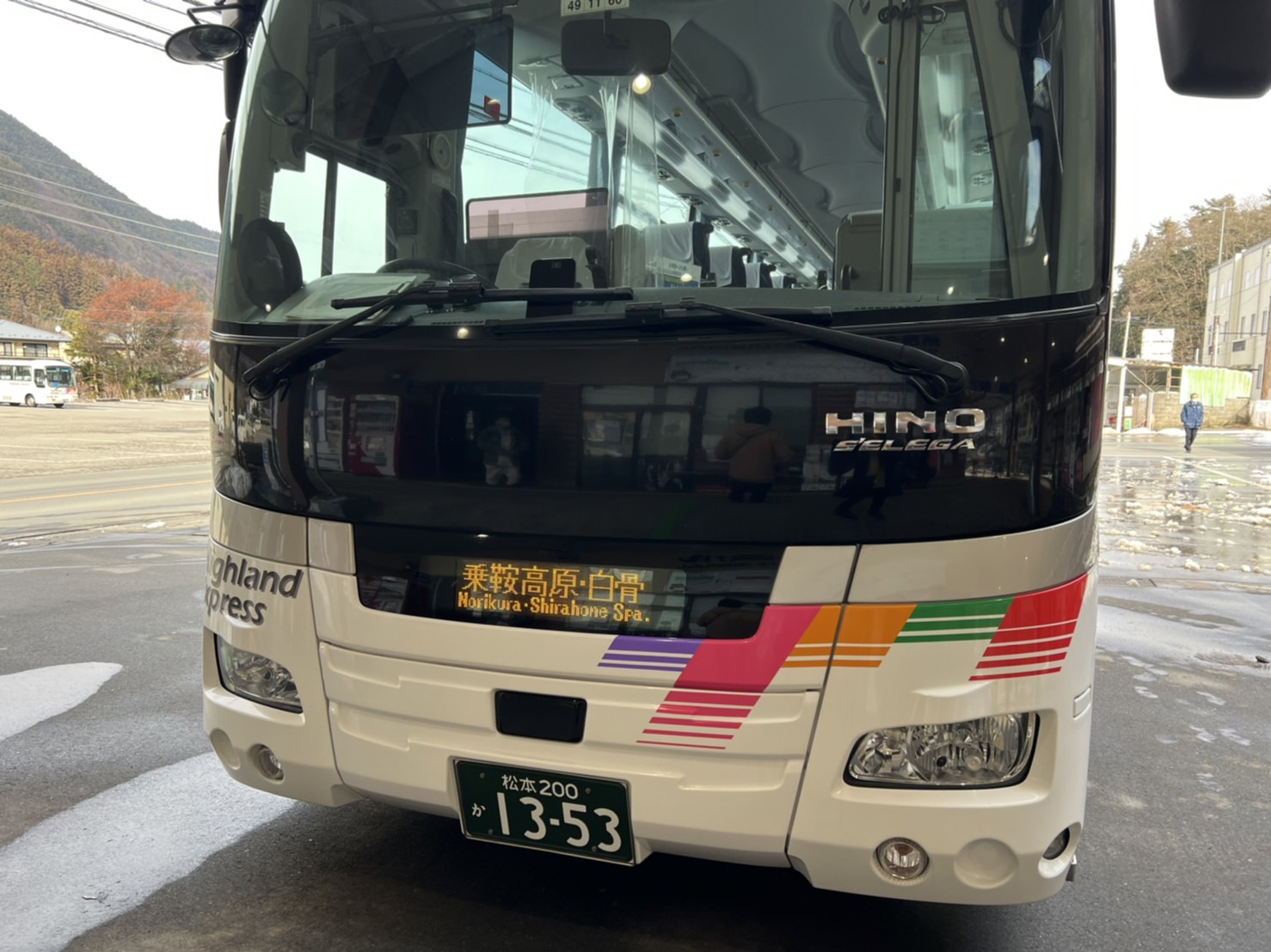 駅を降りたらすぐにバスに乗り換えます。チケットは乗鞍観光センターまで買っていたので、そのまま添乗員さんに渡して、荷物も預けました。