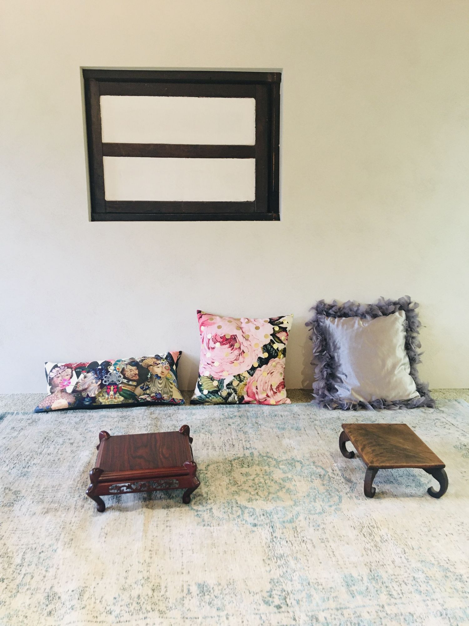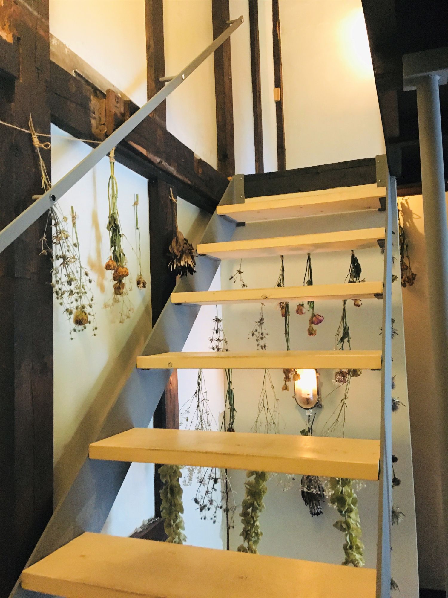 Eine schmale Holztreppe geschmückt mit getrockneten Kräutern führt ins obere Stockwerk, hier ist alles ganz gemütlich und es gibt einzeln abgesteckte Bereiche, die für etwas Privatsphäre und Social Distancing sorgen.