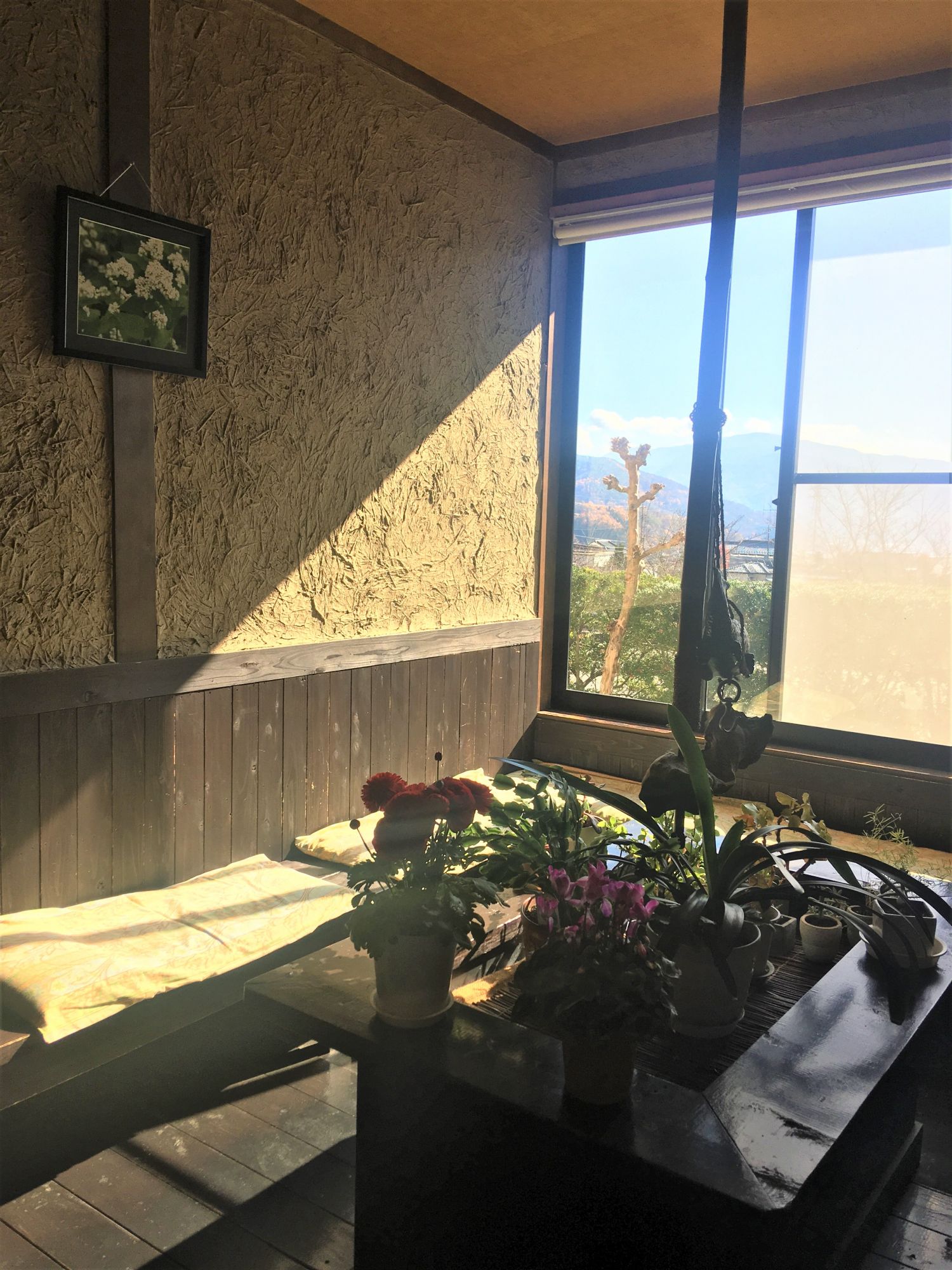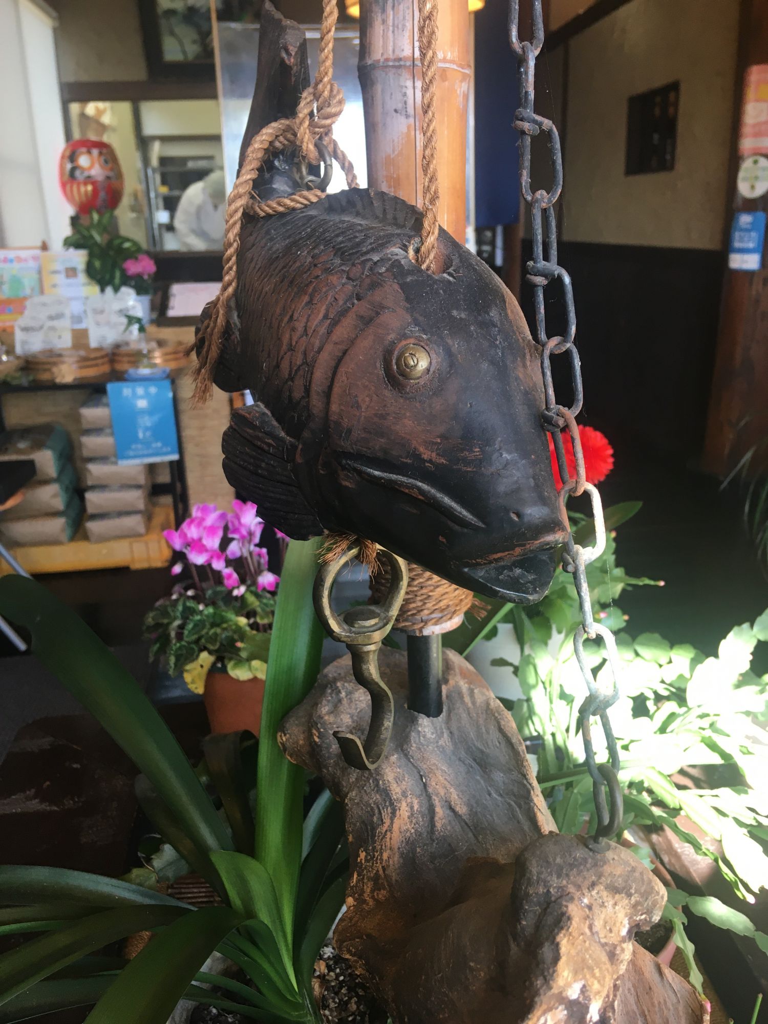 Neben der Kasse liegt eine Liste, in welche man seinen Namen und die Anzahl der Personen einträgt. Dann nimmt man im Wartebereich Platz, eine grüne Oase an einer ehemaligen Feuerstelle (囲炉裏), zu erkennen am Holzfisch.