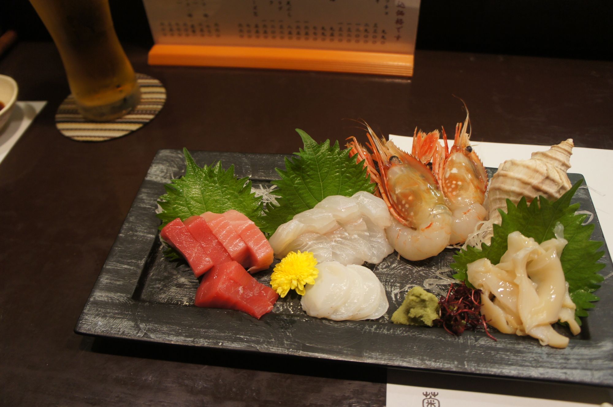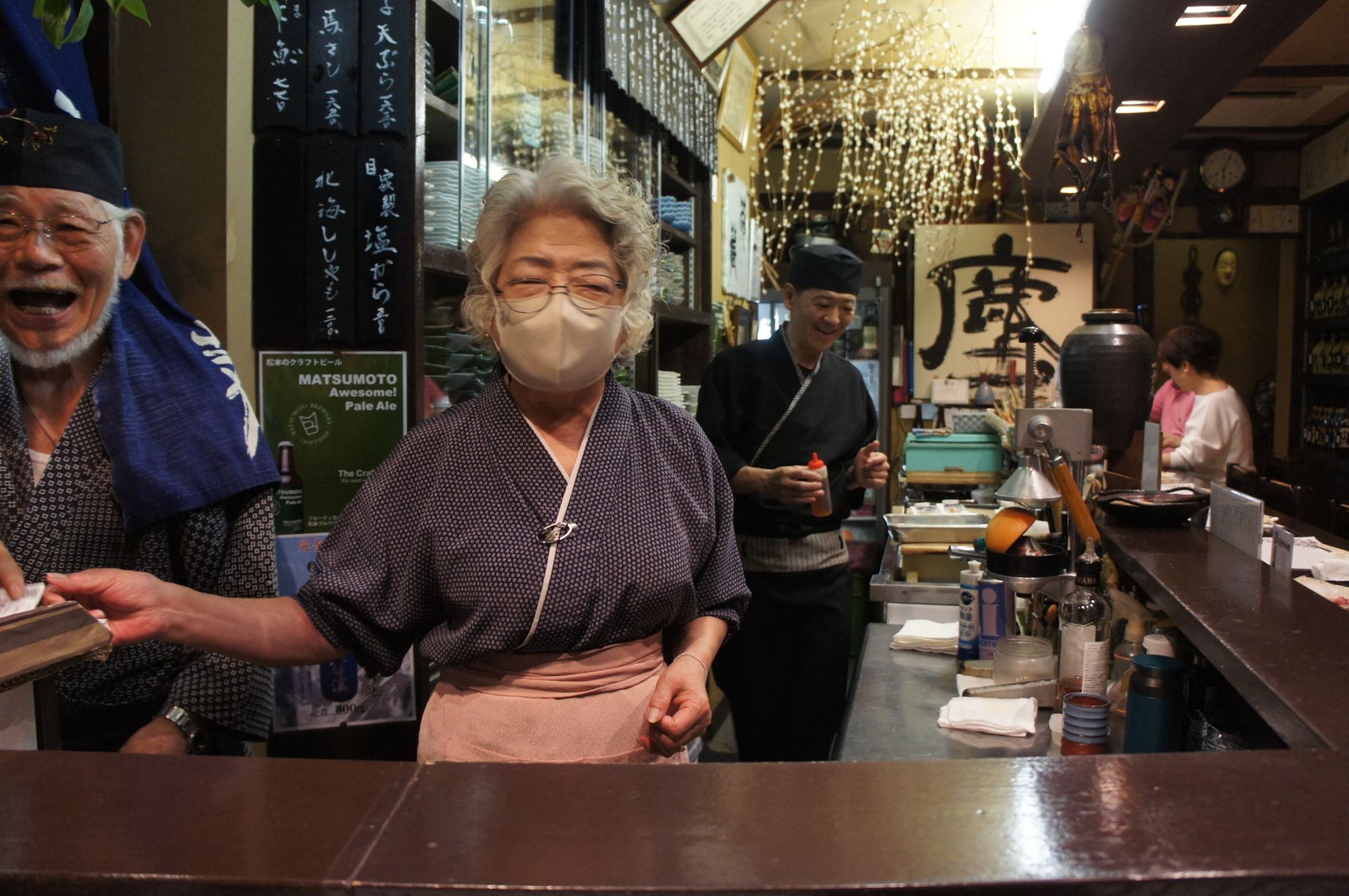 Nicht nur im Kikuzo (0263-36-3728), sondern auch in den Izakaya in Japan wird oft die Theke benutzt. Das liegt daran, dass viele von ihnen klein sind. Ein weiteres Merkmal ist, dass sich der Besitzer und die Kunden oft von Angesicht zu Angesicht unterhalten. Im Kikuzo finden nur 10 Personen an der Theke Platz, aber es gibt auch einen größeren Raum, wenn man einen Tisch reserviert.