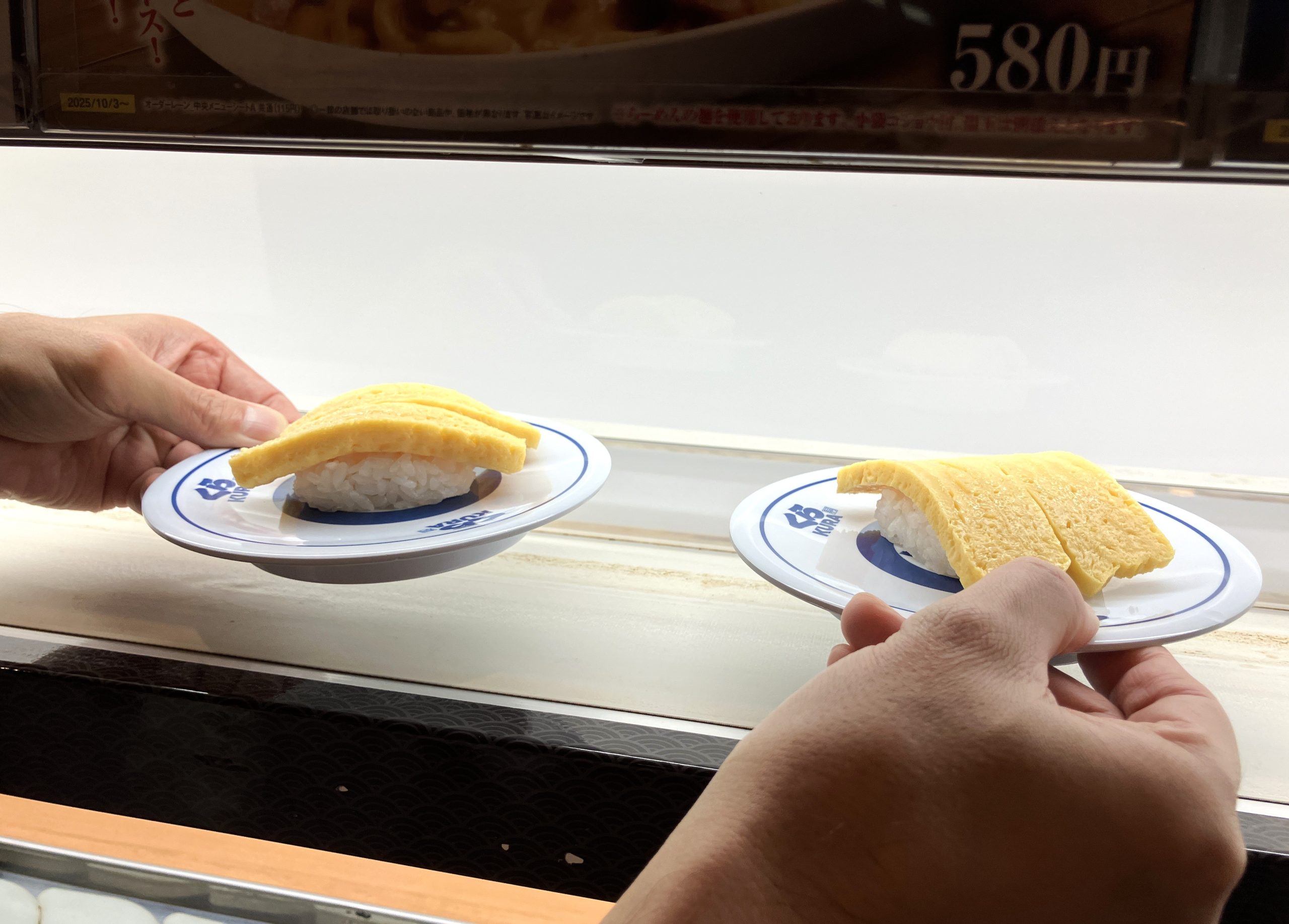 Kura Sushi ist bekannt für Kaiten-Zushi, wo das Sushi auf einem Förderband vorbeifährt und kommt ursprünglich aus Osaka. Als erstes fällt auf, dass der beliebte süß-sauer eingelegte Ingwer, der sonst kostenlos auf dem Tisch steht, hier Geld kostet. Dafür gibt es eine kostenfreie Alternative aus Rettich.