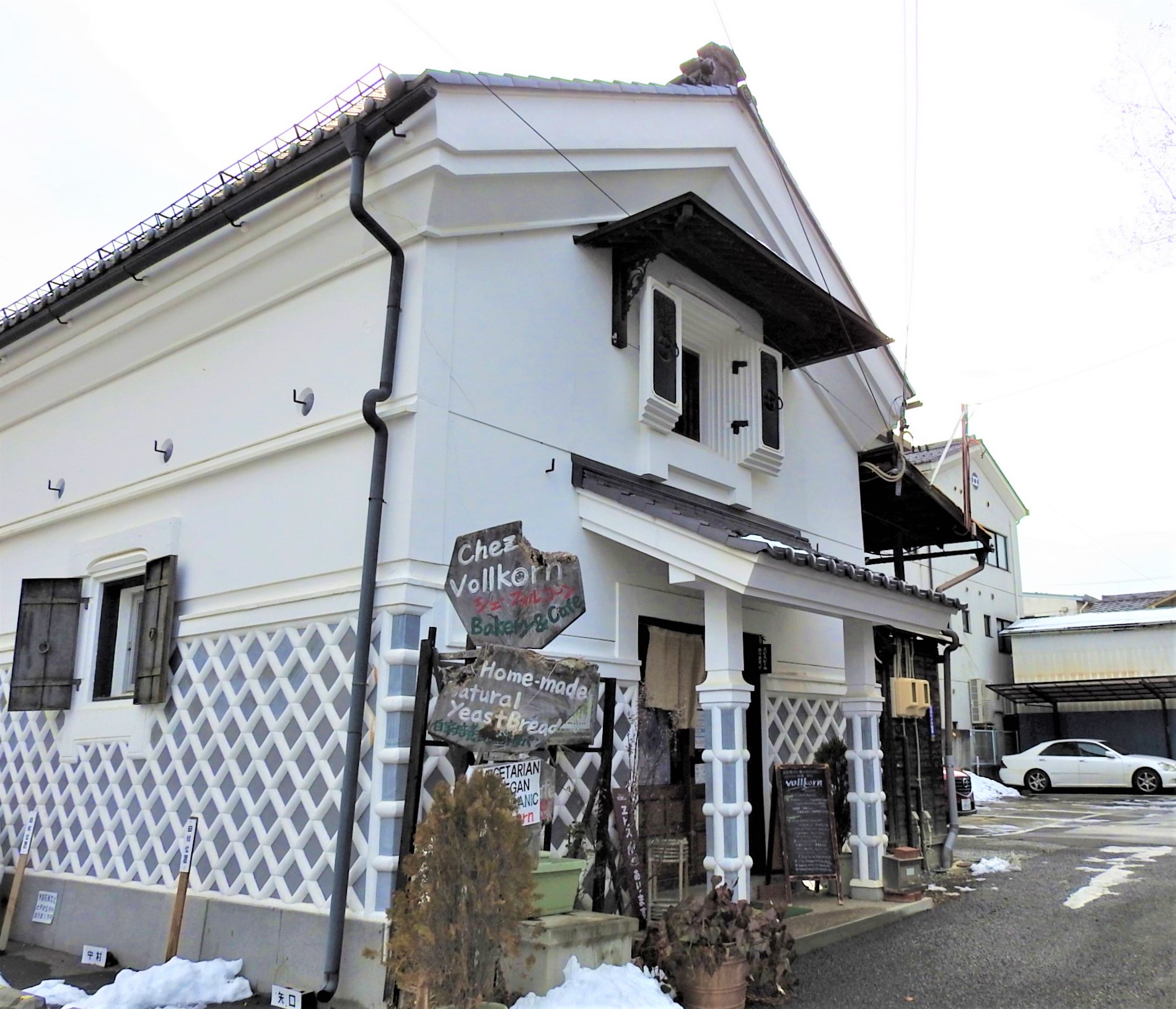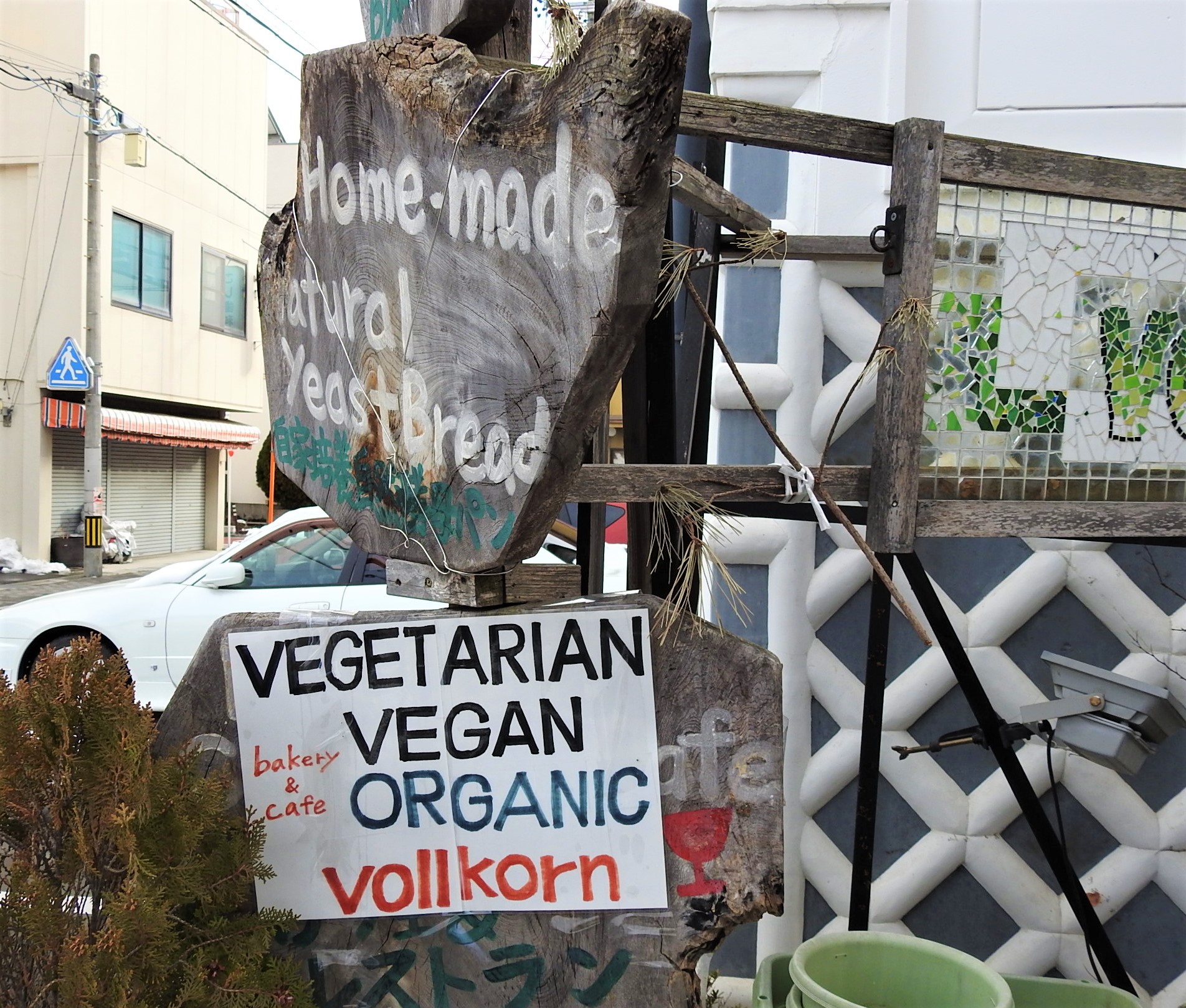 Die Suche nach authentischem Sauerteigbrot führte mich in die Bäckerei „Vollkorn“. Die Buchstaben VOLLKORN stehen auf Deutsch auf der Tafel am Eingang des Cafés, das sich in einem alten Kura-Lagerhaus befindet.