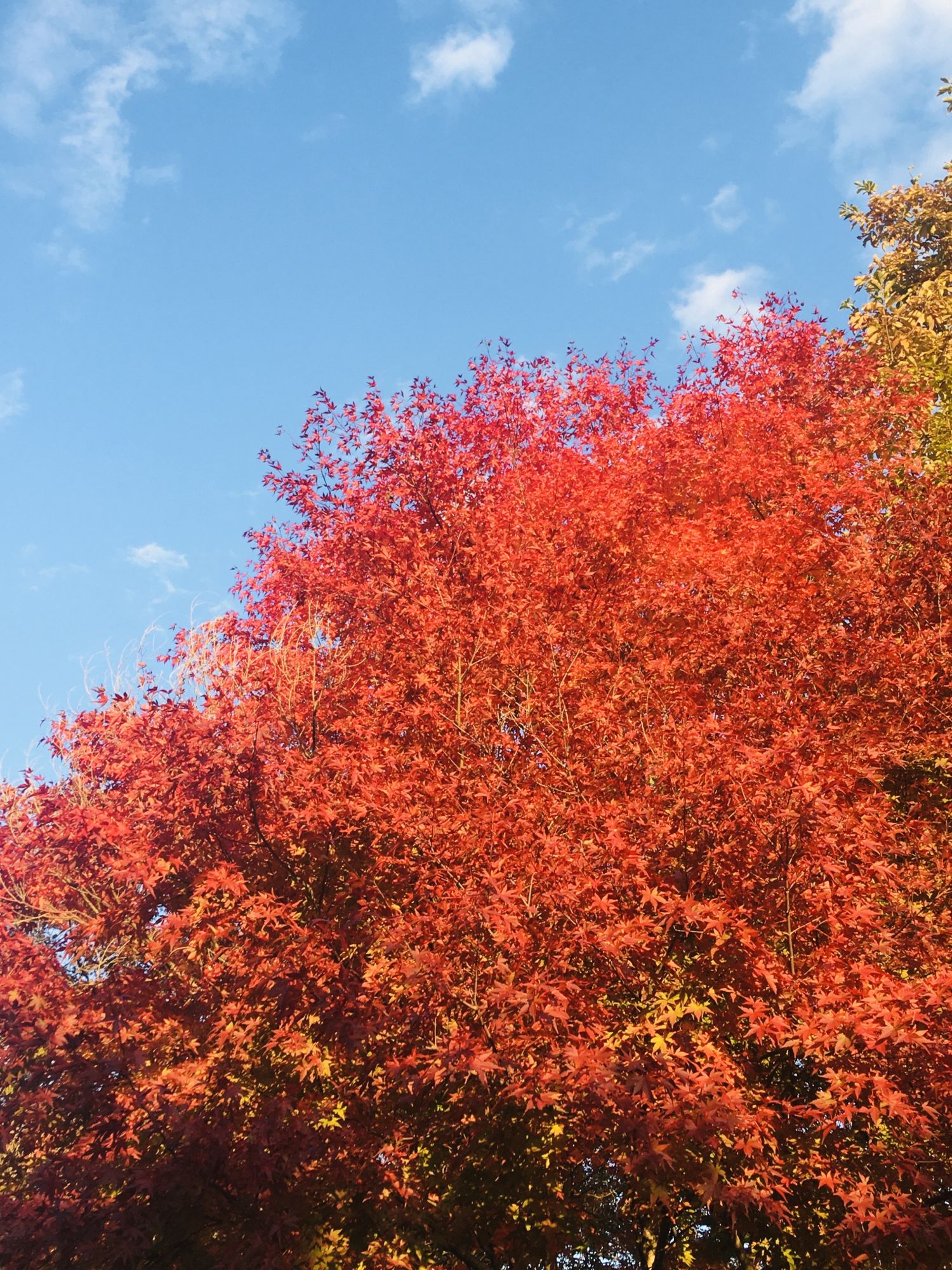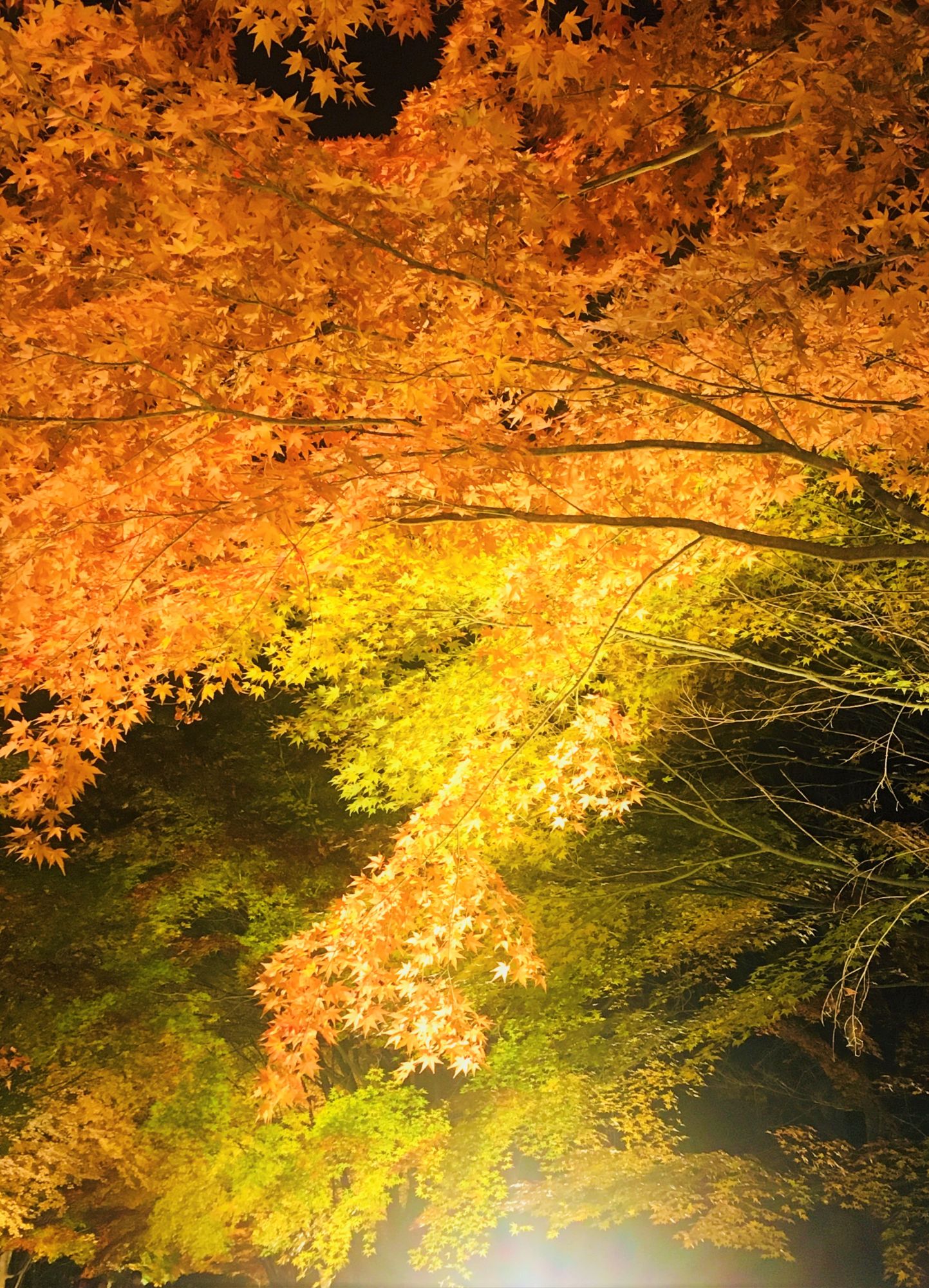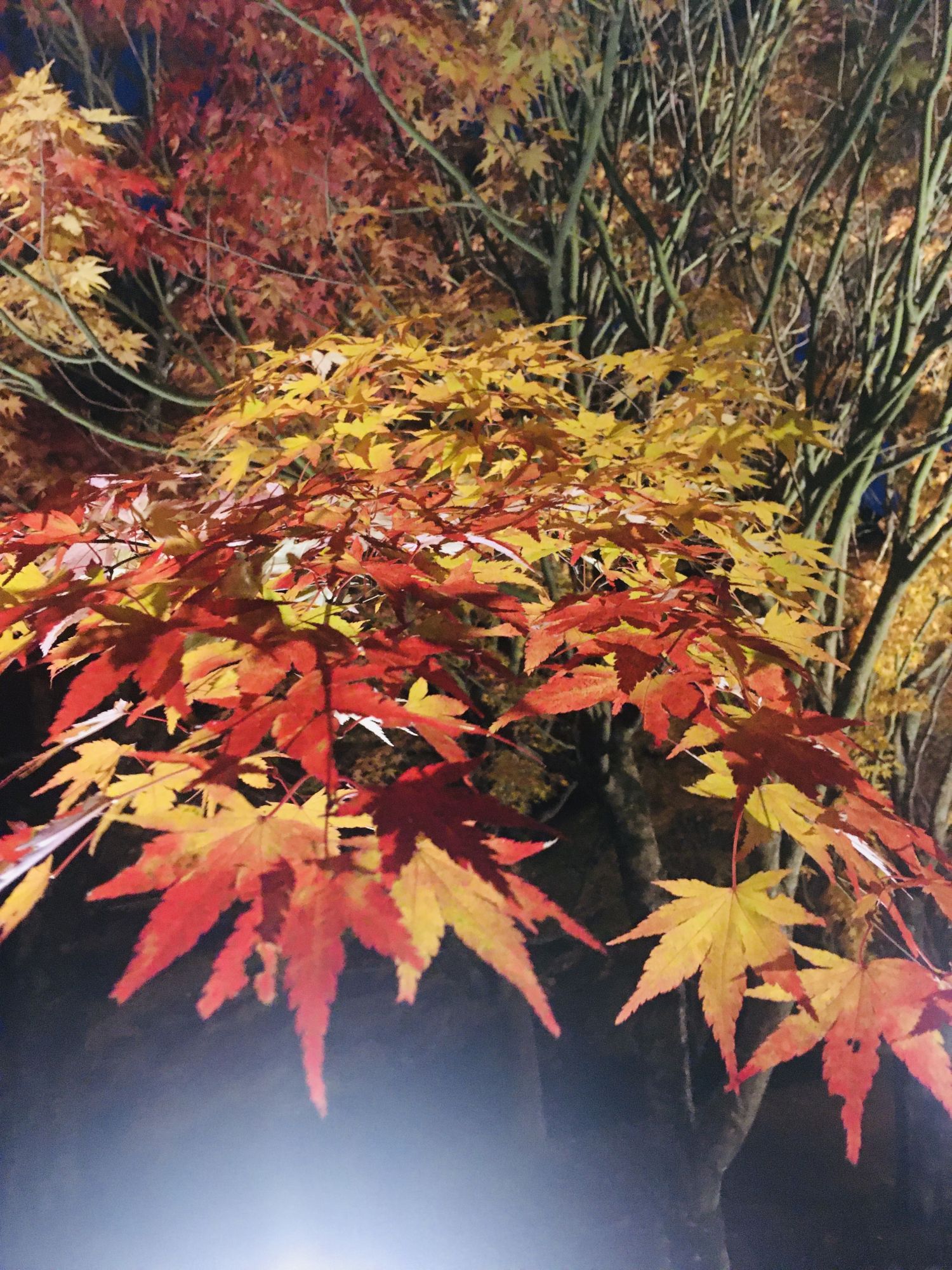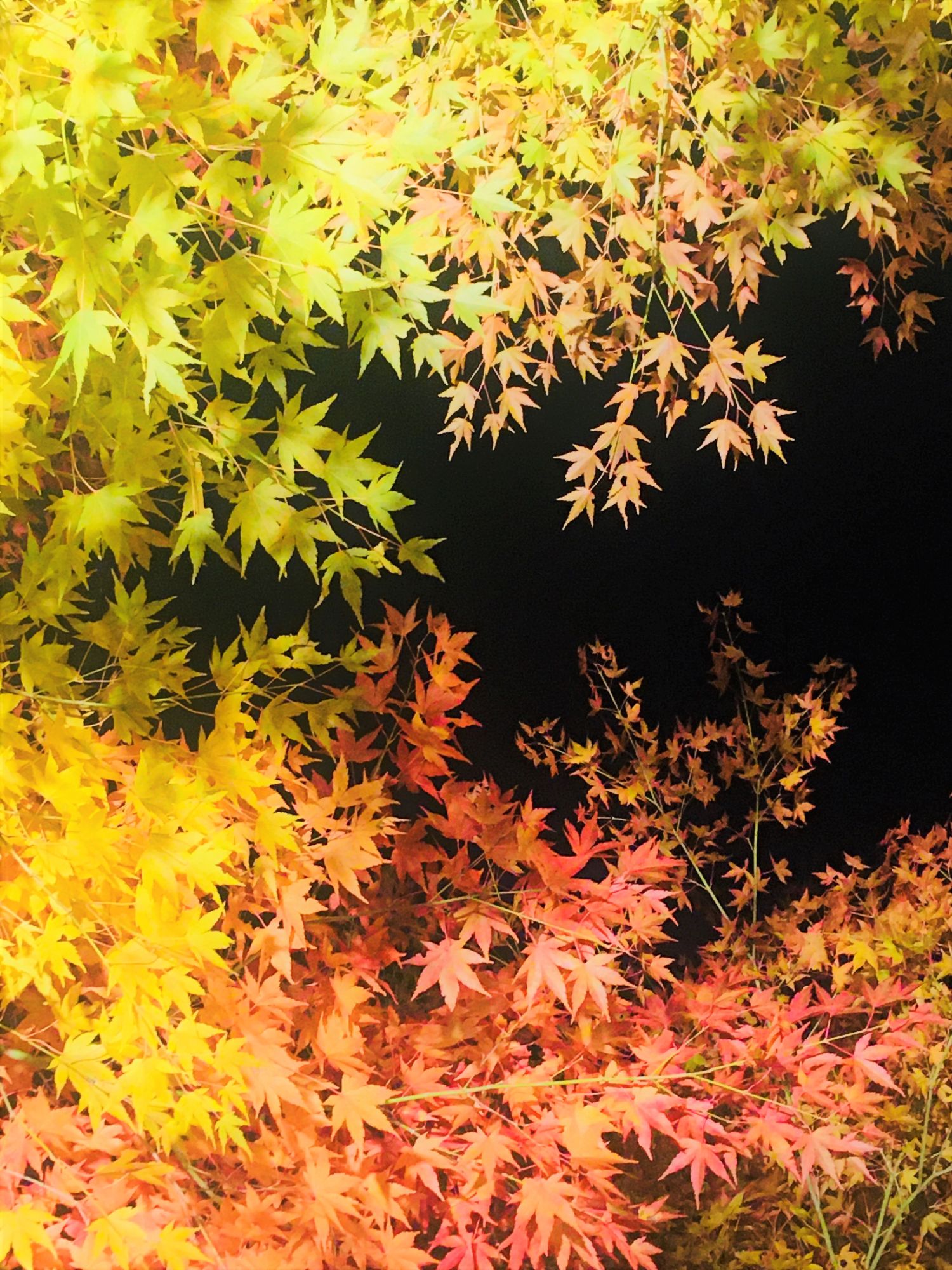 Strahlendes Rot, leuchtendes Gelb und noch grüne Ahornblätter bilden selbst zum Nachthimmel einen tollen Kontrast.