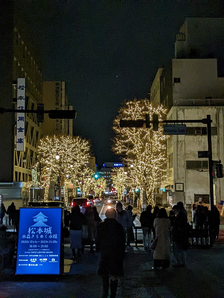 Das Stadtzentrum von Matsumoto ist immer ein guter Anlaufpunkt. Die Daimyomachi-Straße ist festlich geschmückt und vor vielen Geschäften gibt es Weihnachtsbäume. Auch die Burg Matsumoto wartet mit einer Lichtershow auf.