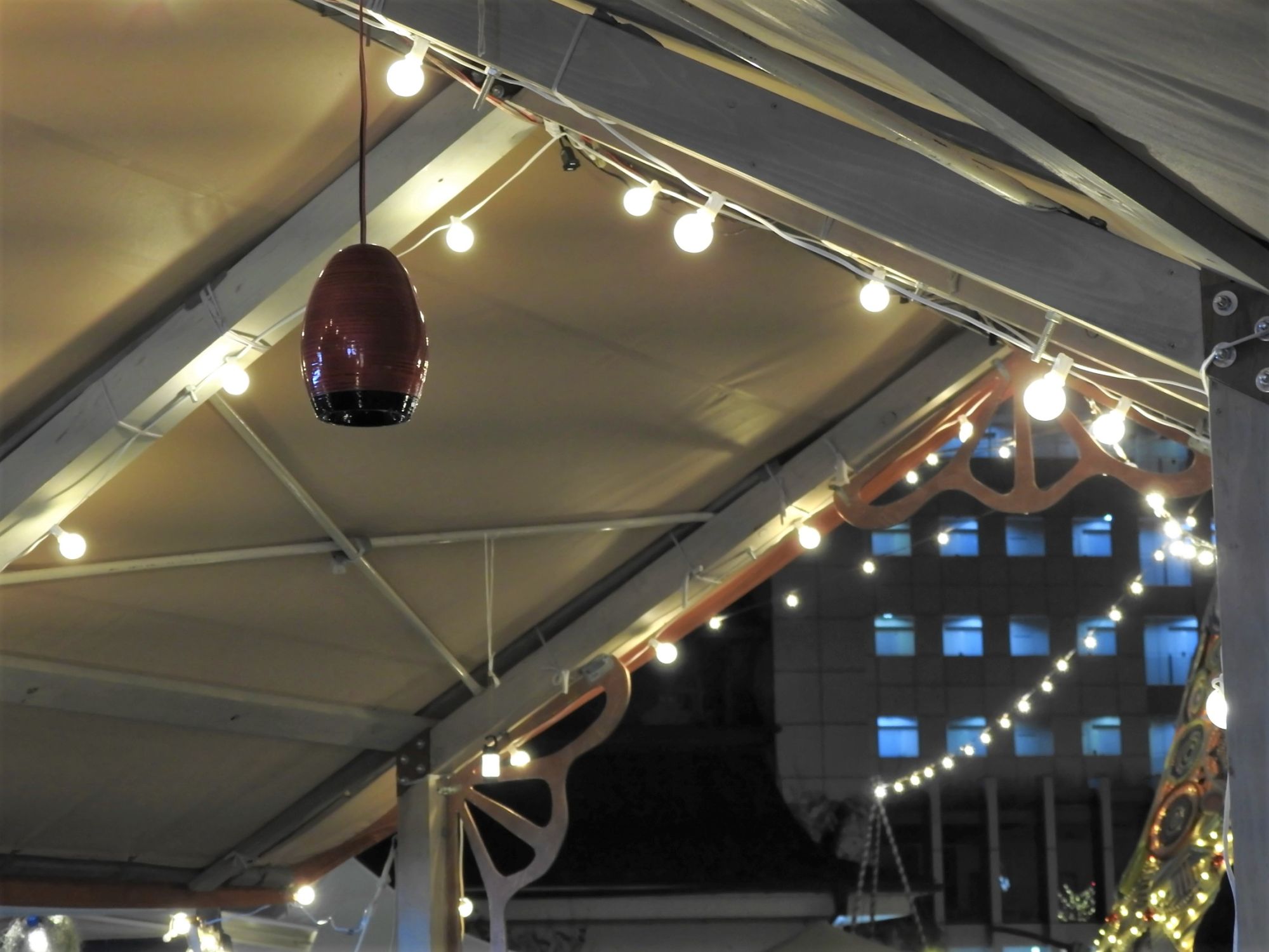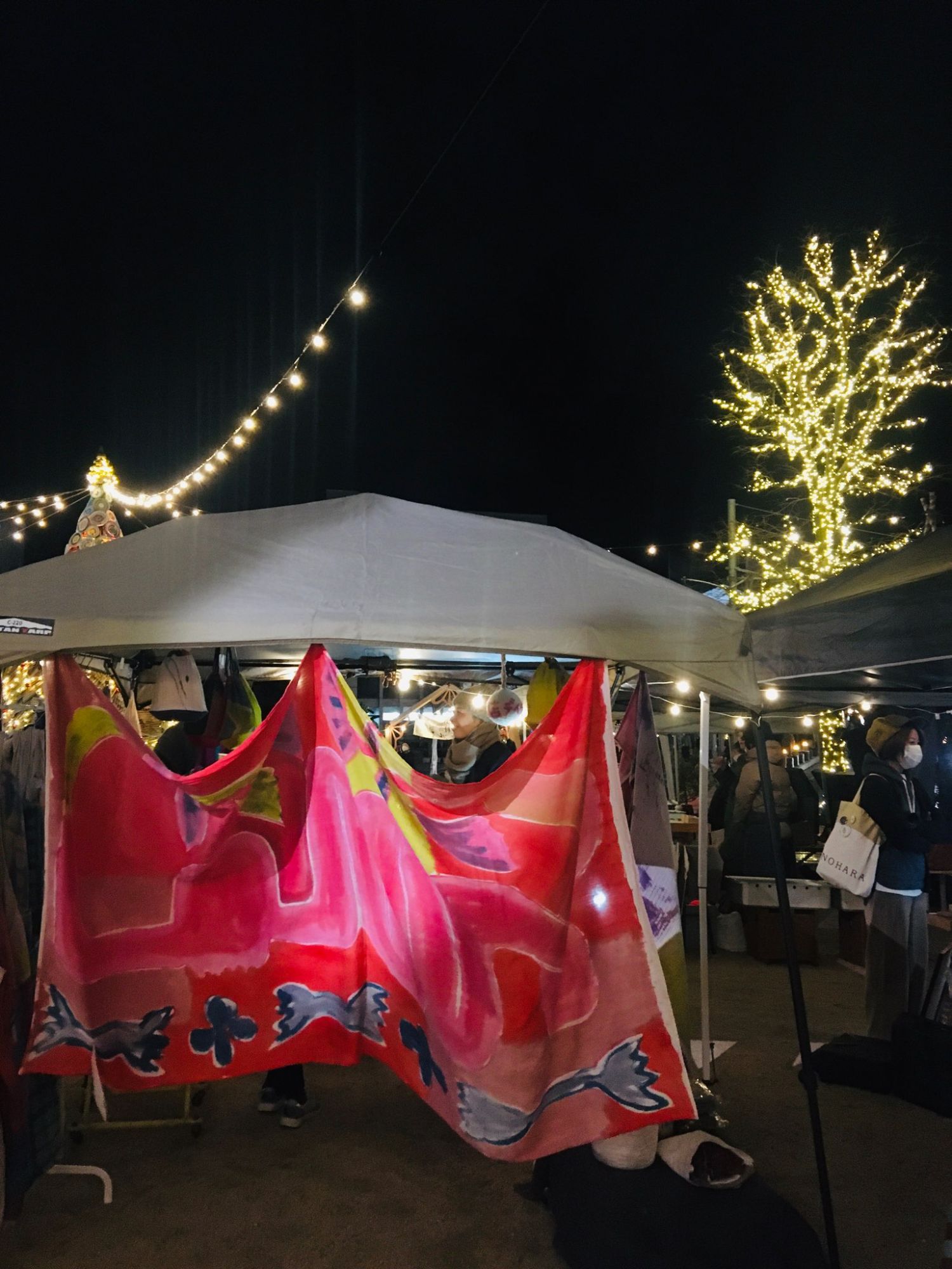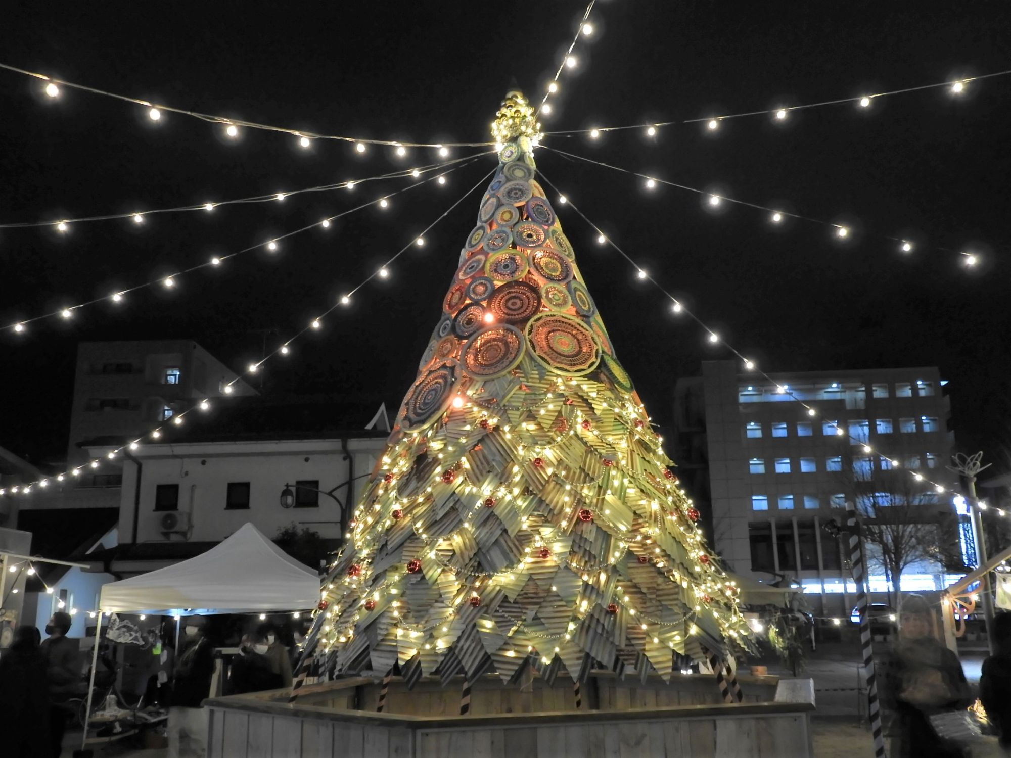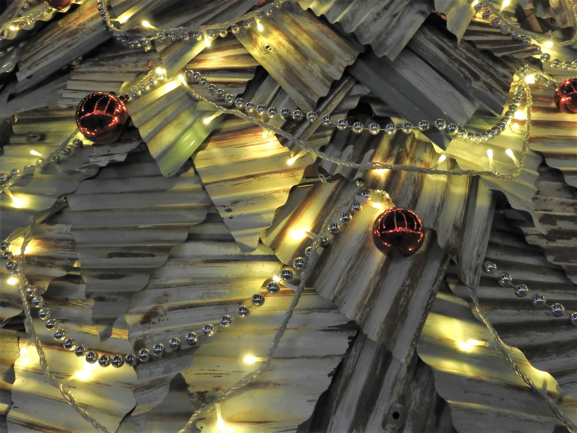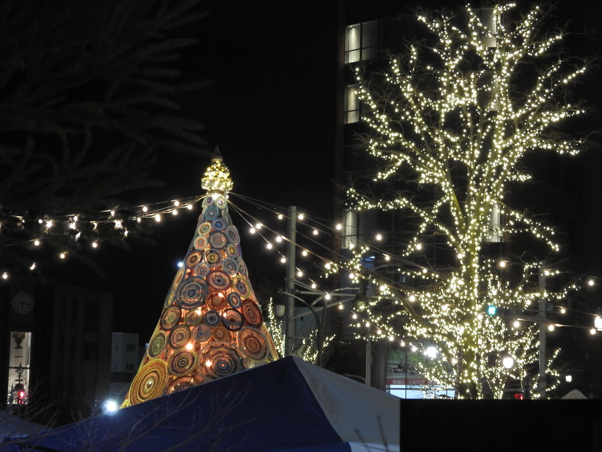 Neben der Nawate-Straße gibt es sogar einen kleinen, alternativen Weihnachtsmarkt. Der imposante Weihnachtsbaum in der Mitte des Marktplatzes besteht aus Wellblech und anderen recycelten Materialien. So kreativ!