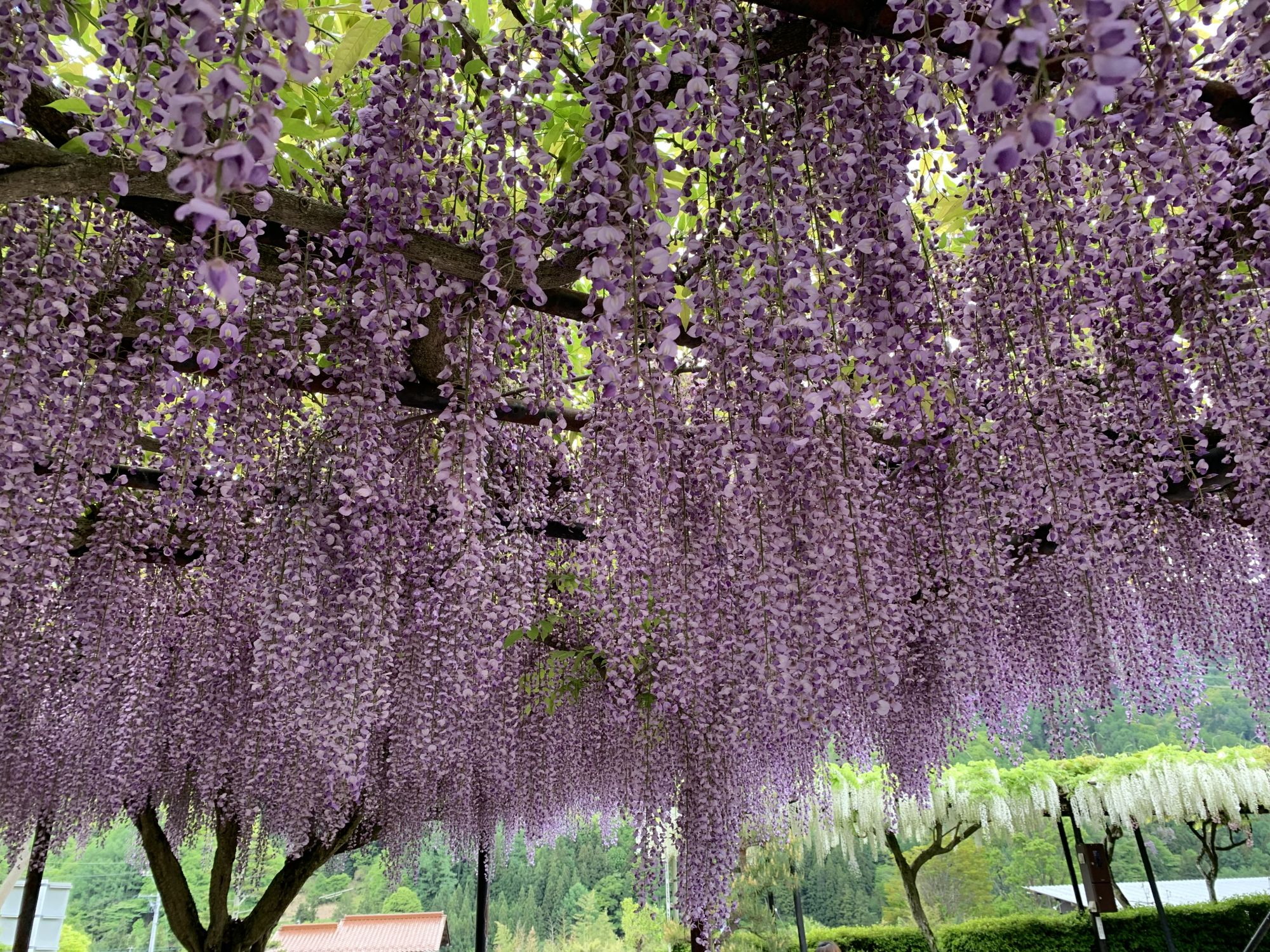 Der japanische Blauregen, auch Glyzinie oder Wisteria genannt, blüht im Monat Mai in japanischen Gärten oder auch wild in den Bergen. In Blau-Lila ist die verholzende Kletterpflanze häufig anzutreffen, doch im Tokuunji-Tempel kann man diese auch in pink und weiß bewundern.