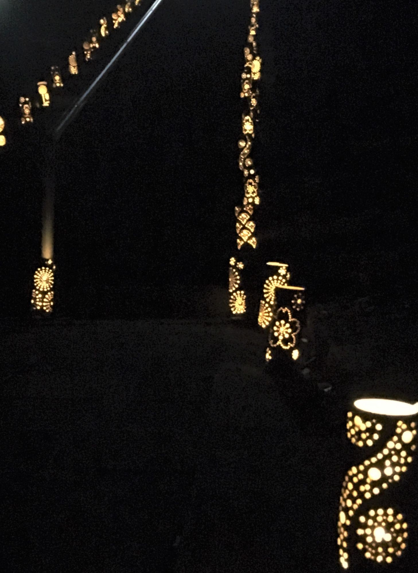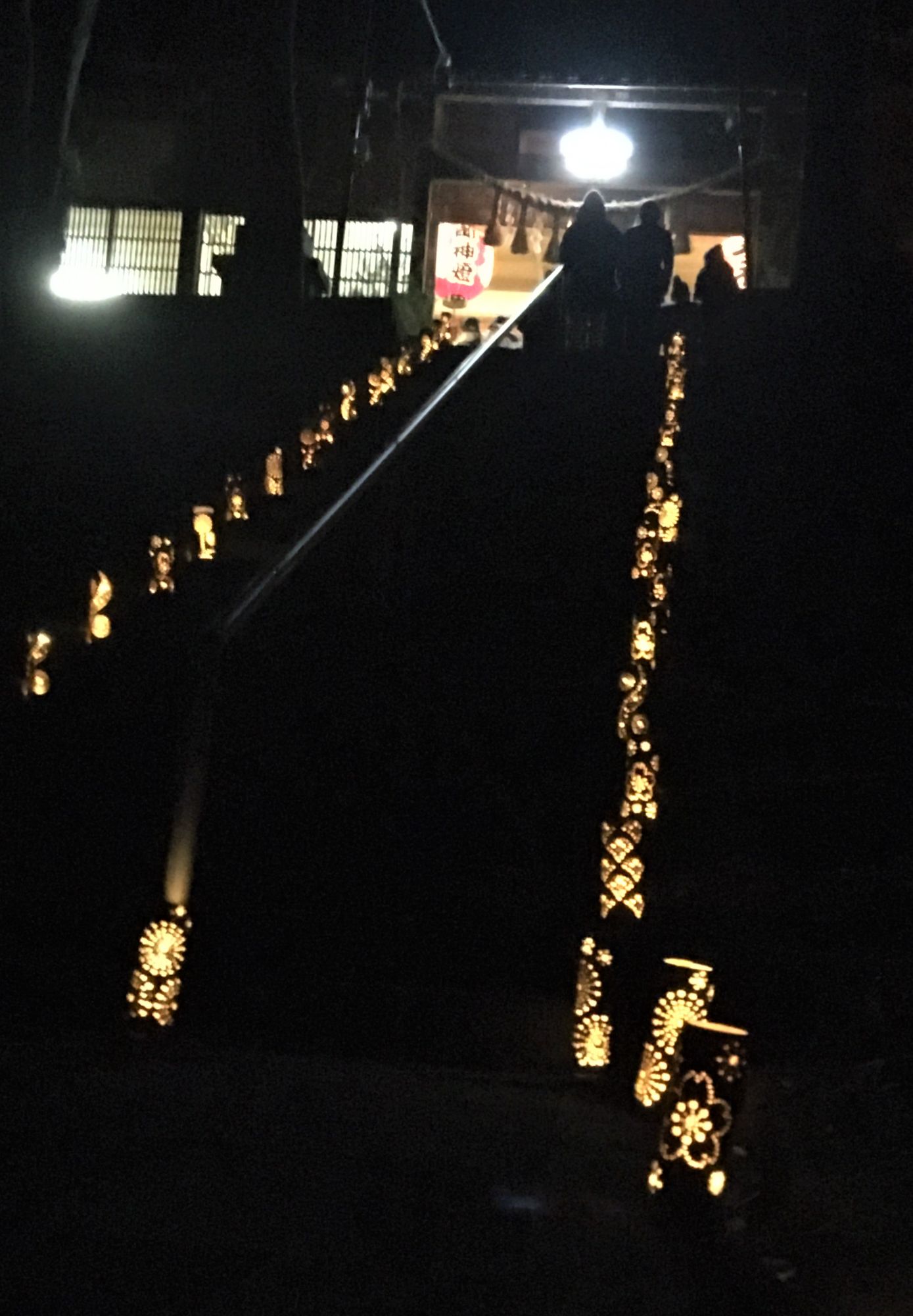 Am Misa-Schrein, den wir bereits vom Taimatsu-Fest kennen, wird denjenigen, die die steilen, mit Bambuslichtern geschmückten Treppen hinaufsteigen und sich vor dem geschmückten Altar verbeugen, Sake serviert.