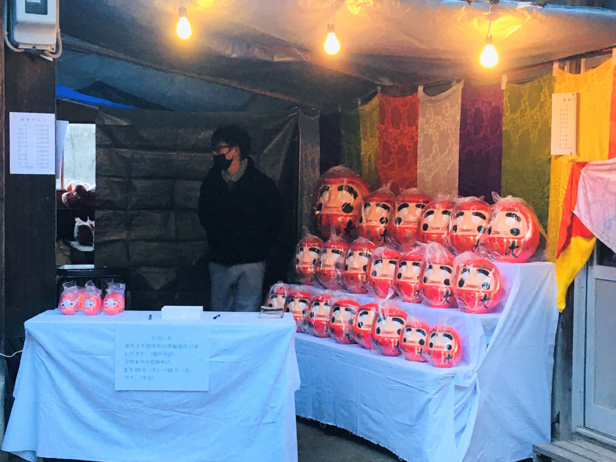 Wer nicht schon in der Nacht am Schrein war, holt das jetzt nach. Man weiß um die vielen Besucher und in der Nähe von Schreinen versammeln sich viele Stände, an denen man zum Beispiel Daruma kaufen kann.