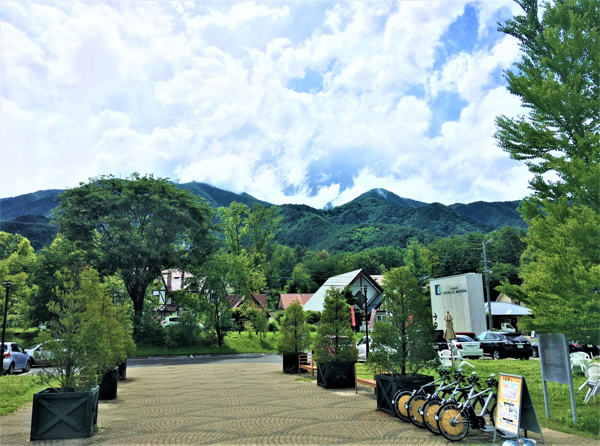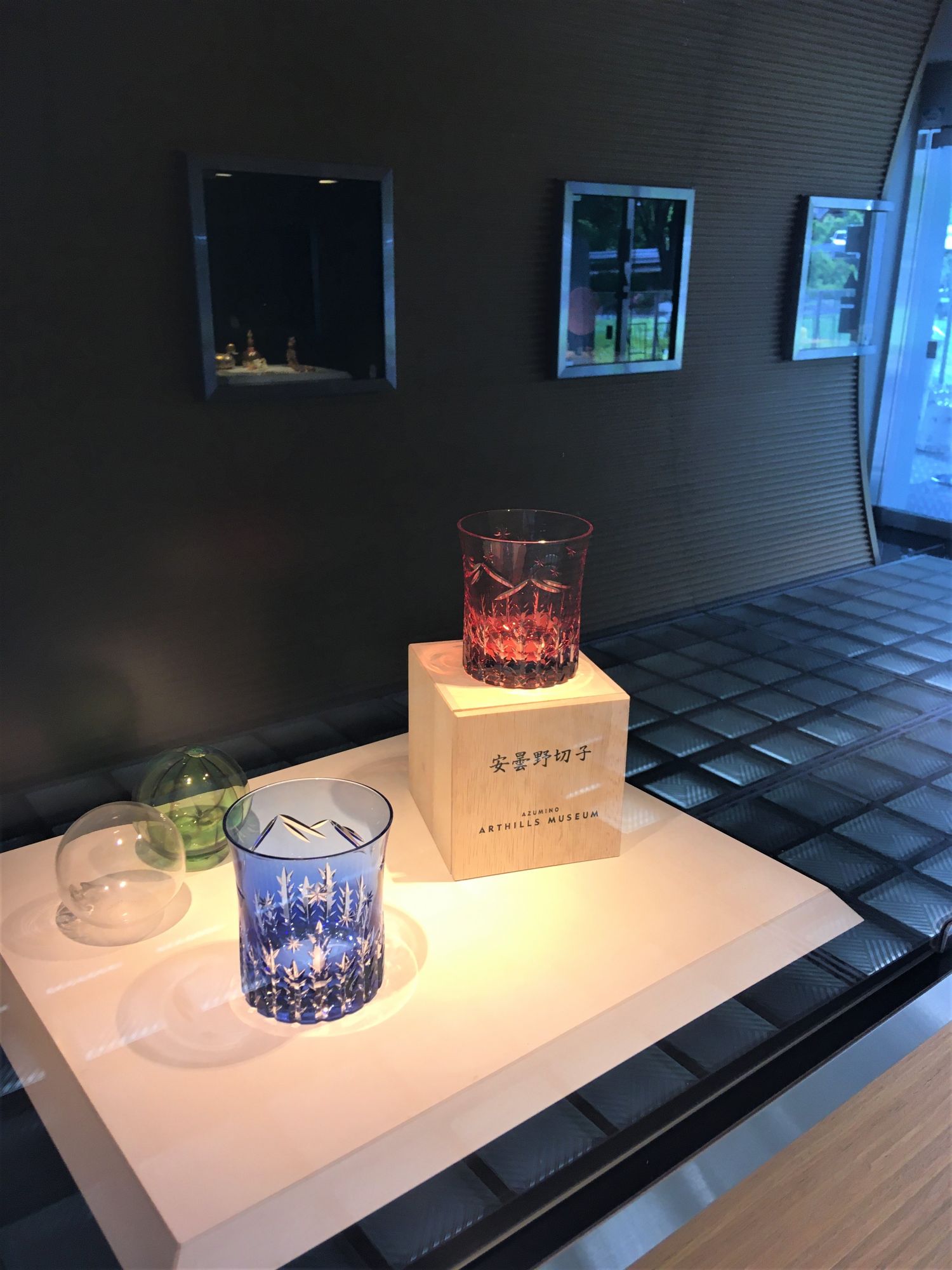 Umgeben von grünen Bergen, ragt ein kleiner Louvre auf einem Dach hervor, hier ist der Eingang zum Azumino Arthills Museum, in dem es die größte Auswahl an regionaler und internationaler Glaskunst in der Region gibt.