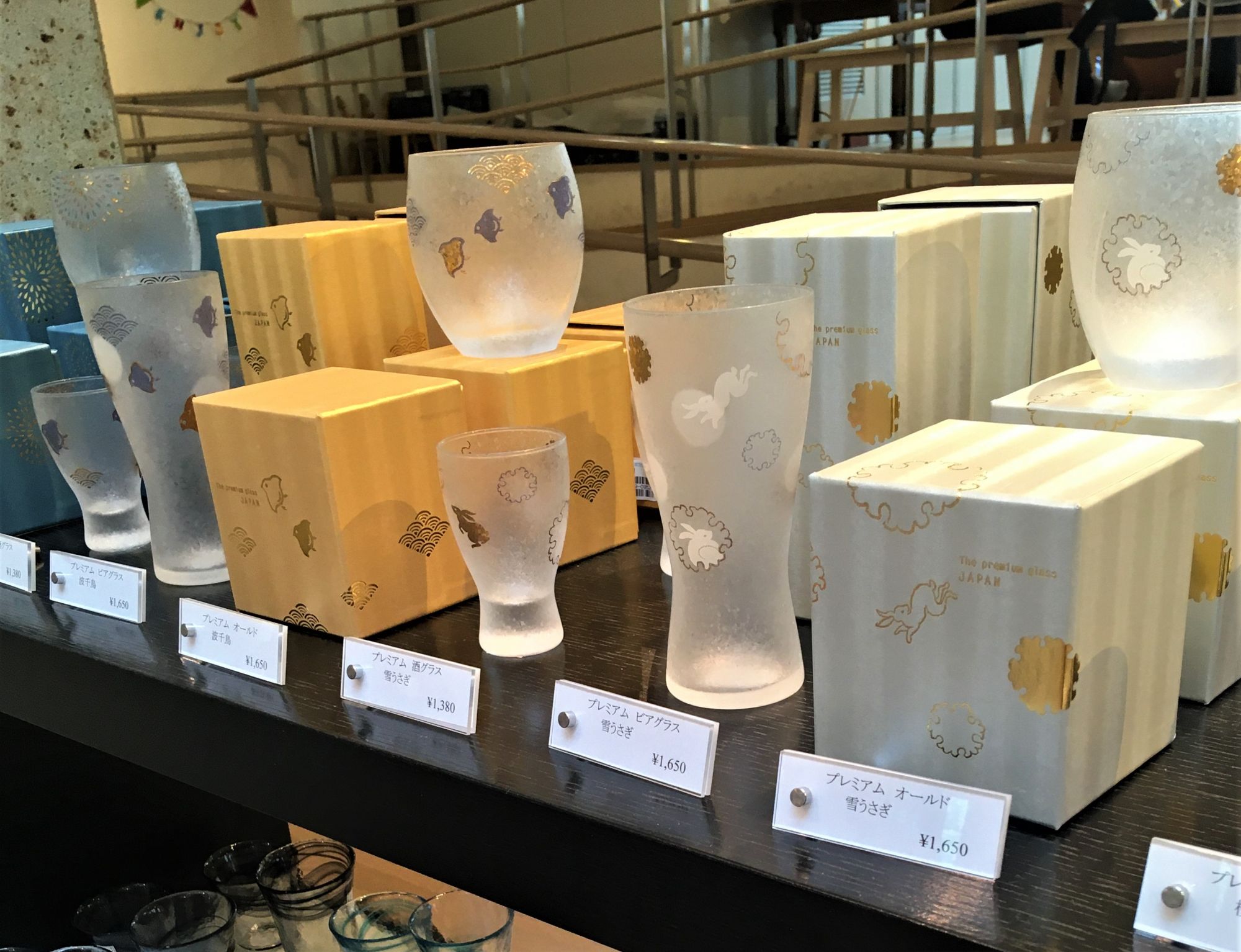 Mein absoluter Favorit sind die Trinkgläser mit japanischen Motiven wie z.B. Feuerwerk mit Goldfisch, Sakura oder japanischer Schneehase.