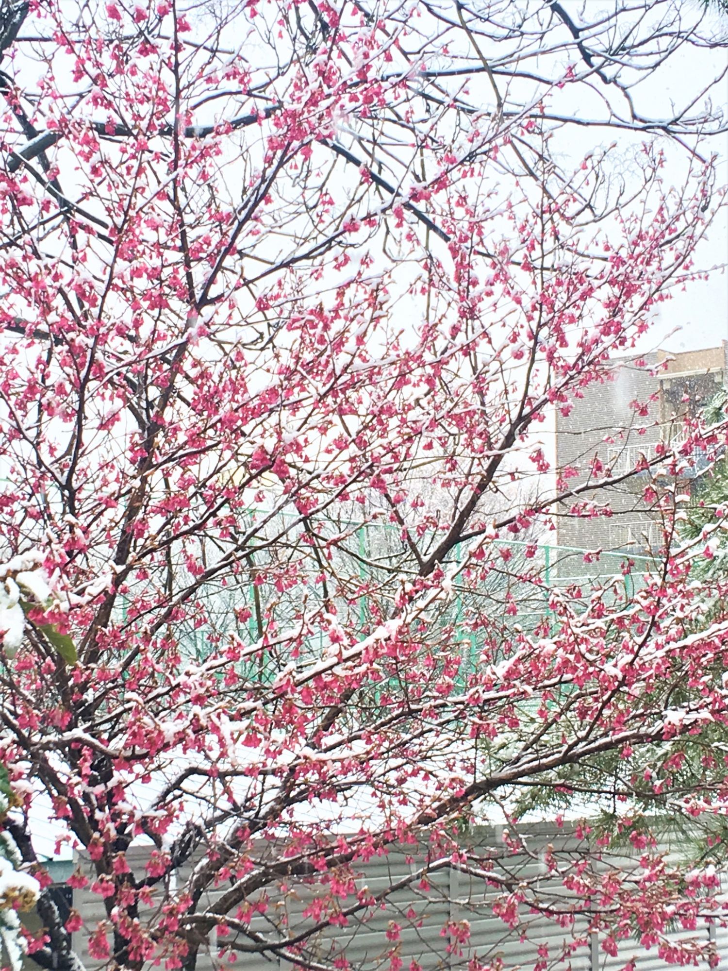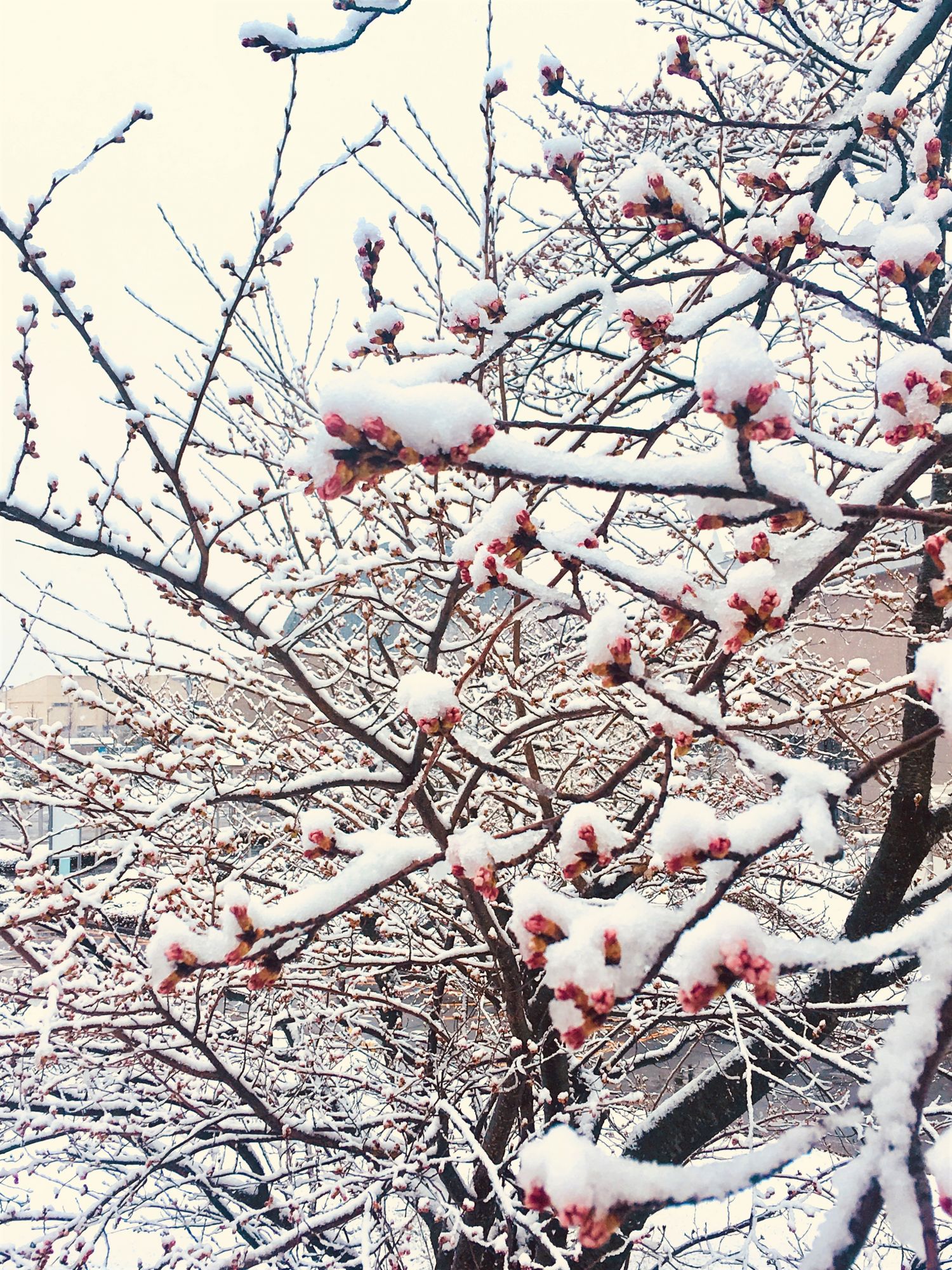 Am Fuße der Japanischen Alpen blühen die Kirschblüten später als in Tokyo oder Kyoto. Nachdem sich endlich die ersten Sakura-Knospen gezeigt haben, hat es geschneit und es sah wunderschön aus, wie der Schnee die rosa und pinkfarbenen Knospen bedeckt hat.