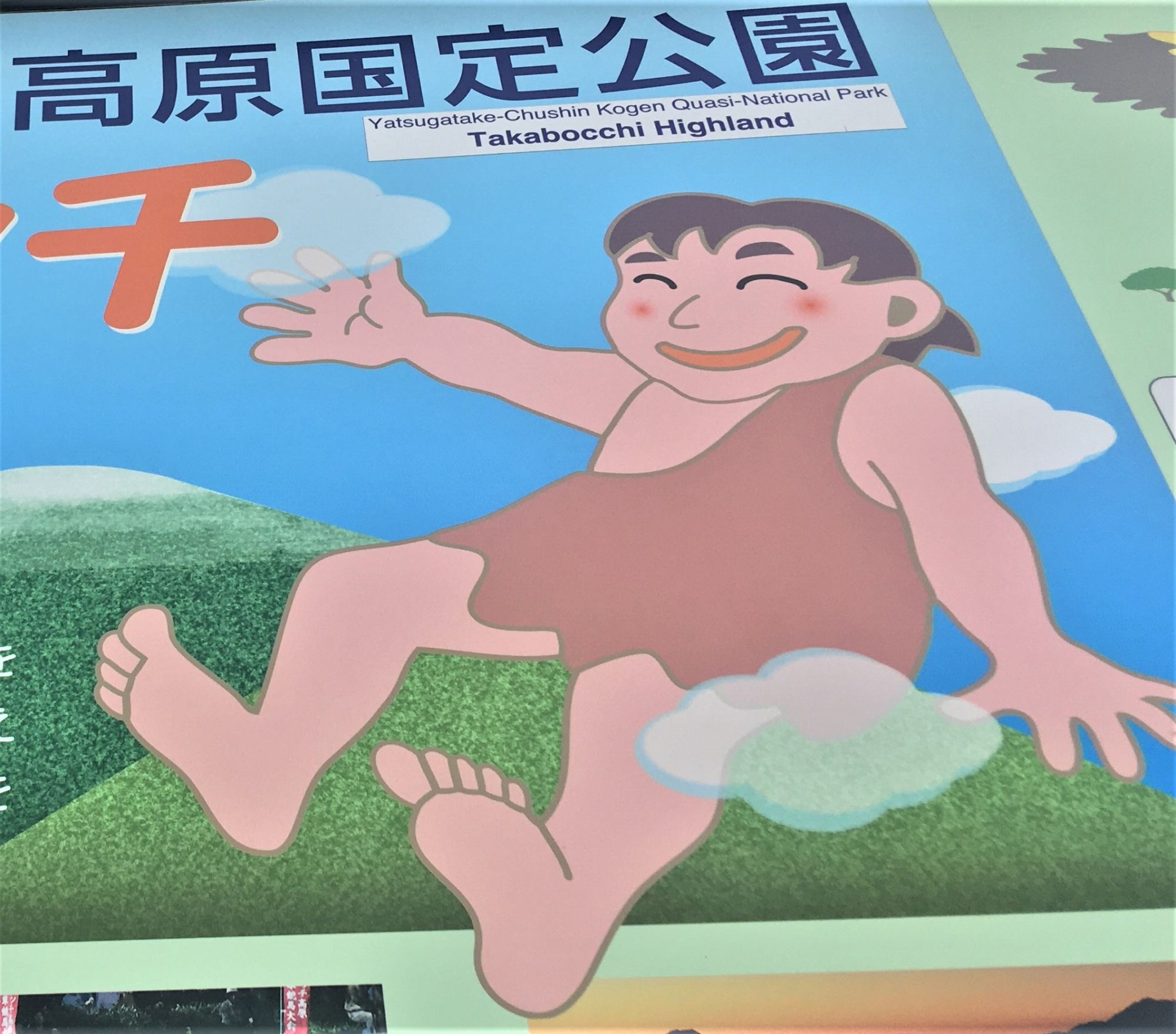 Das Plateau liegt in 1665m Höhe. Einer Legende nach machte der Riese Daidara Bocchi eine Pause auf dem Berg und wo er sich hinsetzte hinterließ er einen Abdruck, das Takabocchi Plateau. Der Gipfel besteht aus einem ausgedehnten Grasland mit sanft geschwungenen Hügeln. Je nach Jahreszeit und Wetterbedingung kann man vor hier spektakuläre Aussichten genießen. Bei klarer Sicht hat man einen 360-Grad-Blick auf die Japanischen Nord- und Südalpen, man kann den Suwa See und sogar den Fujisan sehen.