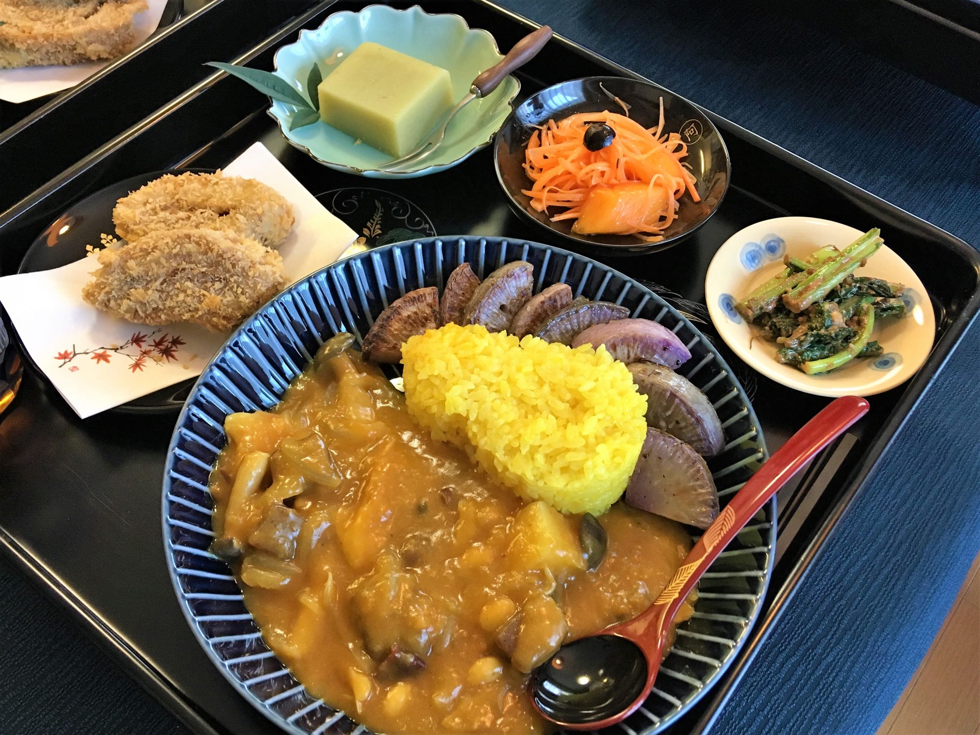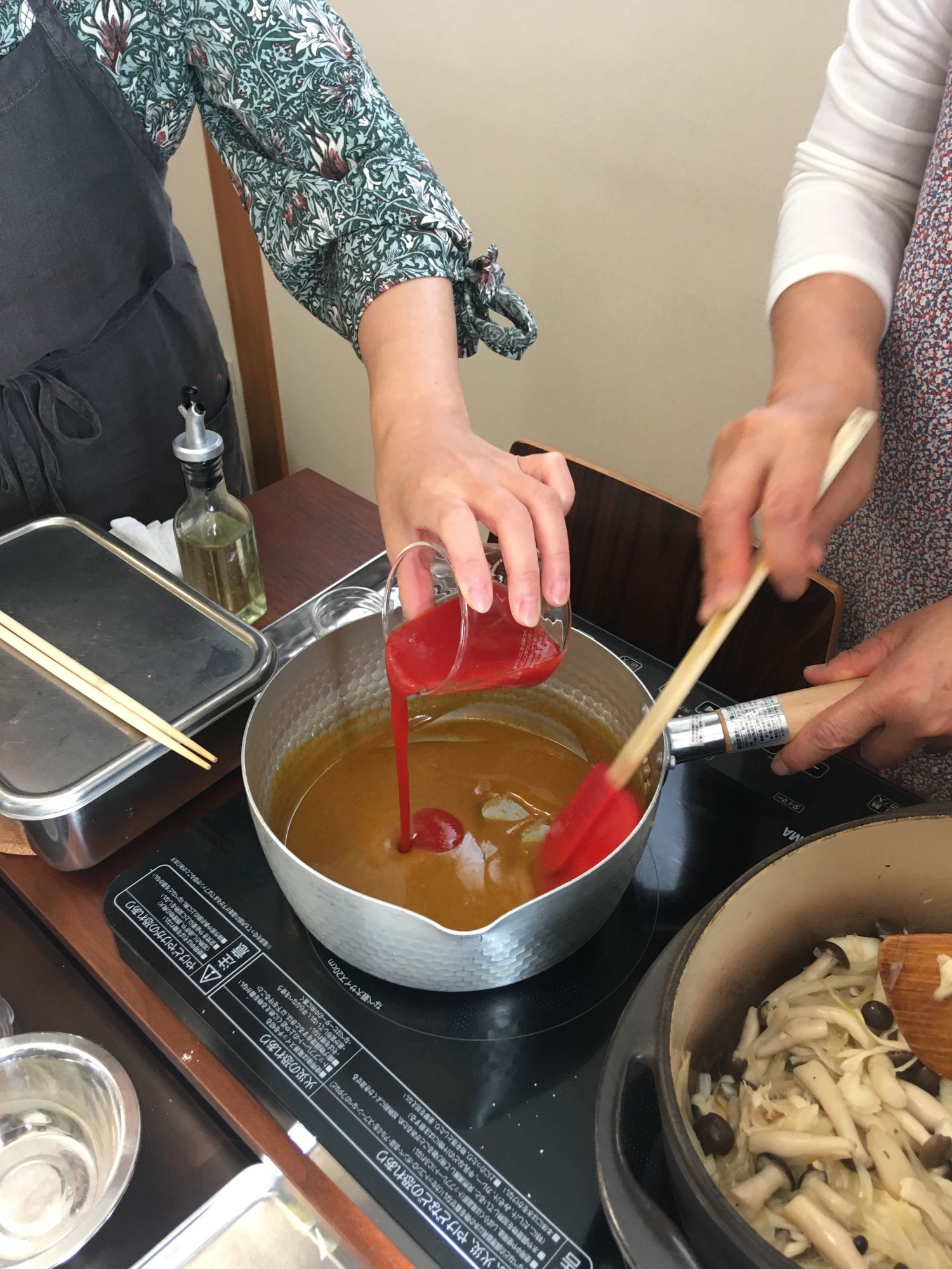 Zwei bis dreimal im Monat finden im Tōshōji Workshops statt. Der heutige Workshop dreht sich um Curryreis. Zu beginn des Workshops werden die Zutaten und Rezepte vorgestellt. Neben Curryreis stehen frittierte Seitan-Steaks, Möhren-Oliven-Kaki-Salat, Nozawa-Miso-Gemüsepfanne und als Dessert Süßkartoffelgelee (imo-yōkan) auf dem Programm. Wir sind fünf Teilnehmerinnen und eine Lehrerin und in ca. drei Stunden wird ein Menü gezaubert, das uns alle staunen lässt.
