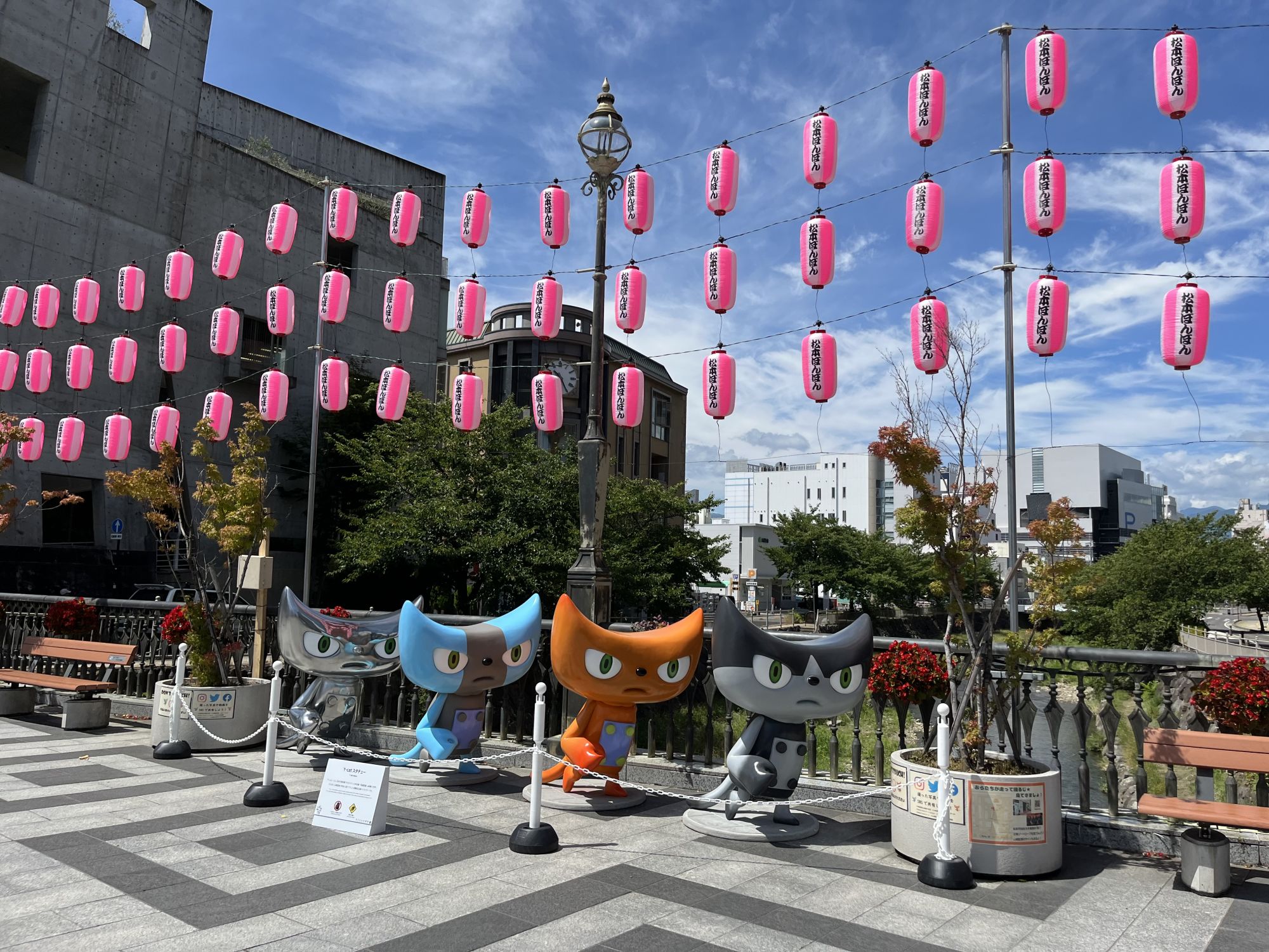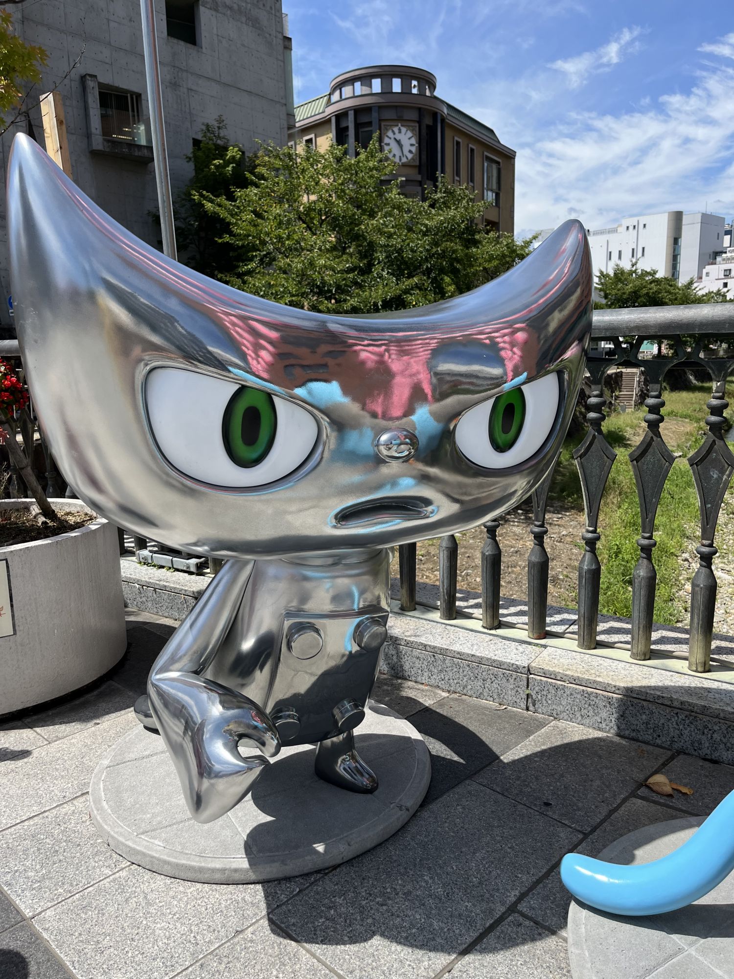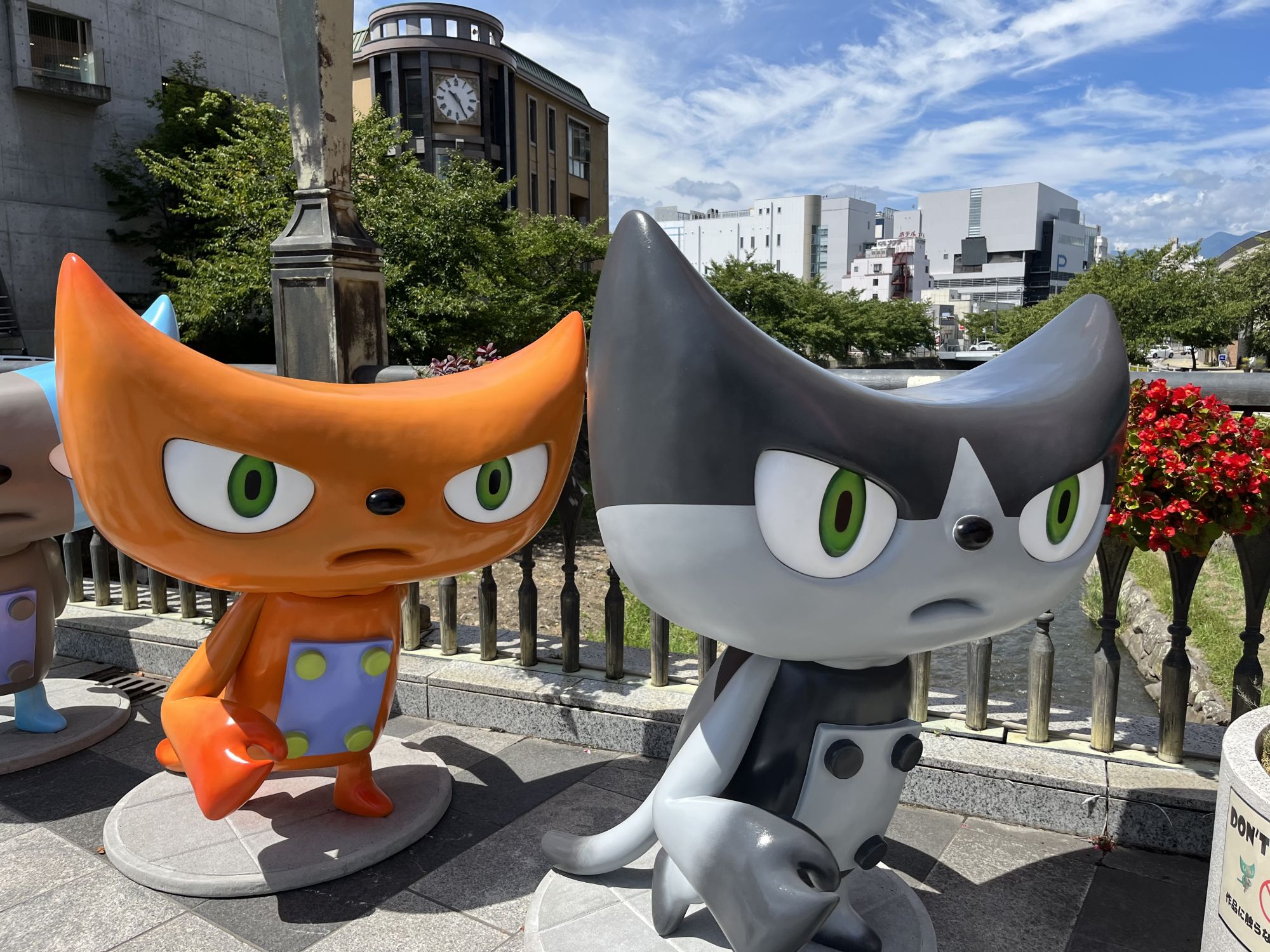 Dans le centre ville sur le pont Sensaibashi ou dans le parc extérieur du chateau, on peut retrouver quatre grandes statue de Y-cat, ces chats colorés qui servent de mascotte a l’univers du réalisateur.