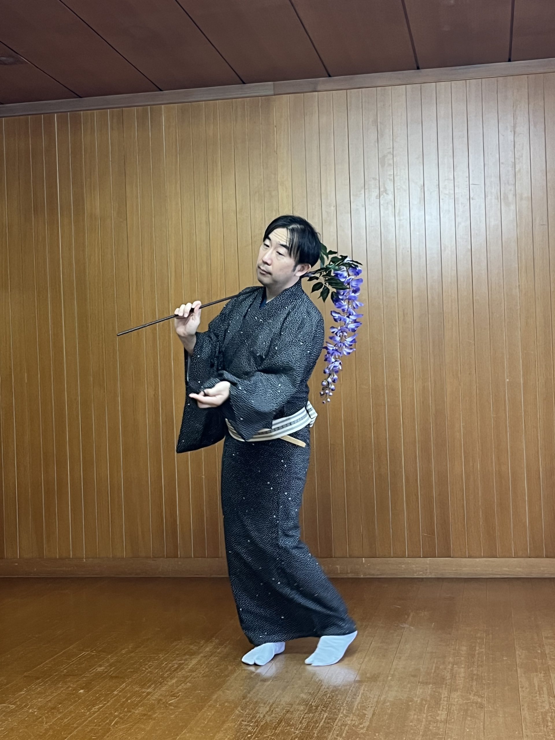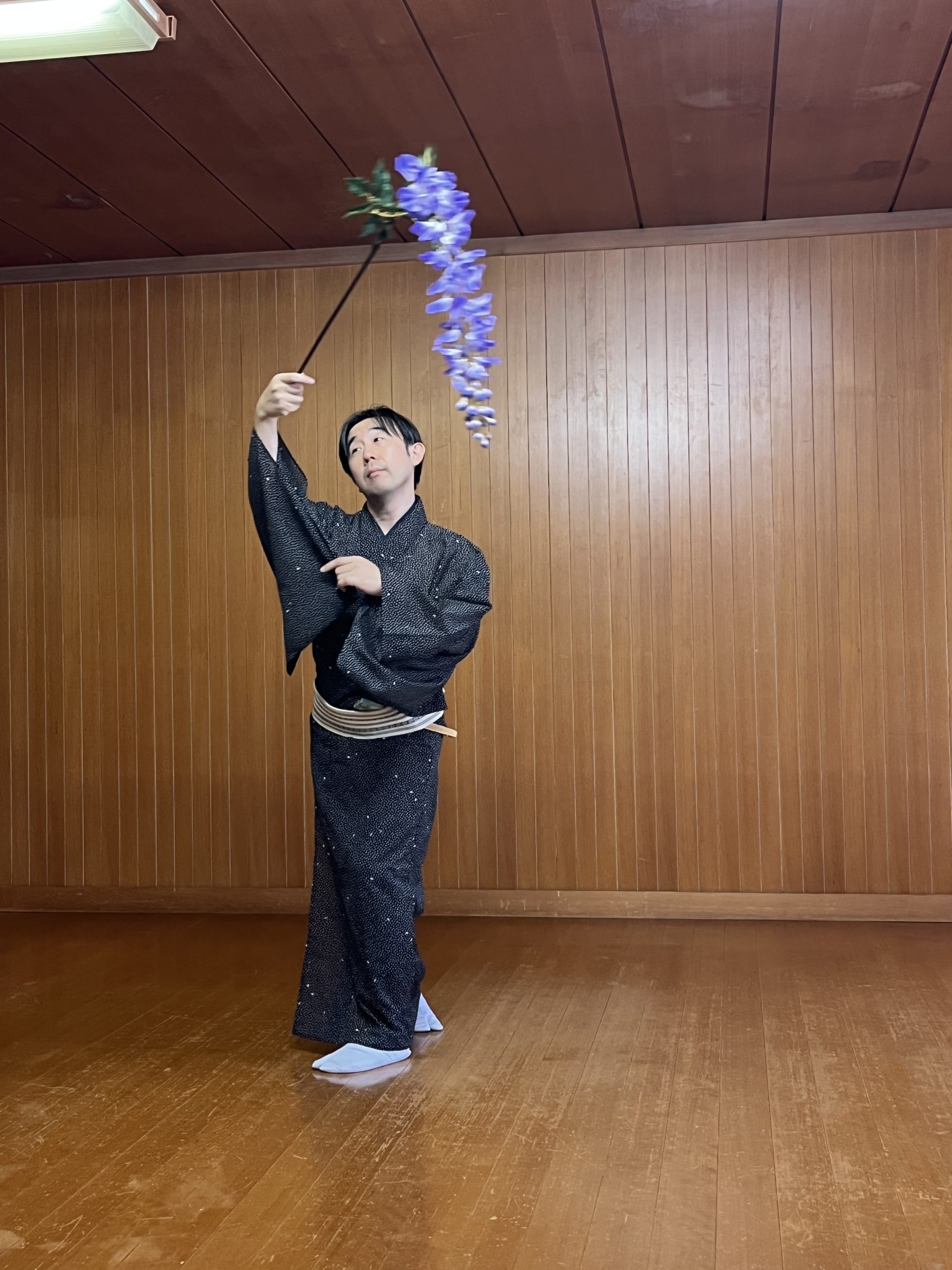 Après une introduction à l’art du Nihon Buyō, le maître des lieux s’est exécuté devant nous. Il nous a présenté deux danses : celle d’un homme armé et celle d’une femme portant une branche de glycine. En changeant l’expression du corps et du visage, il parvient à changer complètement de genre et l’enchaînement des deux performances n’en est que plus impressionnante .
