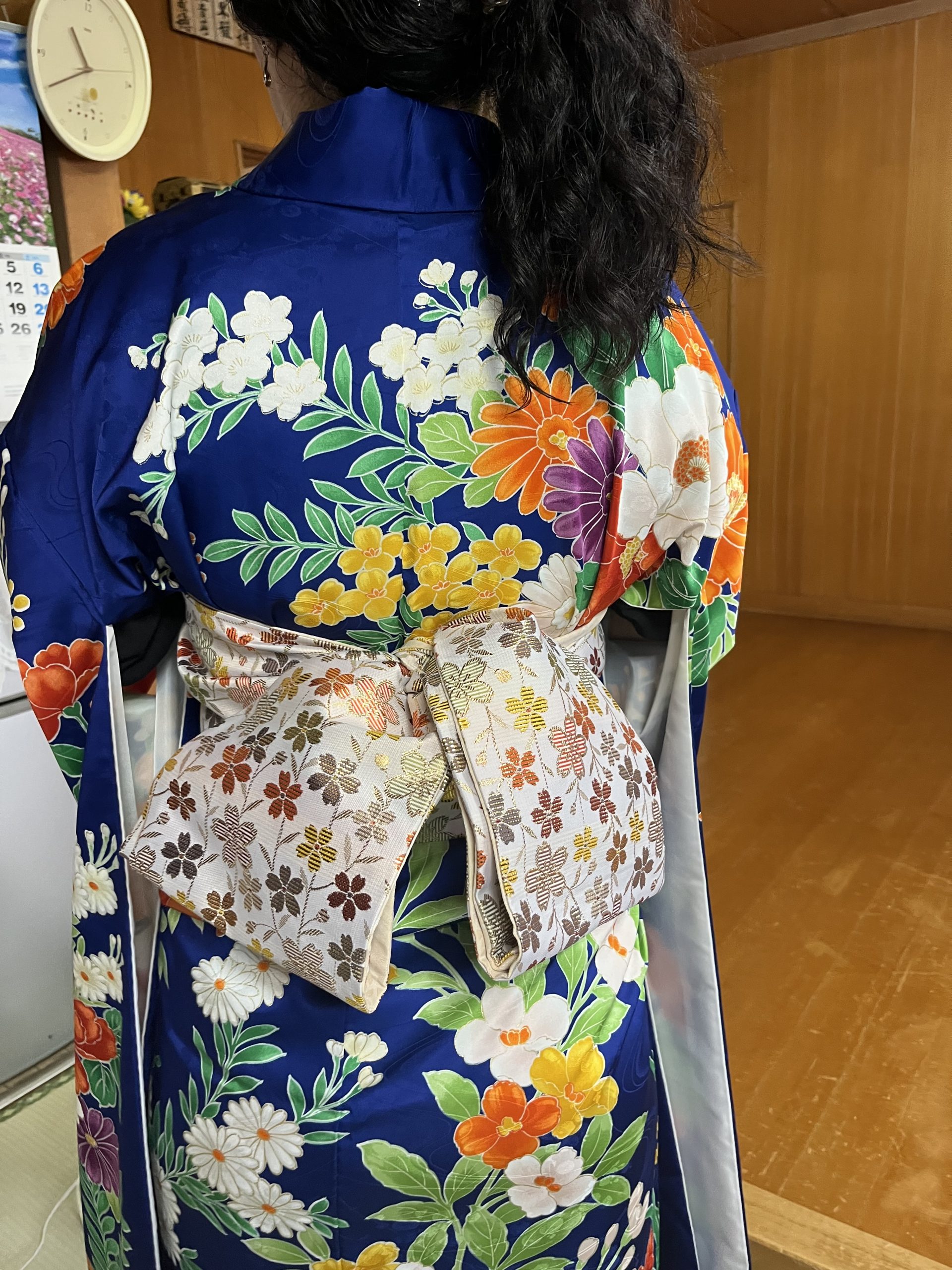 L’expérience a commencé par l’habillage. J’ai pu choisir un kimono parmi plusieurs aux couleurs et motifs variés : fleurs délicates, paysages symboliques ou tissus plus sobres. Se laisser habiller avec soin, sentir le tissu se poser sur soi, voir le nœud de l’obi se former dans le dos… c’est déjà une immersion culturelle à part entière. Porter un kimono change la posture, la démarche, et prépare à entrer dans l’univers du Nihon Buyō.