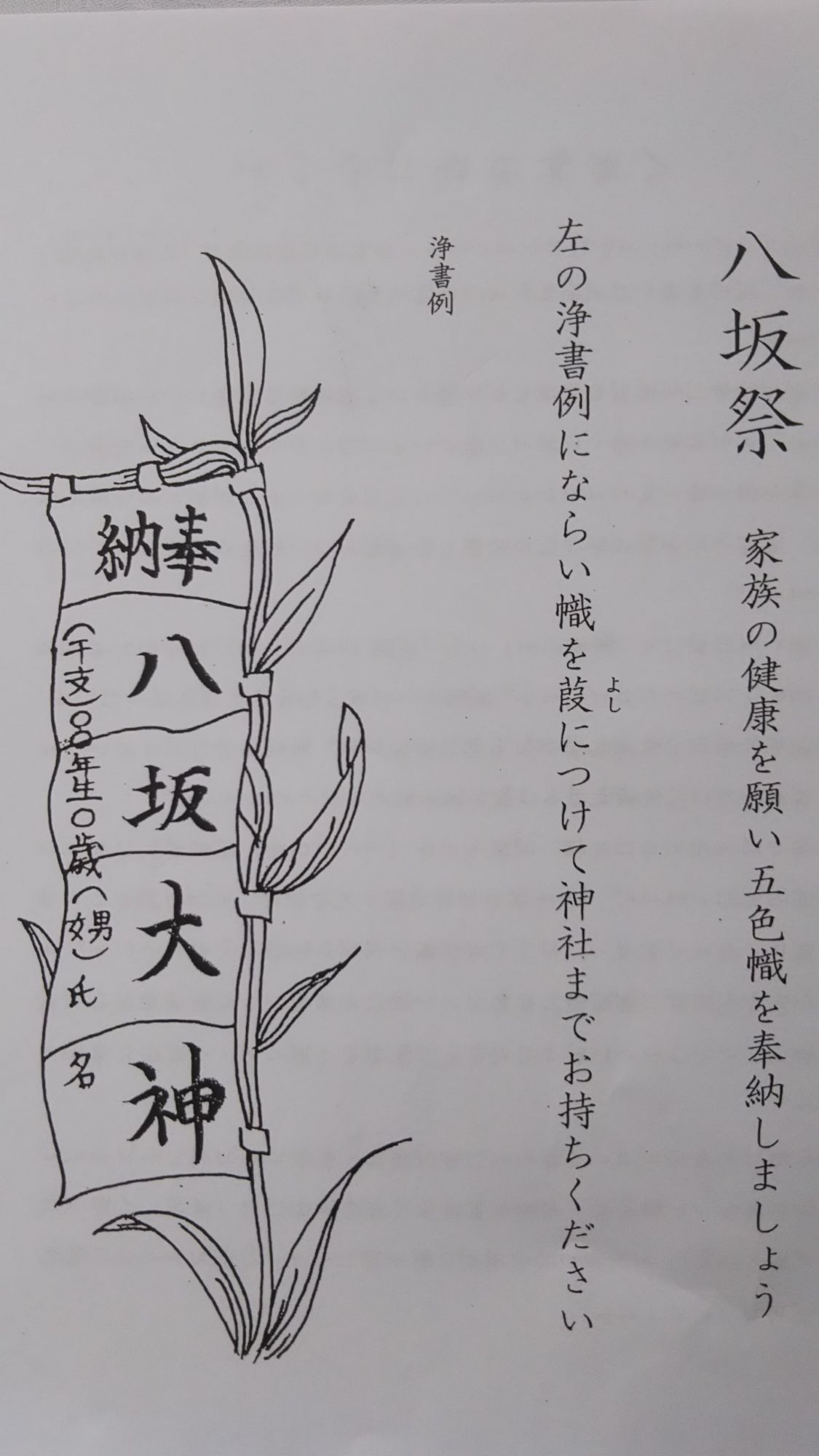Traditionnellement à destination des enfants, cette fête a évolué avec le temps et de nos jours, ce festival est célébré par l’ensemble des habitants de la ville, petits et grands. Ce jour-là, les habitants achètent une bannière composée de 5 couleurs différentes et où l’on écrit le nom du Dieu Yasaka Sama en gros sur la bannière puis, à gauche en plus petit, la date de naissance et le nom de la personne faisant le rituel. Une fois la bannière remplie, on pose cette dernière devant le temple puis une prière est effectuée.