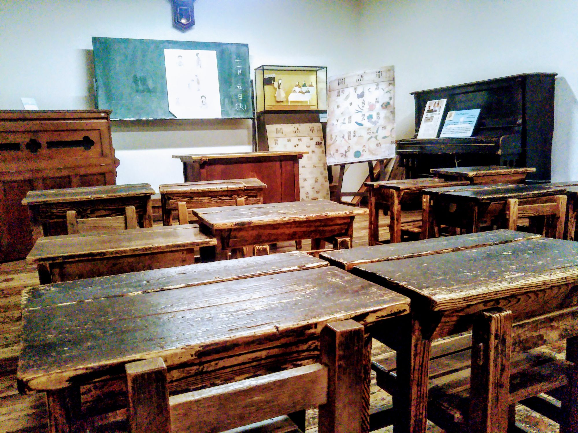 En visitant l’intérieur de l’école, c’est un véritable retour sur les bancs d’écoles qui vous attends. Les couloirs et salles de classes ressemblent étonnamment à ce que nous pouvions trouver chez nous à cette même époque. Seules les fournitures scolaires utilisés vous rappelleront que vous êtes bien au Japon !