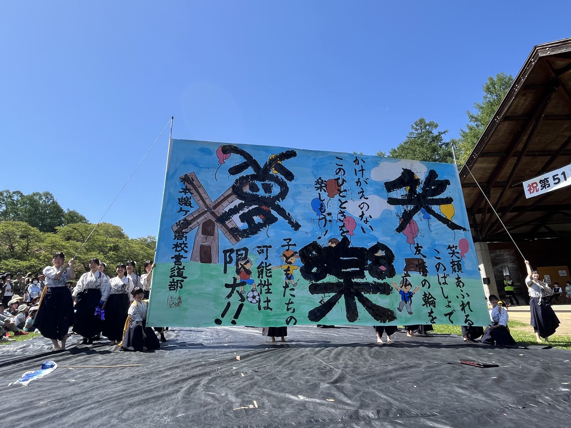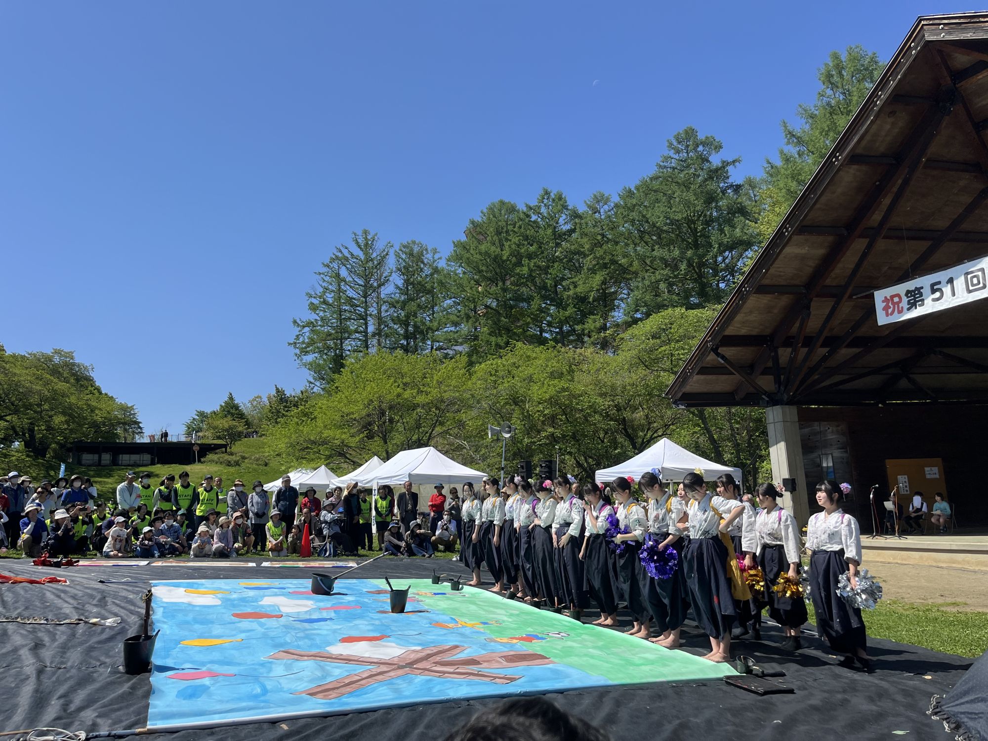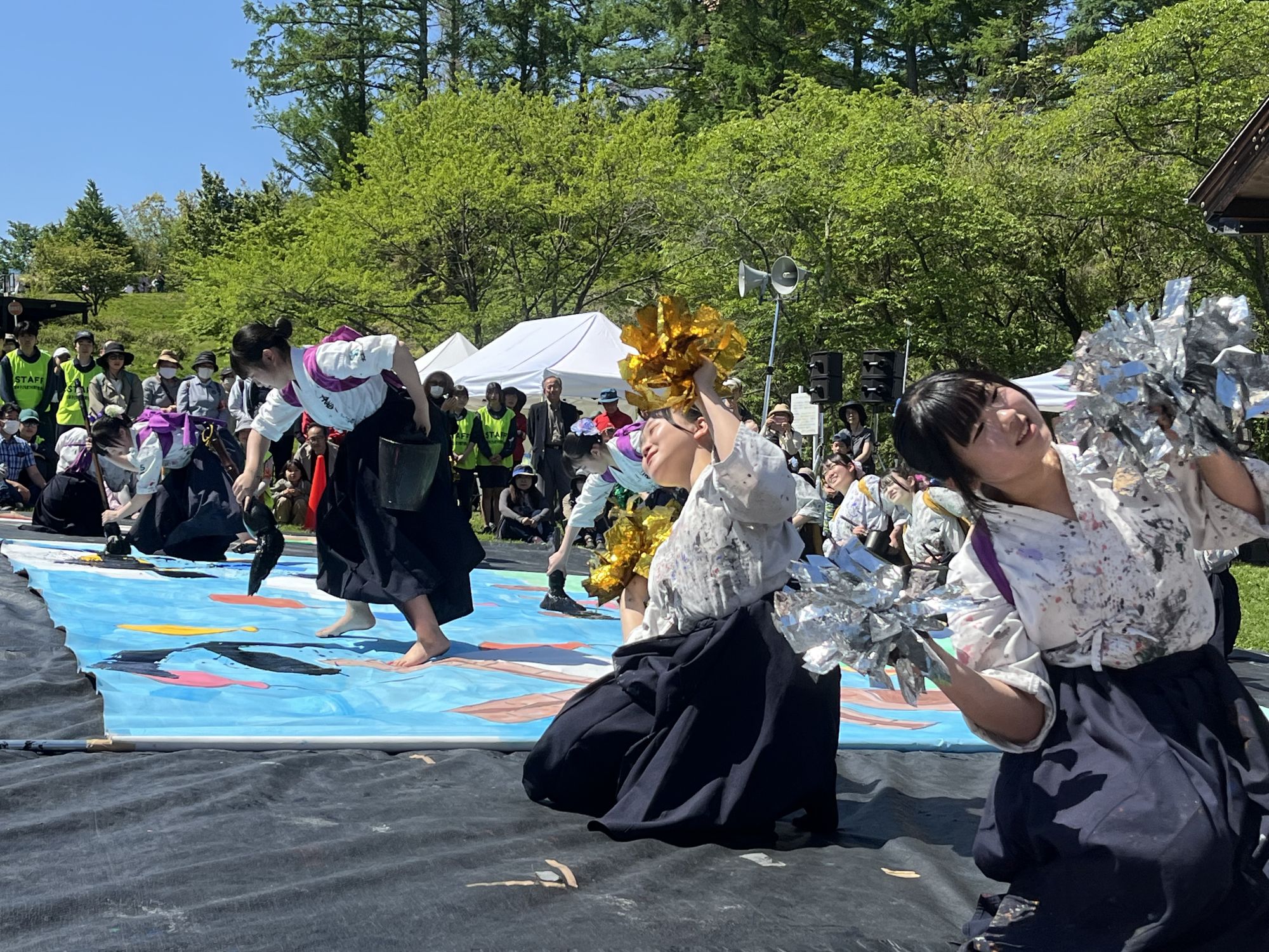 A 9h30, c’est le club de calligraphie du lycée d’Arigasaki qui sonne le début des festivités avec une performance de calligraphie géante effectuée en musique et en dansant.