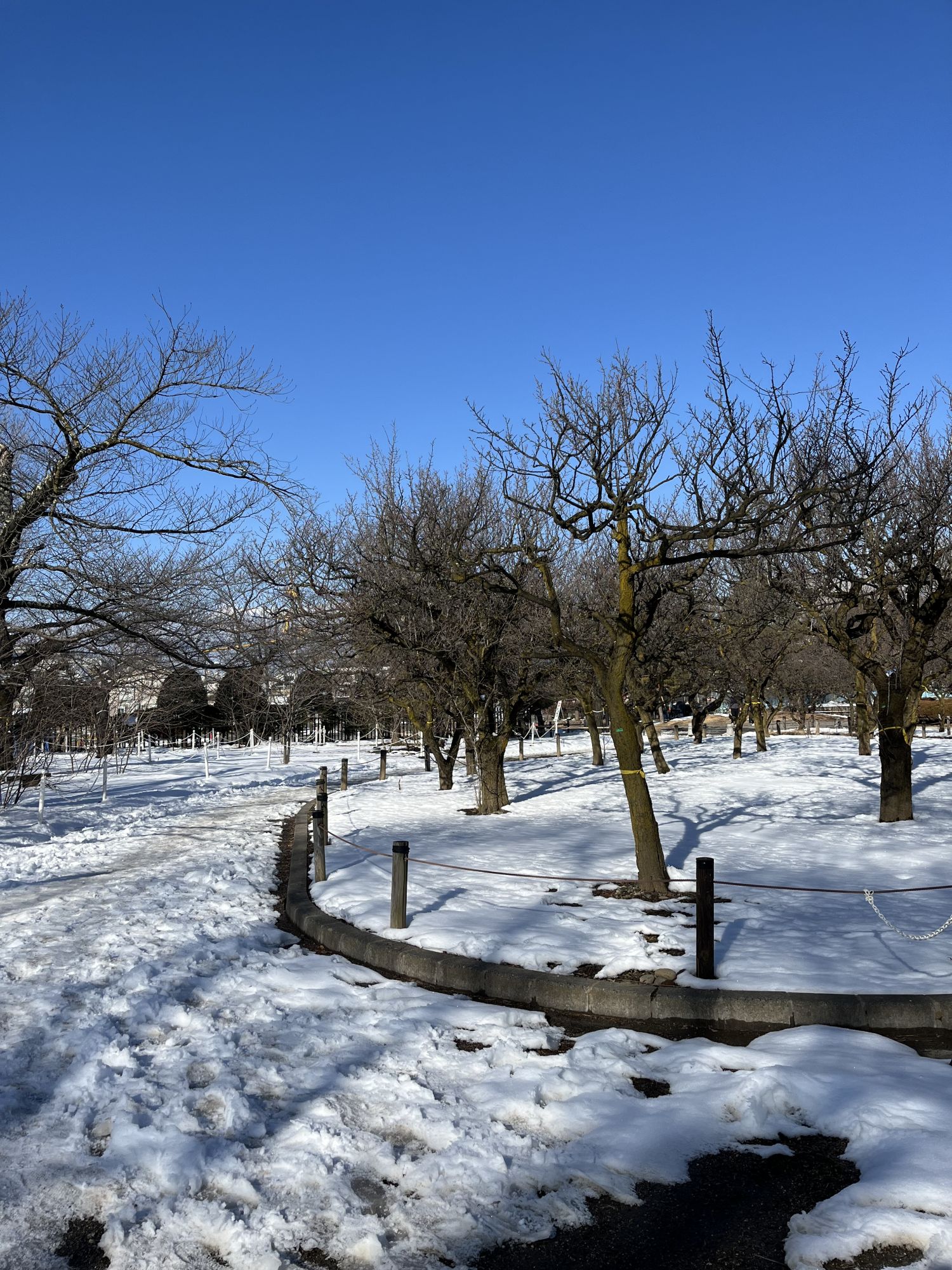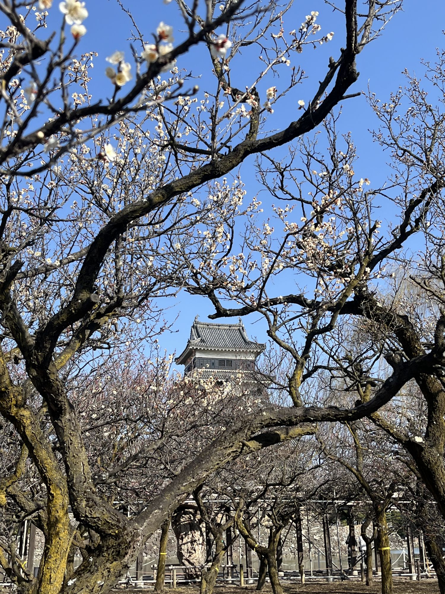 A 5min à pieds, on arrive à l’entrée Nord du domaine du château . Alors que les pruniers du sud du Japon sont en pleine floraison, ceux du château de Matsumoto ont encore les pieds dans la neiges. Les douves sont régulièrement recouvertes de glace et on peut observer les carpes nager sous la fine couche de glace.