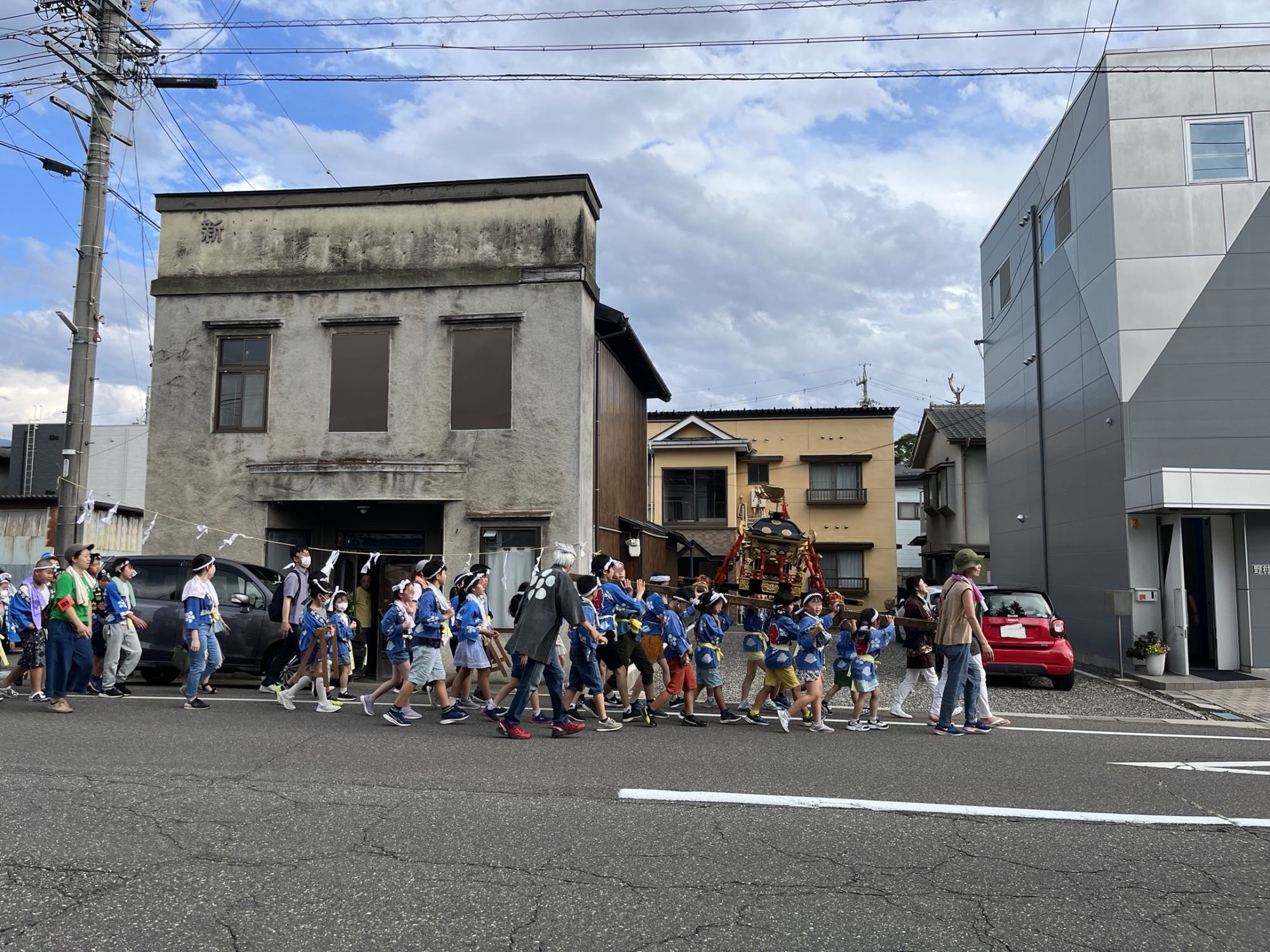 Le premier jour, ce sont des enfants d’école primaire qui se réunissent pour transporter à travers les rues du quartier le « o-mikoshi », une sorte de palanquin divin qui accueille symboliquement « l’esprit du kami », la divinité qui est protégée par le sanctuaire. Ces petits sanctuaires portatifs sont très travaillés et décorés et peuvent peser très lourd. Ils se portent sur l’épaules à l’aide de poutres et les participants doivent s’y mettre à plusieurs s’ils veulent pouvoir le soulever.