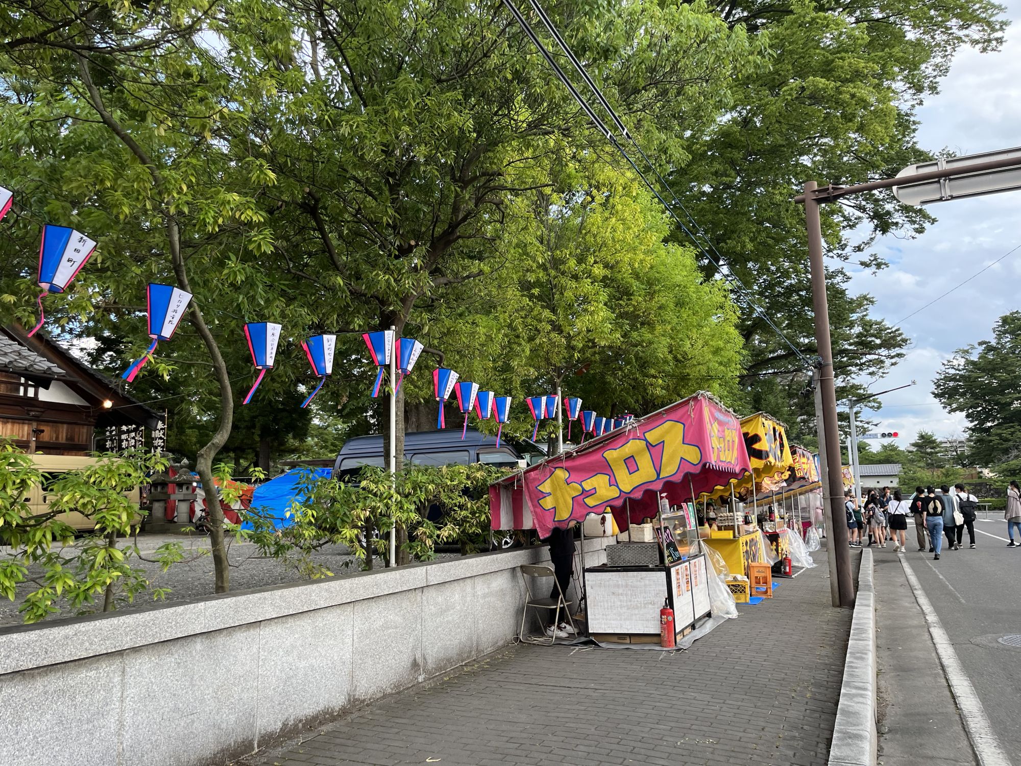 Comme pour la plupart des matsuri, le sanctuaire accueille de nombreux stand de nourriture festive. On y retrouve les traditionnels takoyaki (boulettes de poulpe), karaage (poulet frit), yakisoba (nouilles frites) ou meme des brochette de calamars grillés. Pour le dessert, vous avez le choix entre bananes au chocolat, crêpes ou coupes de glace pilée, le fameux « kakigori ».