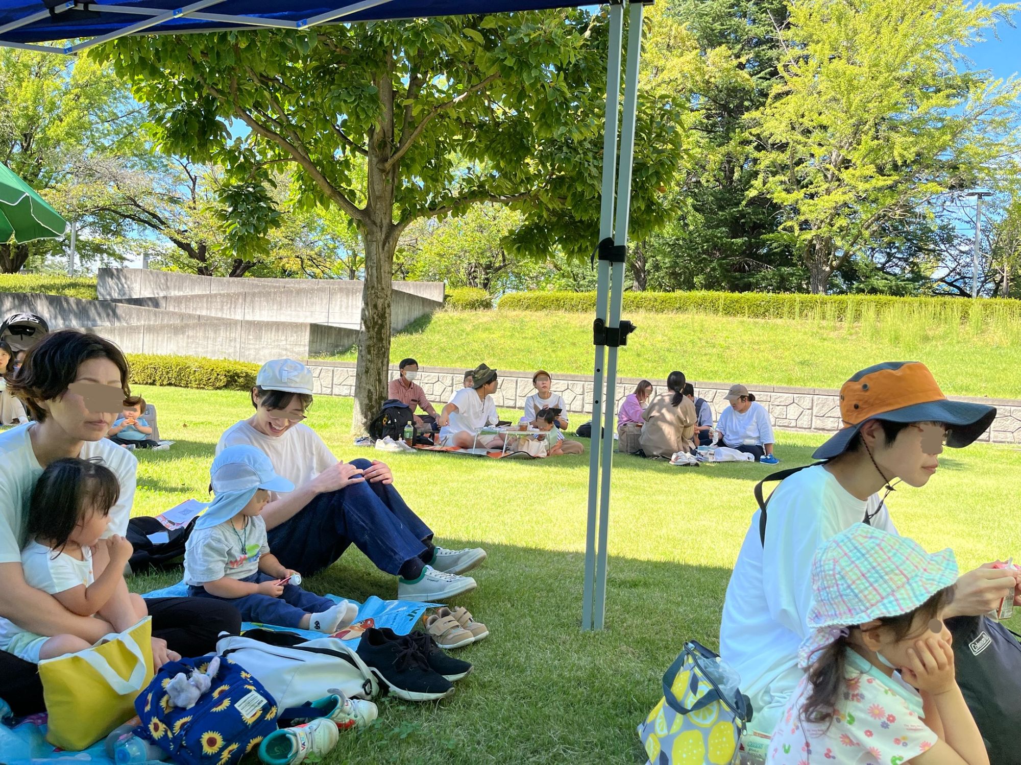 Des tentes ont été installées pour se protéger du soleil ou d’une éventuelle averse, et chacun est invité à venir s’installer sur l’herbe avec son petit tapis et son bento, panier repas en japonais.