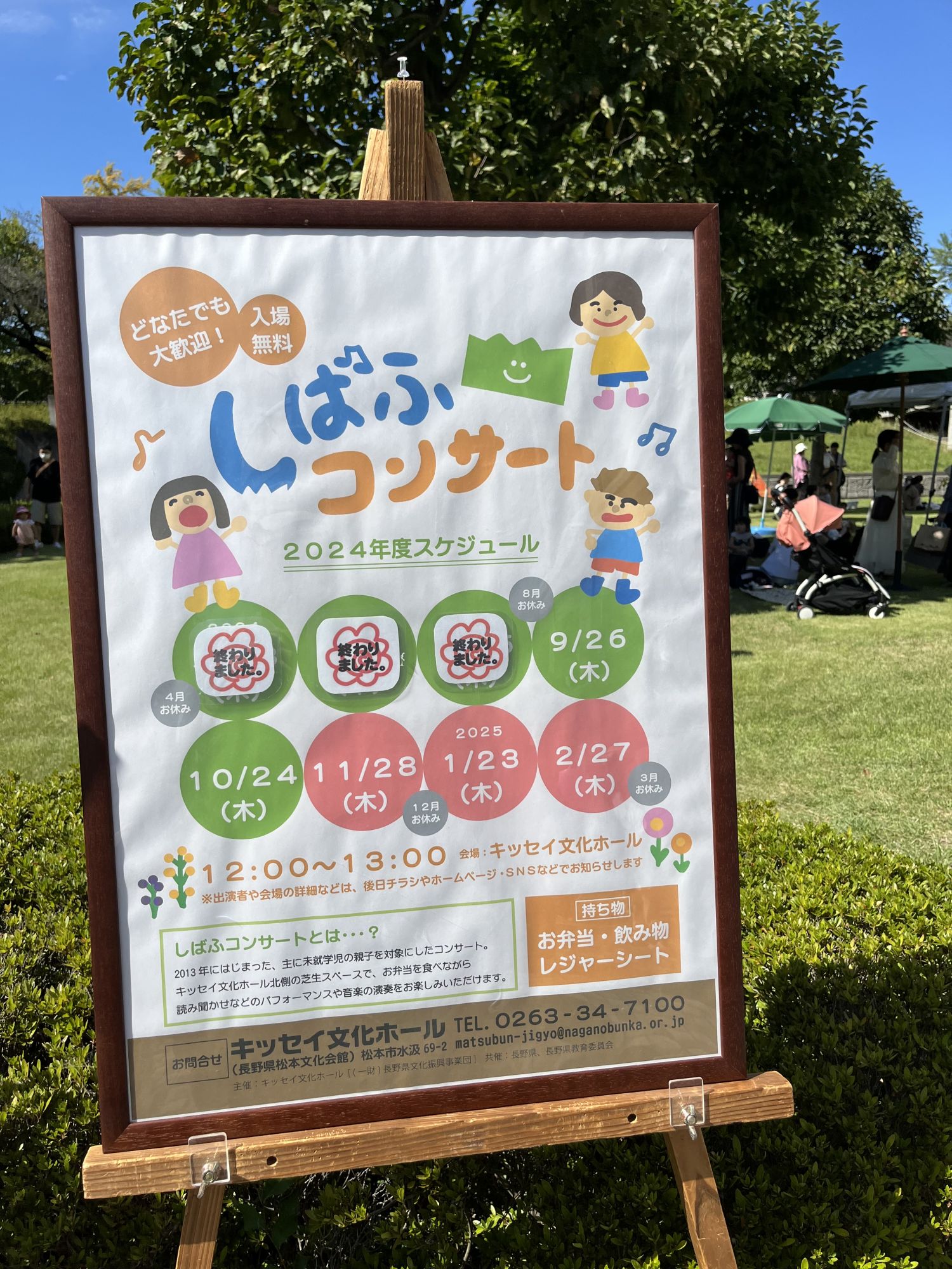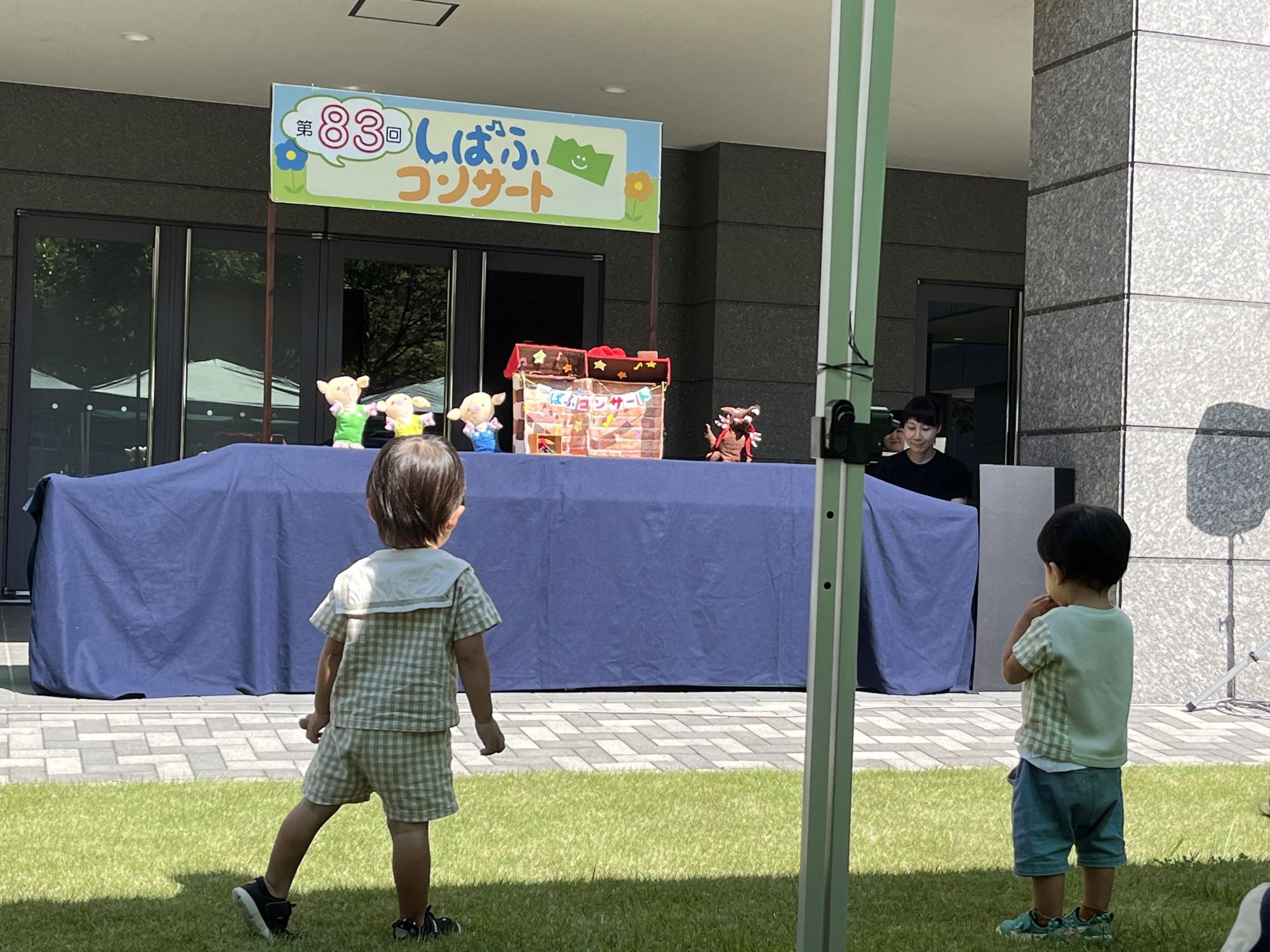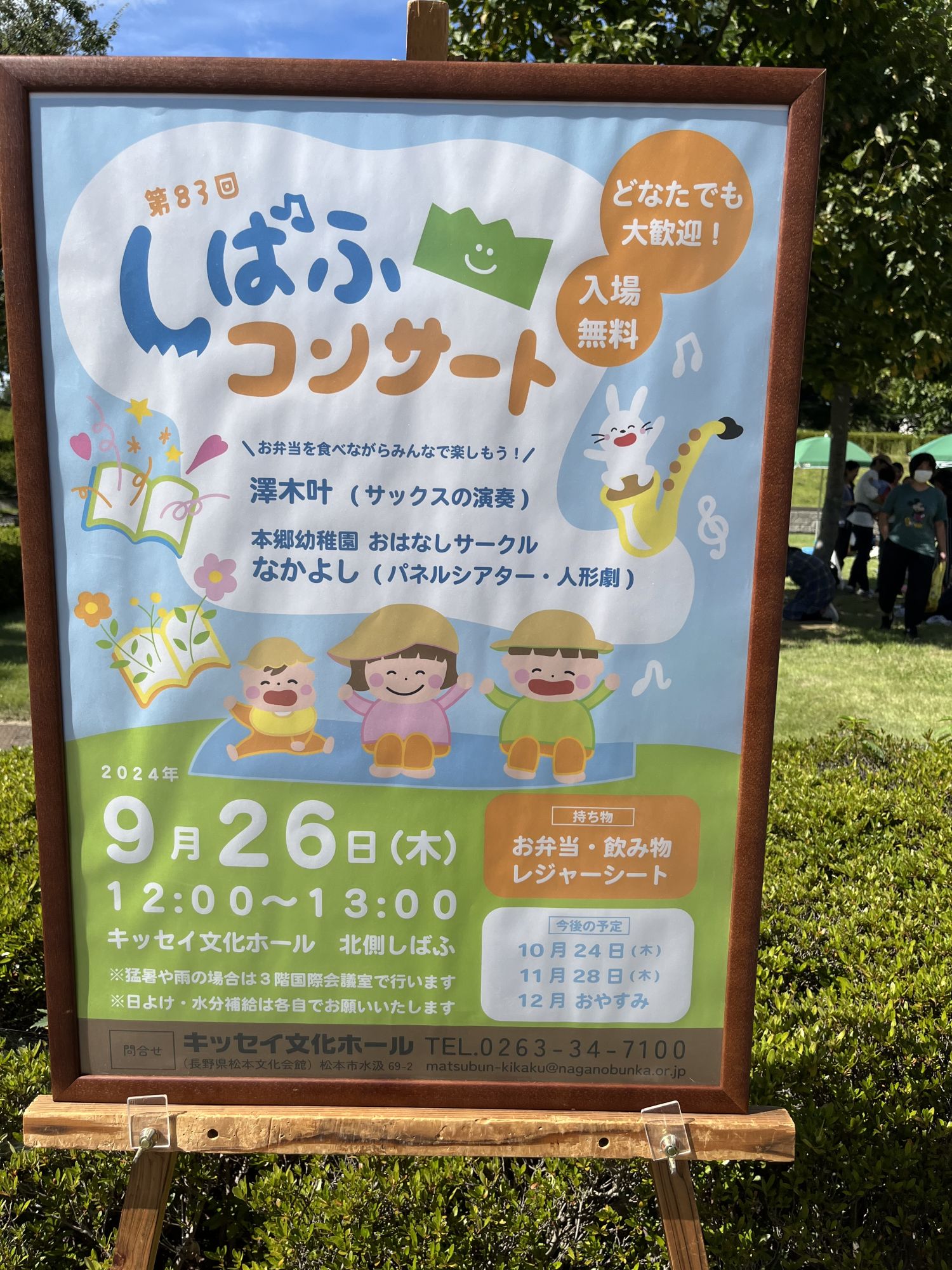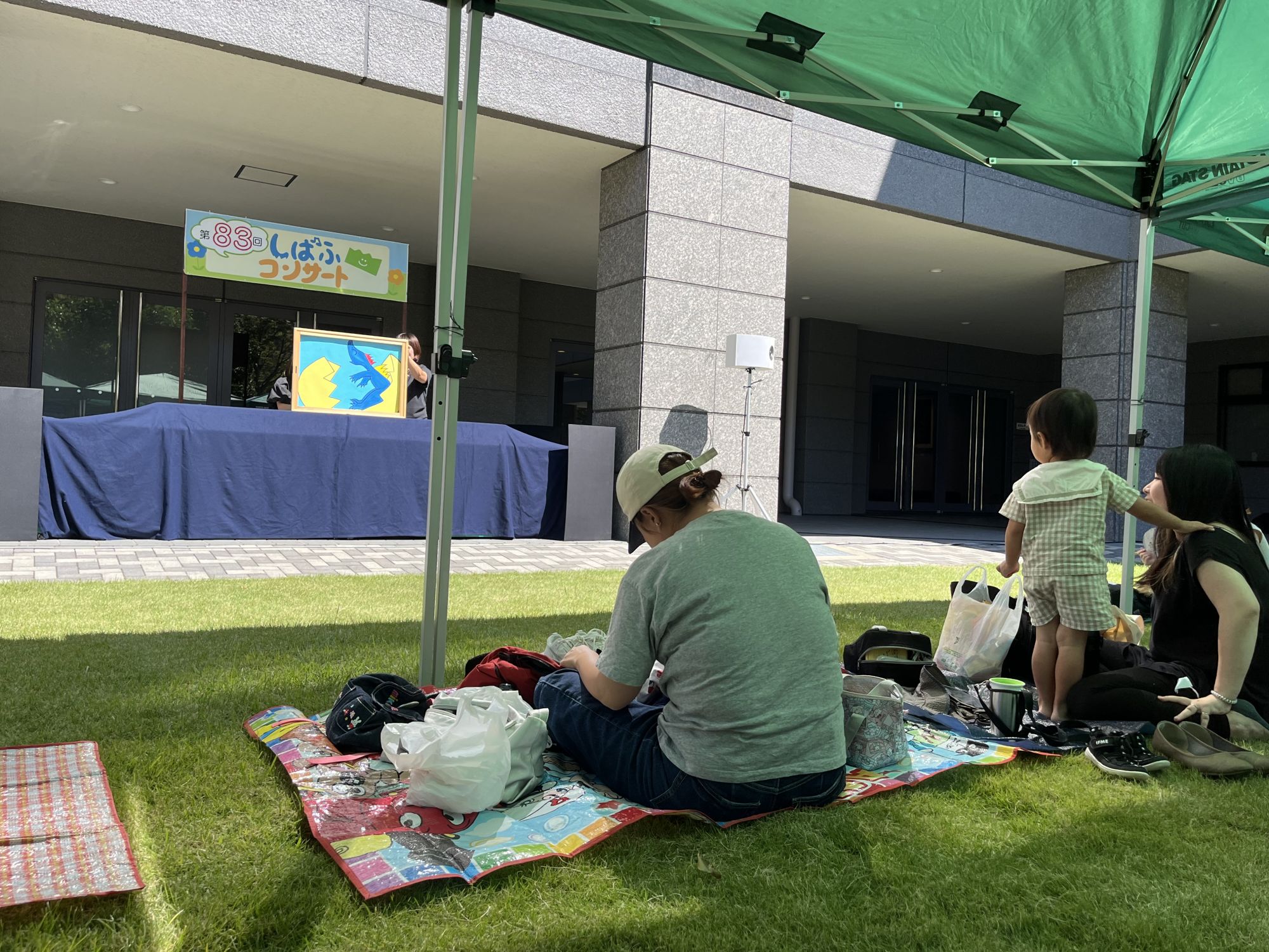 Le terme « shibafu » signifie « pelouse » et c’est en effet sur la pelouse au nord du bâtiment du Kissei Bunka Hall qu’a lieu le spectacle. Il y a assez d’espace pour que les enfants puissent se défouler librement tout en profitant du spectacle.