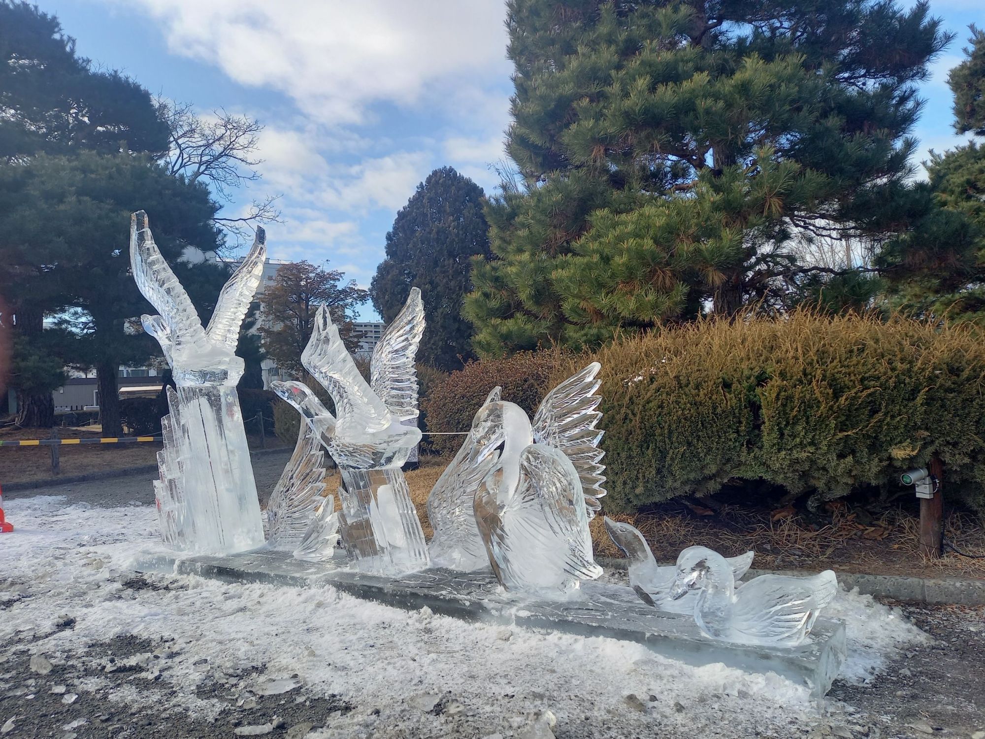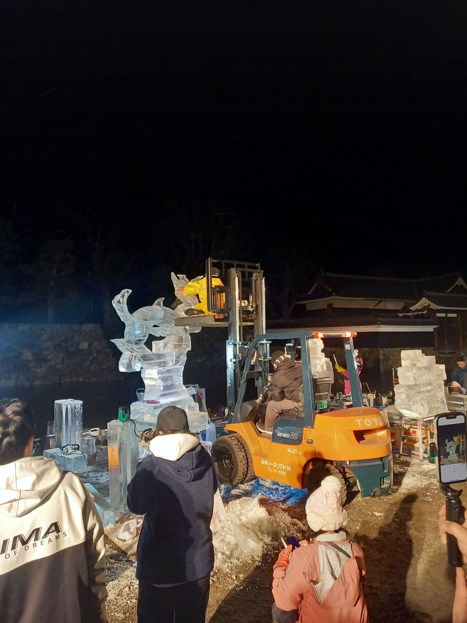 L’événement le plus attendu est évidement le grand concours de sculpture du château qui réunit des participants venus de tout le Japon. Dès l’après-midi du samedi, les équipes préparent leur materiel, et transportent leurs blocs de glace jusqu’à l’emplacement qui leur a été attribué.