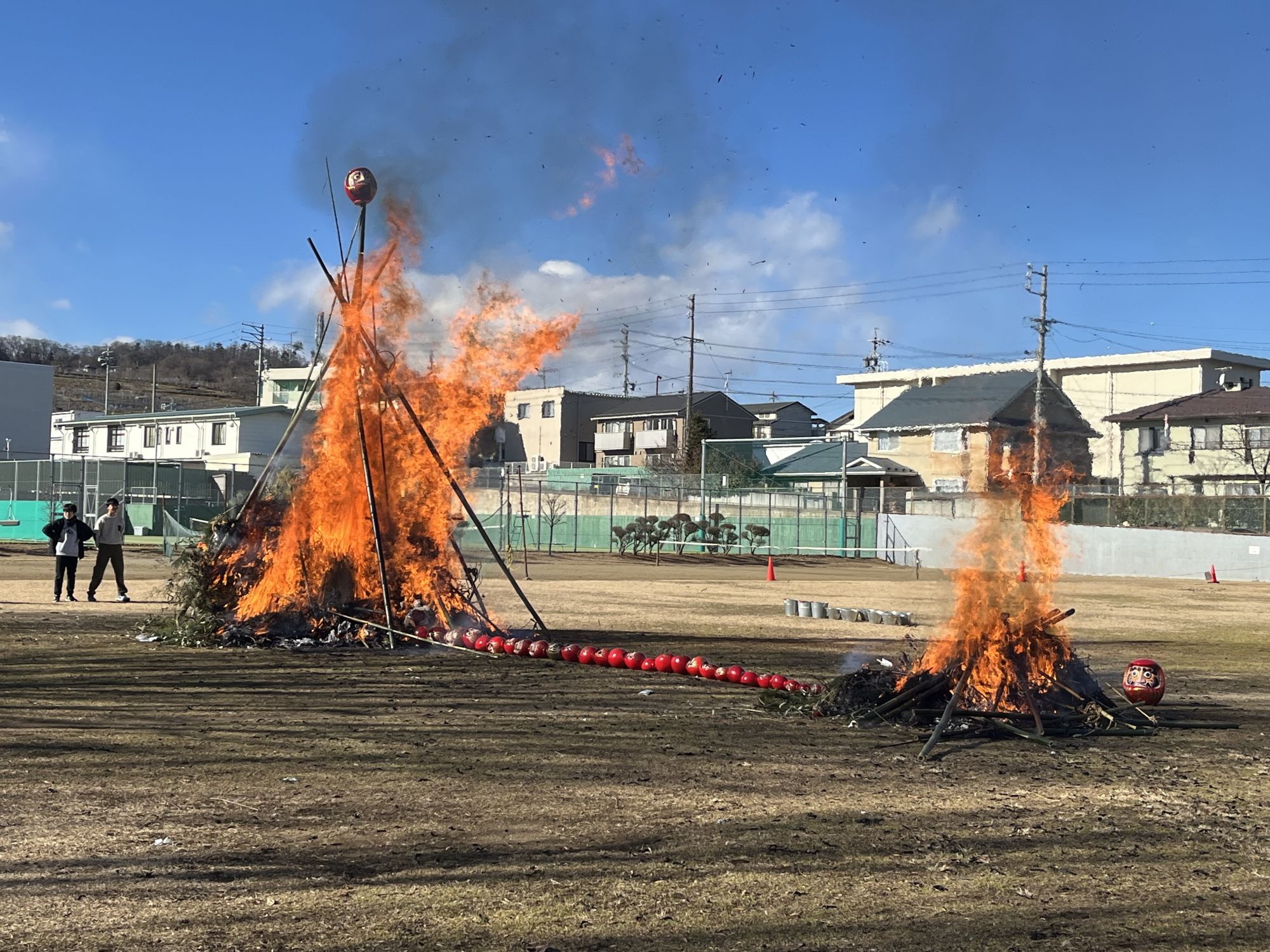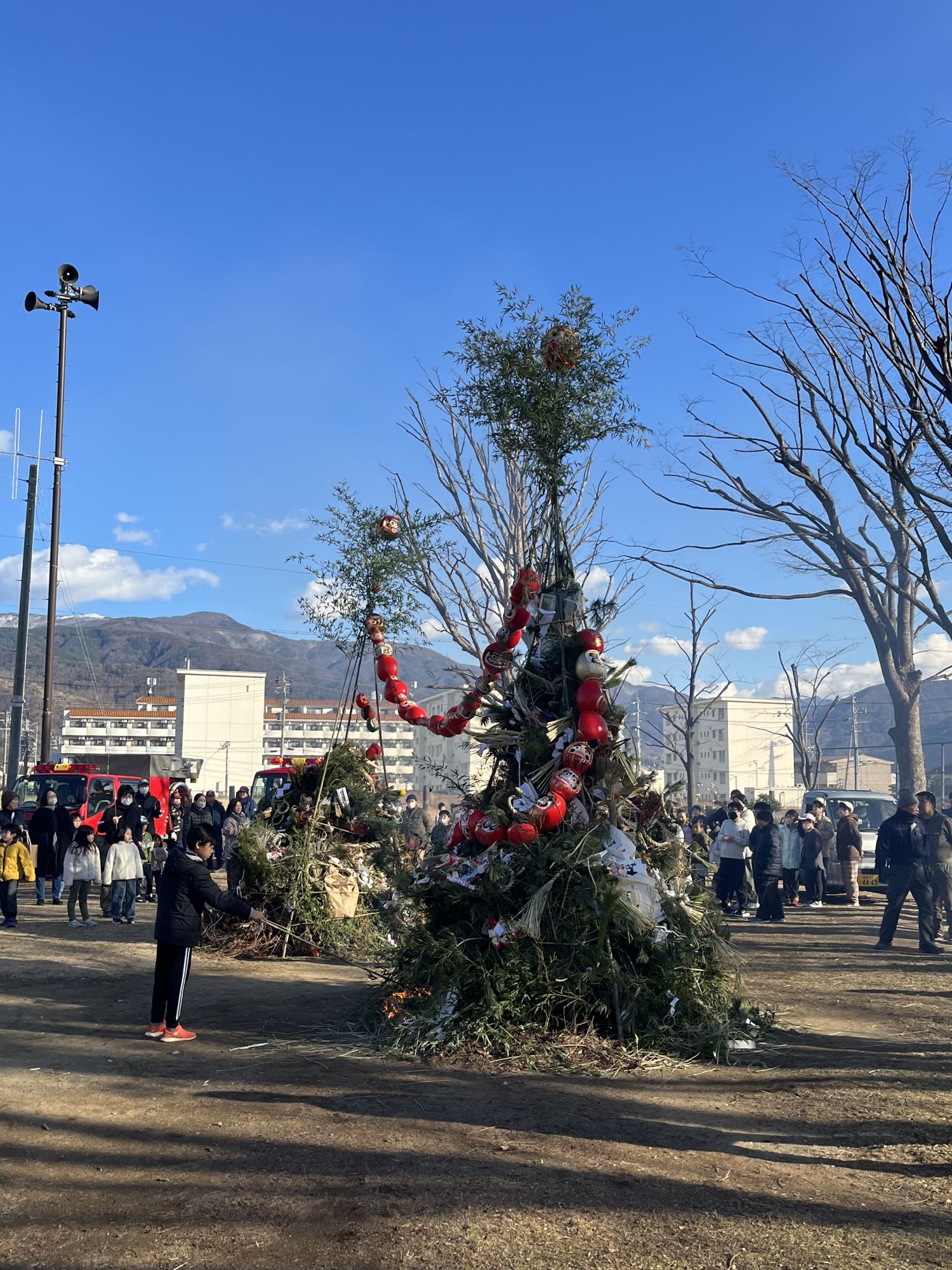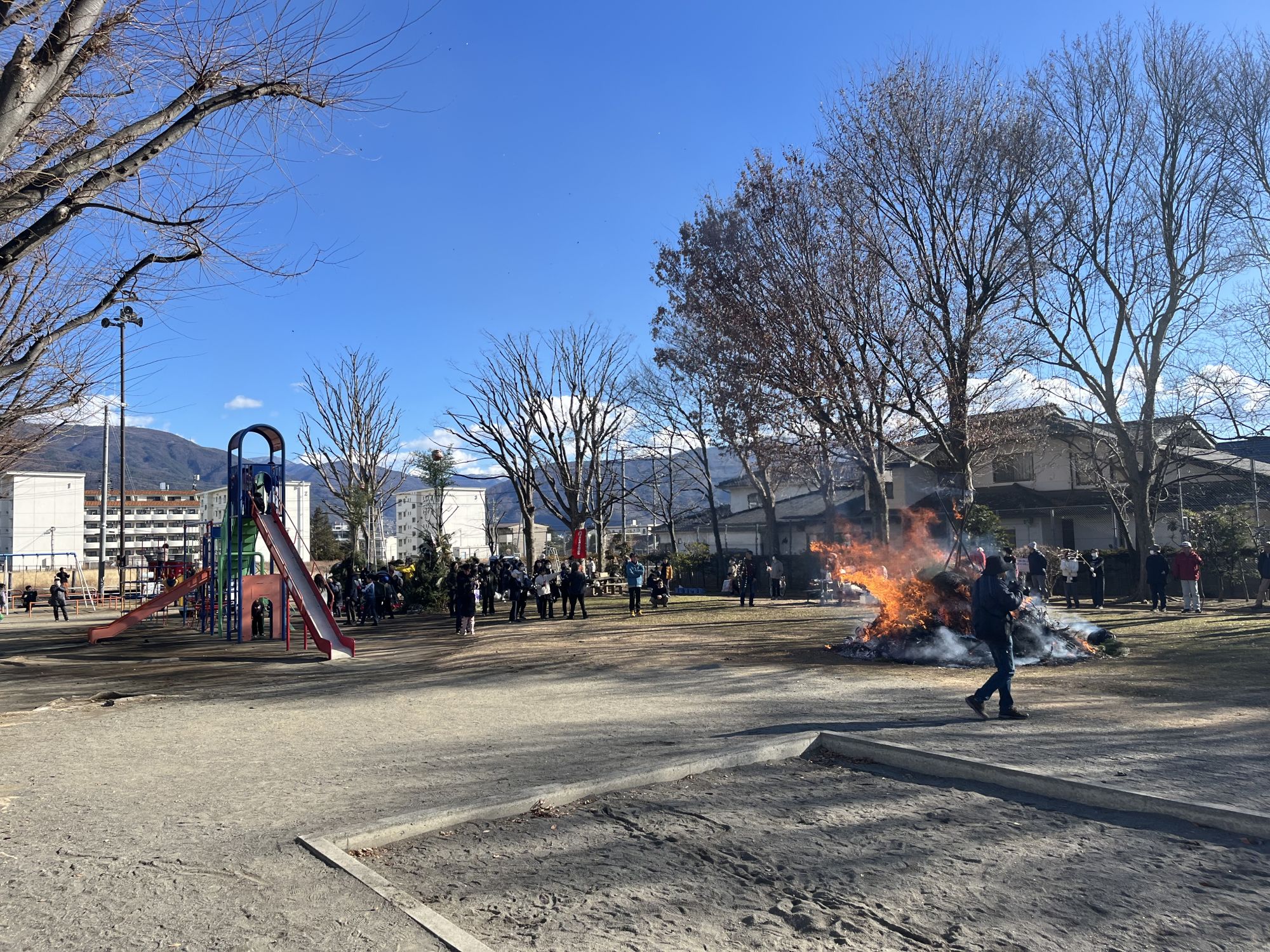 A Matsumoto, ce sont essentiellement les communautés de quartier et les associations d’élèves de primaire qui organisent le San-ku-ro dans de grands parcs (comme c’est le cas pour notre quartier : le parc accueillait les bûchers de trois quartiers différents) ou sur les berges des rivières.