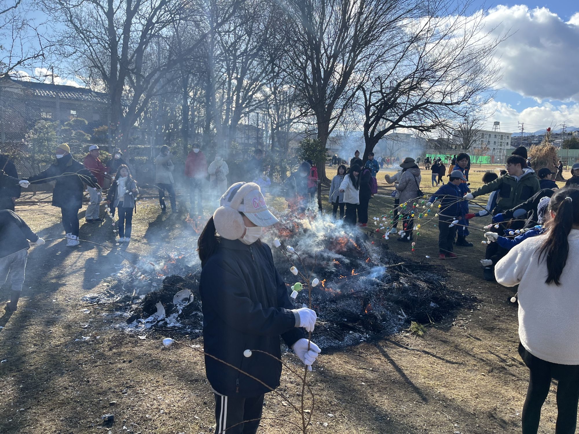 Une fois que le feu se calme, les enfants sortent leur « Mayu-dama » petite boules de mochi accrochées au bout de branches pour les faire griller au dessus des quelques flammes restantes. Certains groupes en profite aussi pour faire cuire des patates douces au milieu des braises afin de déguster de bons « yaki-imo »