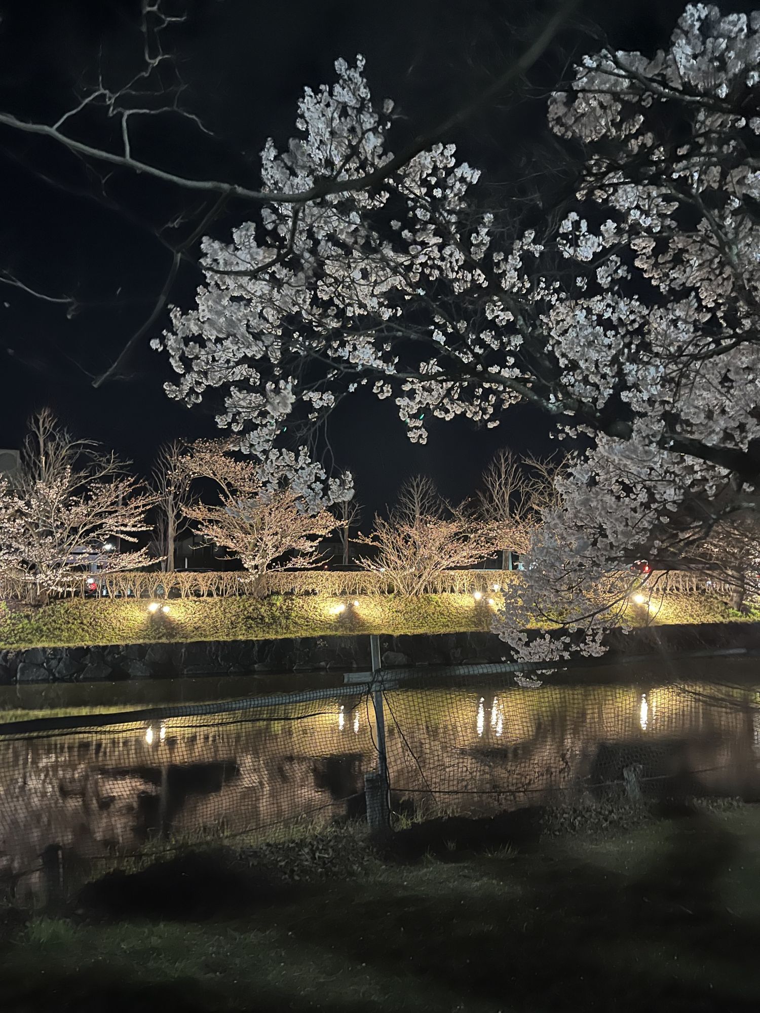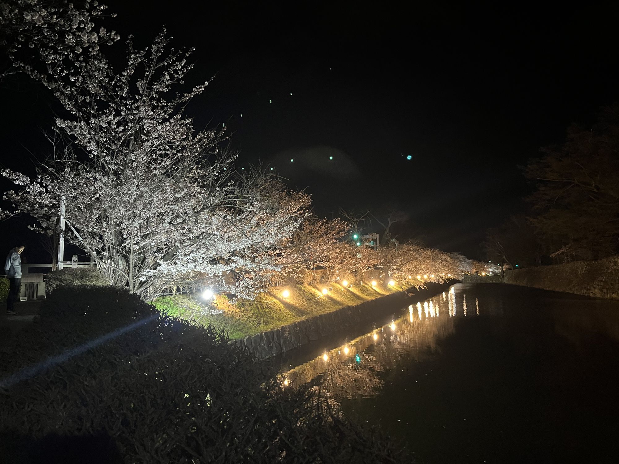 La balade ne s’arrête pas à la cour du château, mais elle se poursuit tout autour de ses douves avec des cerisiers éclairés tout le long des chemins nord et est.