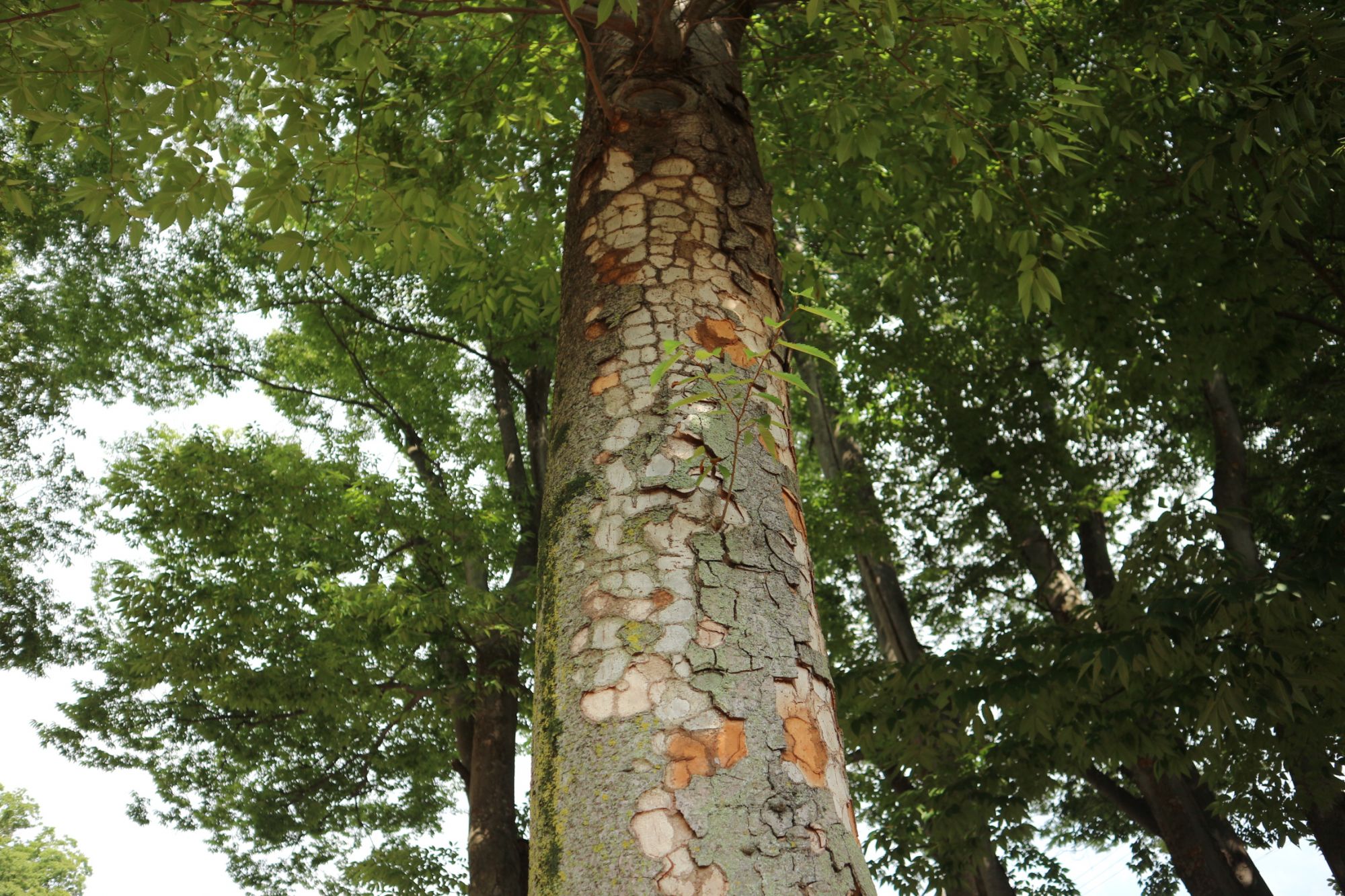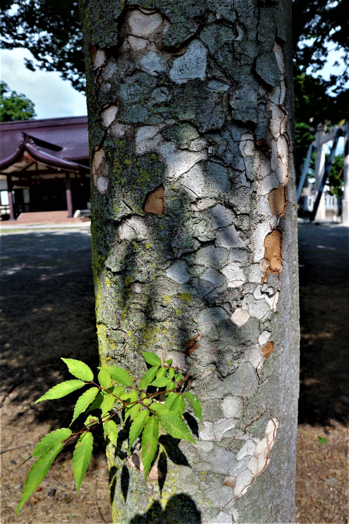 境内の木の幹が剝げていて模様がパッチワークのように可愛らしいです。