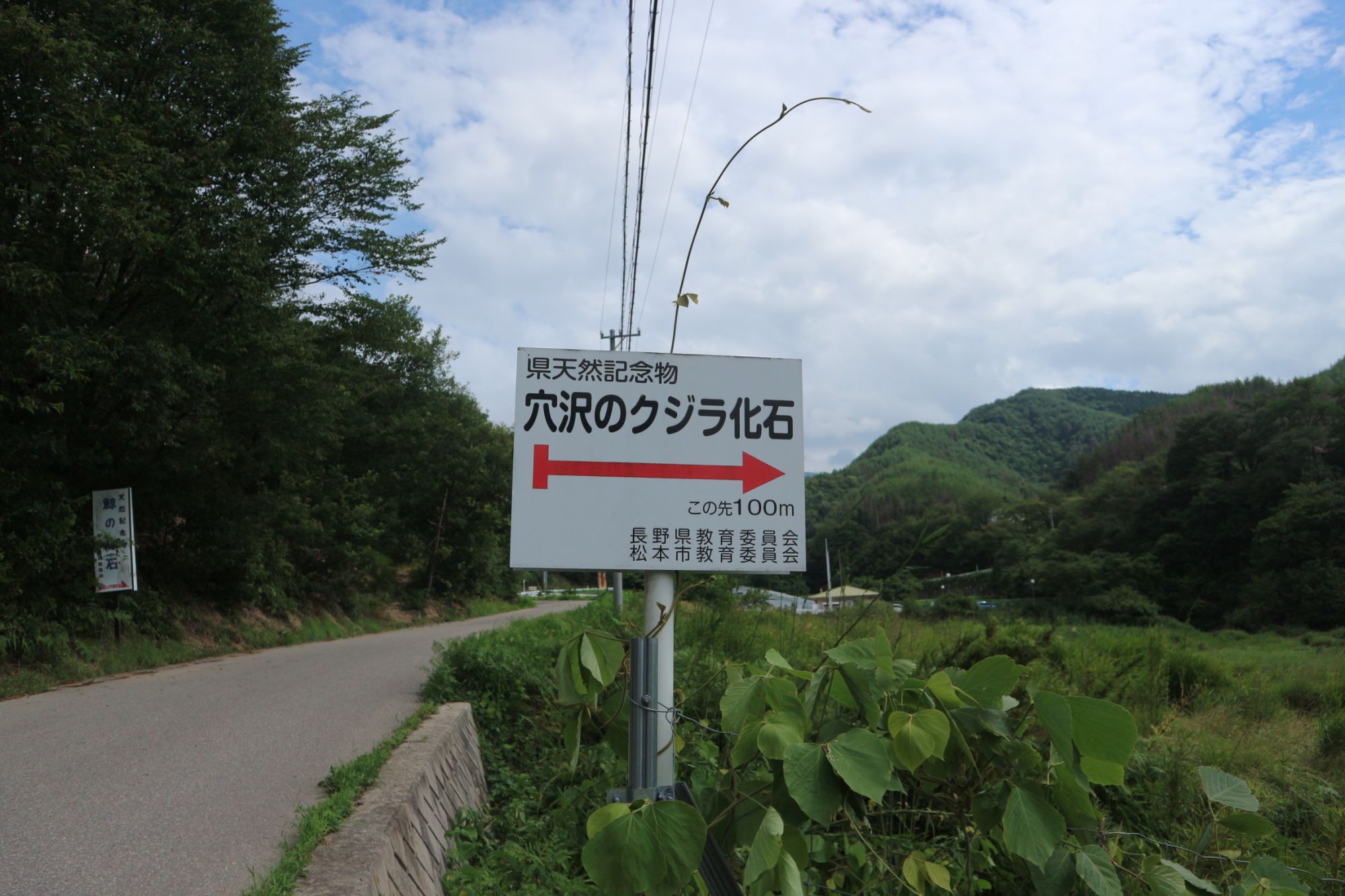 松本市街地から四賀地区の国道143号線を車で走り目印は、四賀B&G海洋センタープールの案内看板が見えたら右折します。1本道をどんどん走って行くと、「鯨の化石」の看板が見えます。駐車場はありませんので、広い路肩に車を停めます。